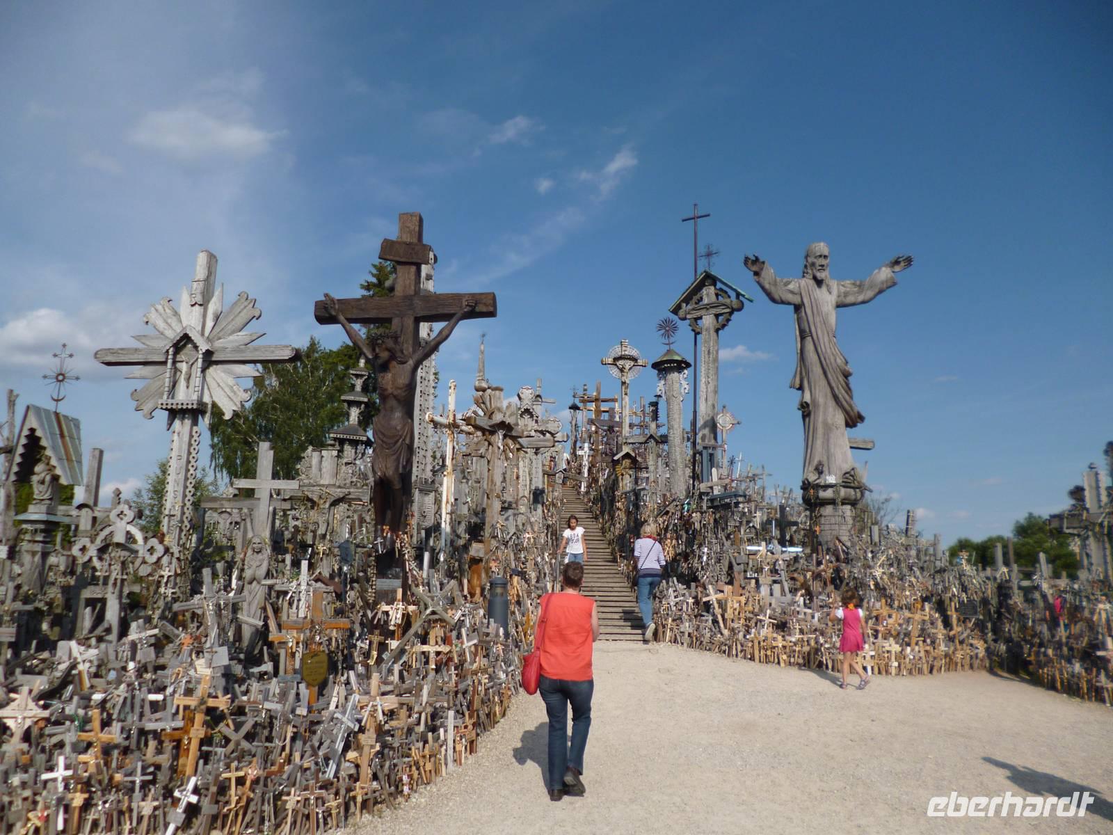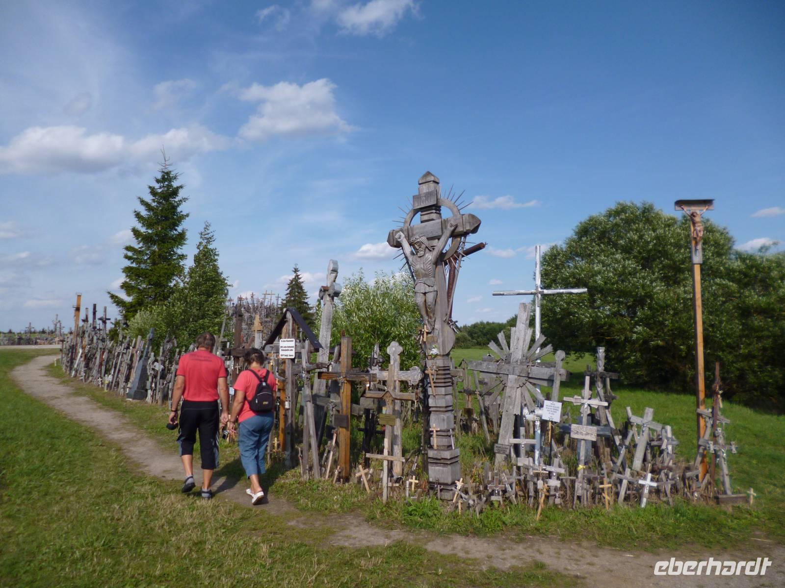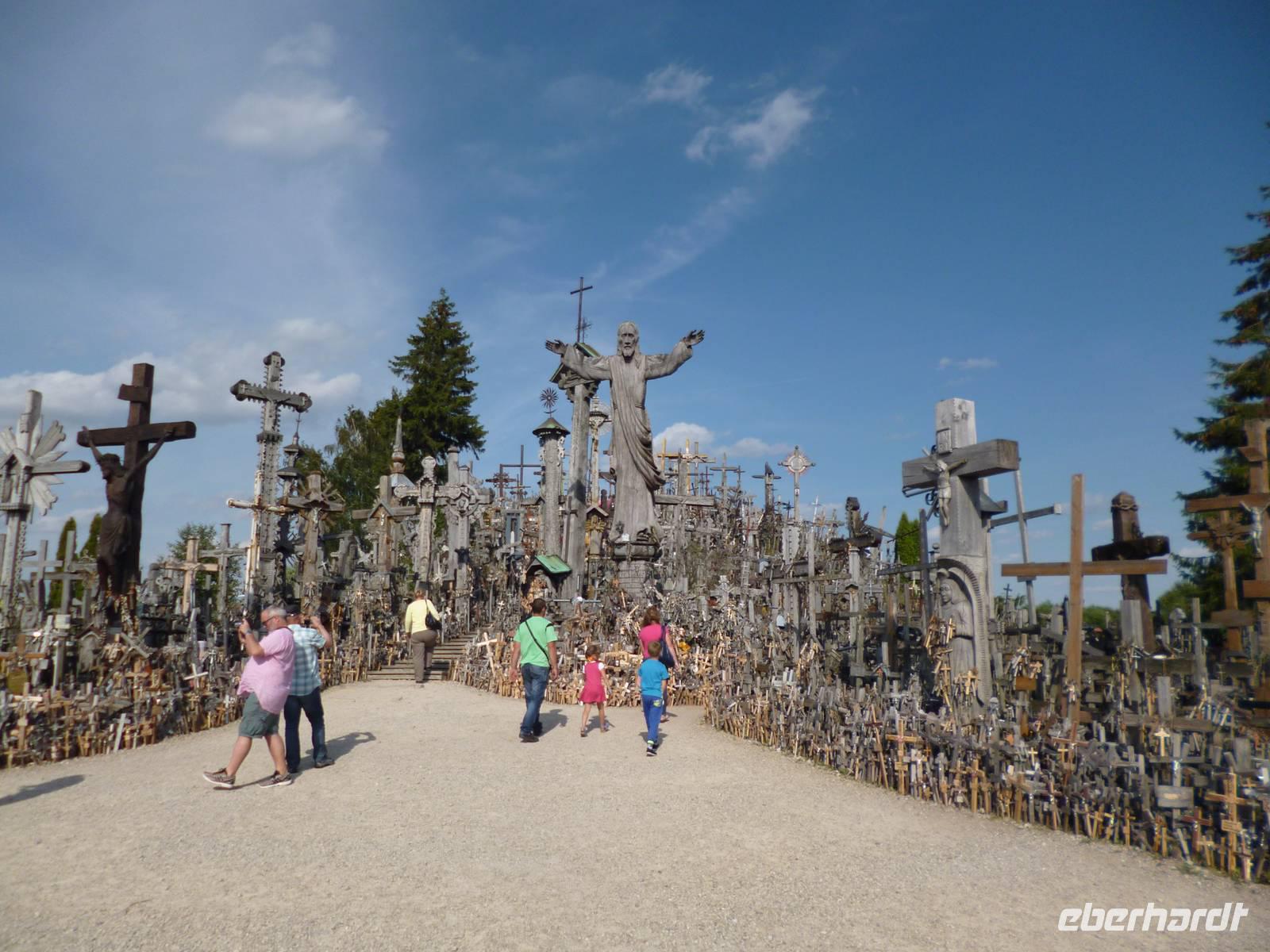 Durch pittoresk anmutenden Strandwald ging es nach Schwarzort, wo wir den Hexenberg bestiegen, auf dem örtliche Holzschnitzer etwa sechzig Riesenfiguren aus der baltischen Sagenwelt aufgestellt hatten. Am Strandparkplatz gab es Bordverpflegung, dann konnte man den kleinen Ort mit der historistischen Kirche, sowie viele alten Holzhäusern erkunden, die teilweise in typischer Bäderarchitektur gebaut sind. Zurück mit der Fähre legten wir noch einen Stadtspaziergang in Klaipeda oder Memel ein. Der Reiseleiter zeigte uns das bescheidene Domizil, in dem einst der preußische König Friedrich Wilhelm III. mit seiner Luise residierte und natürlich den berühmten Brunnen auf dem Theaterplatz, der dem Barockdichter Simon Dach und seinem angebeteten Ännchen von Tharau gewidmet ist. Weiter ging es auf der Autobahn ins Landesinnere. Die nächste Pause war bei Schaulen am berühmten Berg der Kreuze, den auch der polnische Papst besucht und ein Kreuz gestiftet hat.