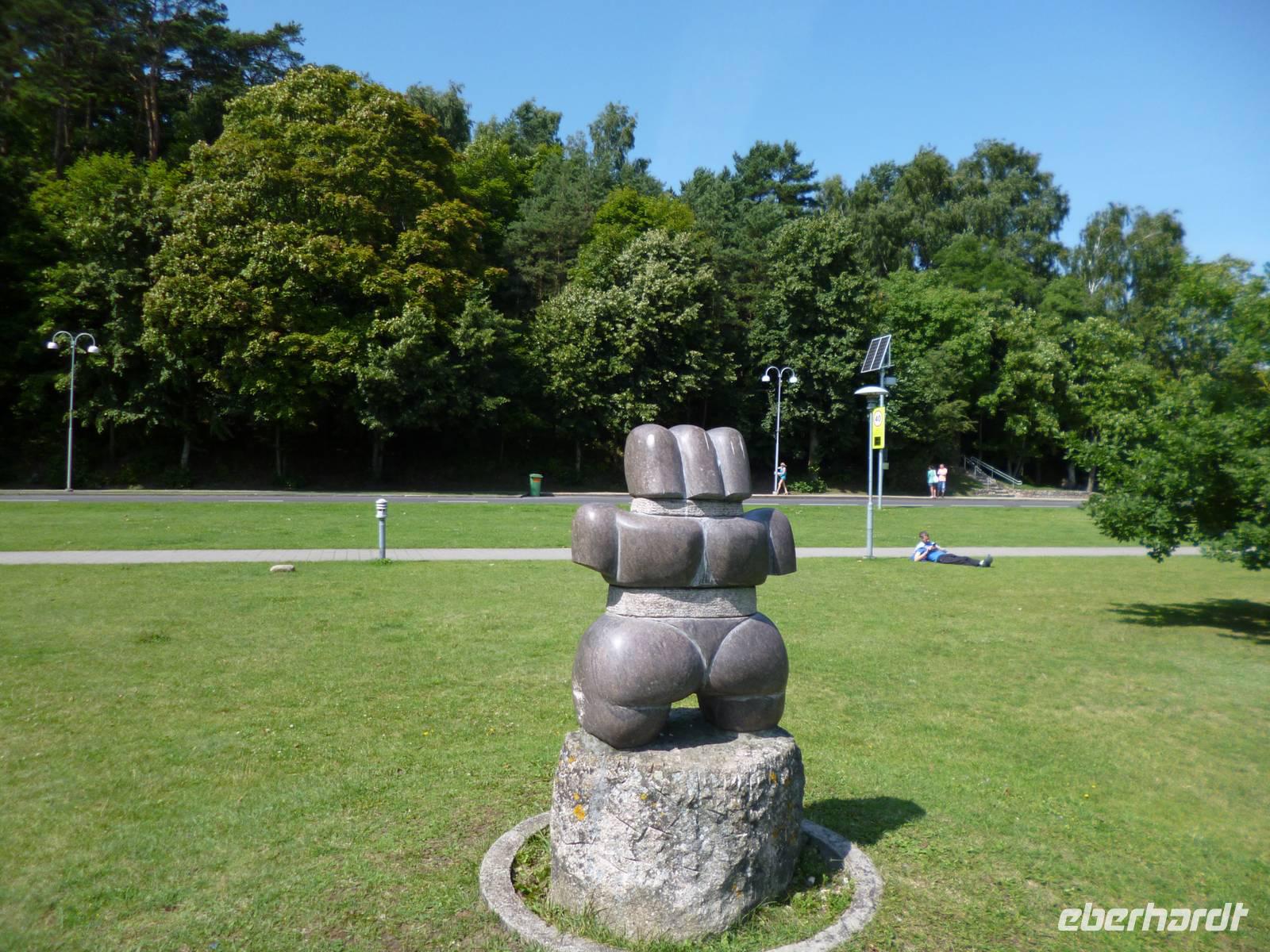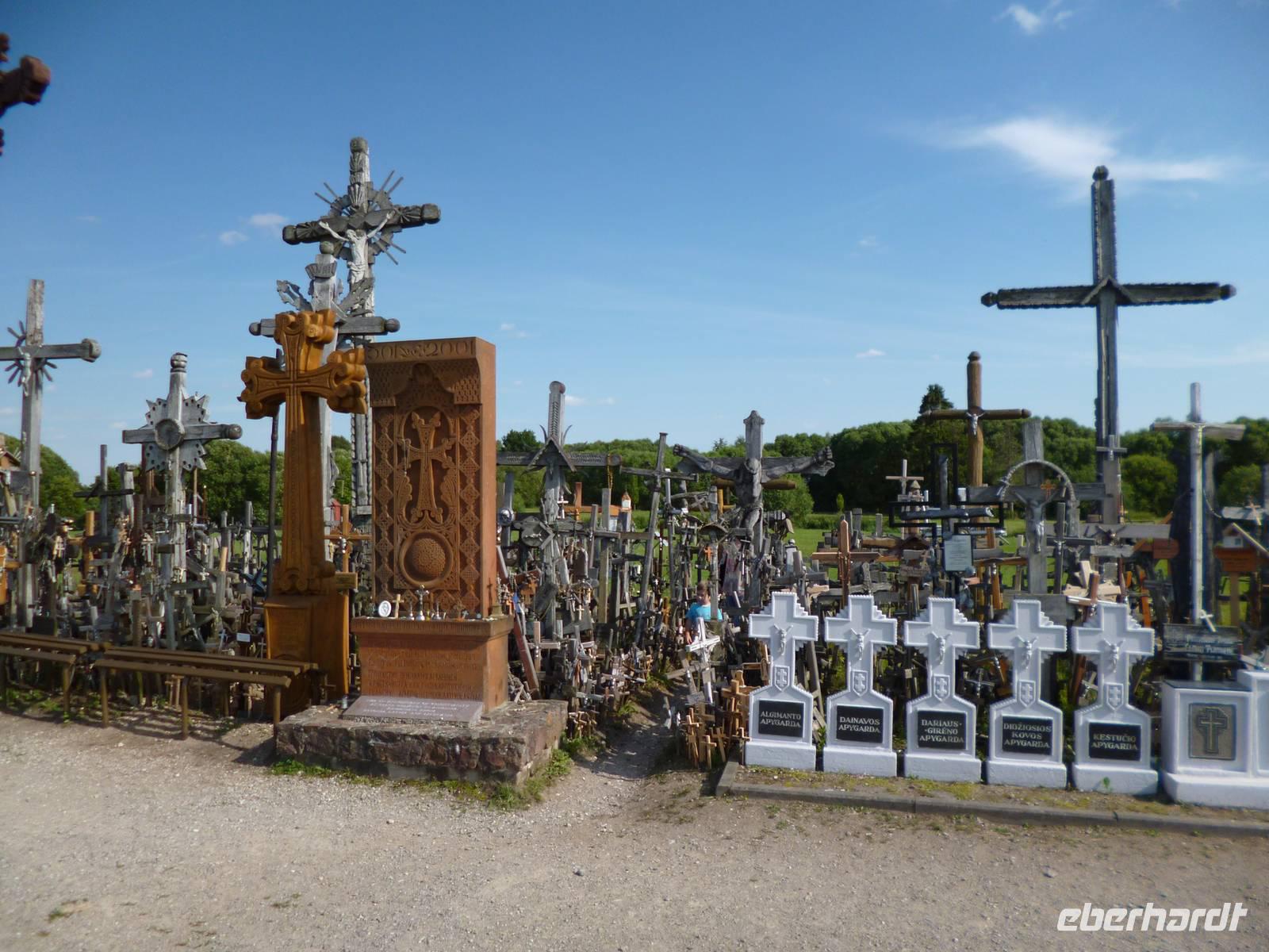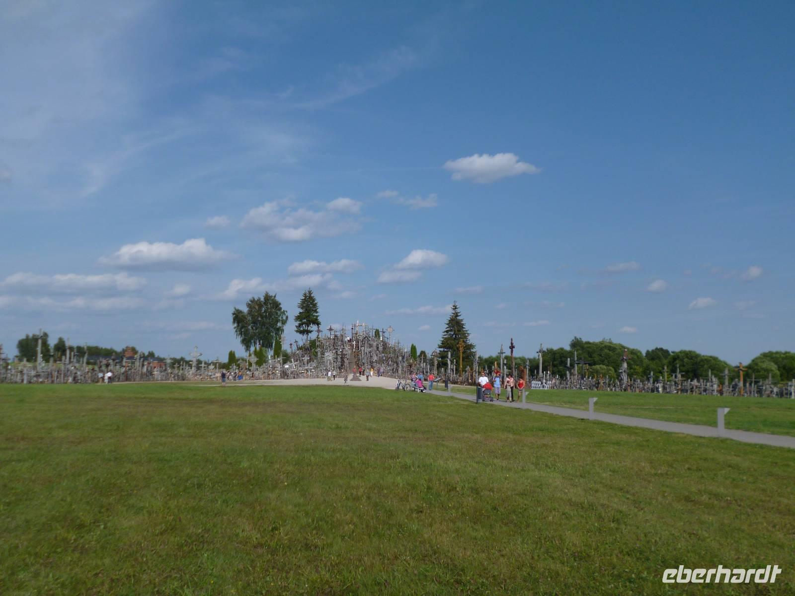 Durch pittoresk anmutenden Strandwald ging es nach Schwarzort, wo wir den Hexenberg bestiegen, auf dem örtliche Holzschnitzer etwa sechzig Riesenfiguren aus der baltischen Sagenwelt aufgestellt hatten. Am Strandparkplatz gab es Bordverpflegung, dann konnte man den kleinen Ort mit der historistischen Kirche, sowie viele alten Holzhäusern erkunden, die teilweise in typischer Bäderarchitektur gebaut sind. Zurück mit der Fähre legten wir noch einen Stadtspaziergang in Klaipeda oder Memel ein. Der Reiseleiter zeigte uns das bescheidene Domizil, in dem einst der preußische König Friedrich Wilhelm III. mit seiner Luise residierte und natürlich den berühmten Brunnen auf dem Theaterplatz, der dem Barockdichter Simon Dach und seinem angebeteten Ännchen von Tharau gewidmet ist. Weiter ging es auf der Autobahn ins Landesinnere. Die nächste Pause war bei Schaulen am berühmten Berg der Kreuze, den auch der polnische Papst besucht und ein Kreuz gestiftet hat.