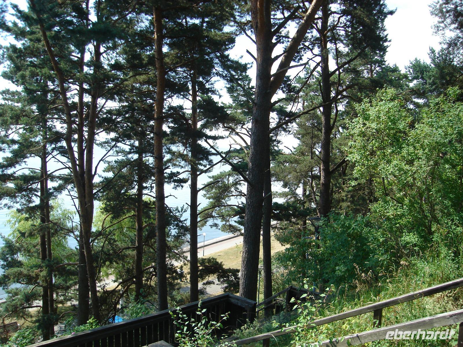 Mit der Fähre ging es in wenigen Minuten von Kleipeda hinüber nach Sandkrug [litauisch Smiltyne]. Hinter dem Ortsteil Schwarzort [litauisch Joudkrante] sah man die Folgen des Aufenthalts der sich hier massiv vermehrenden Kormorane und Reiher: abgestorbene Bäume. Da diese Vögel den Fischern den Fisch wegfuttern, versuchen diese, die großen Vögel mit Lärm zu vertreiben, mit mäßigem Erfolg, wie man sieht. Bald waren wir auch in Nidden [litauisch Nida]. Zuerst fuhren wir auf die Hohe Düne, die zweithöchste Düne Europas. Mit dem Wetter hatten wir Glück: eine gute Sicht auf die Dünenwellen hinüber auf den russischen Teil der Kurischen Nehrung, nach Osten auf das Haff und nach Westen auf die Ostsee.