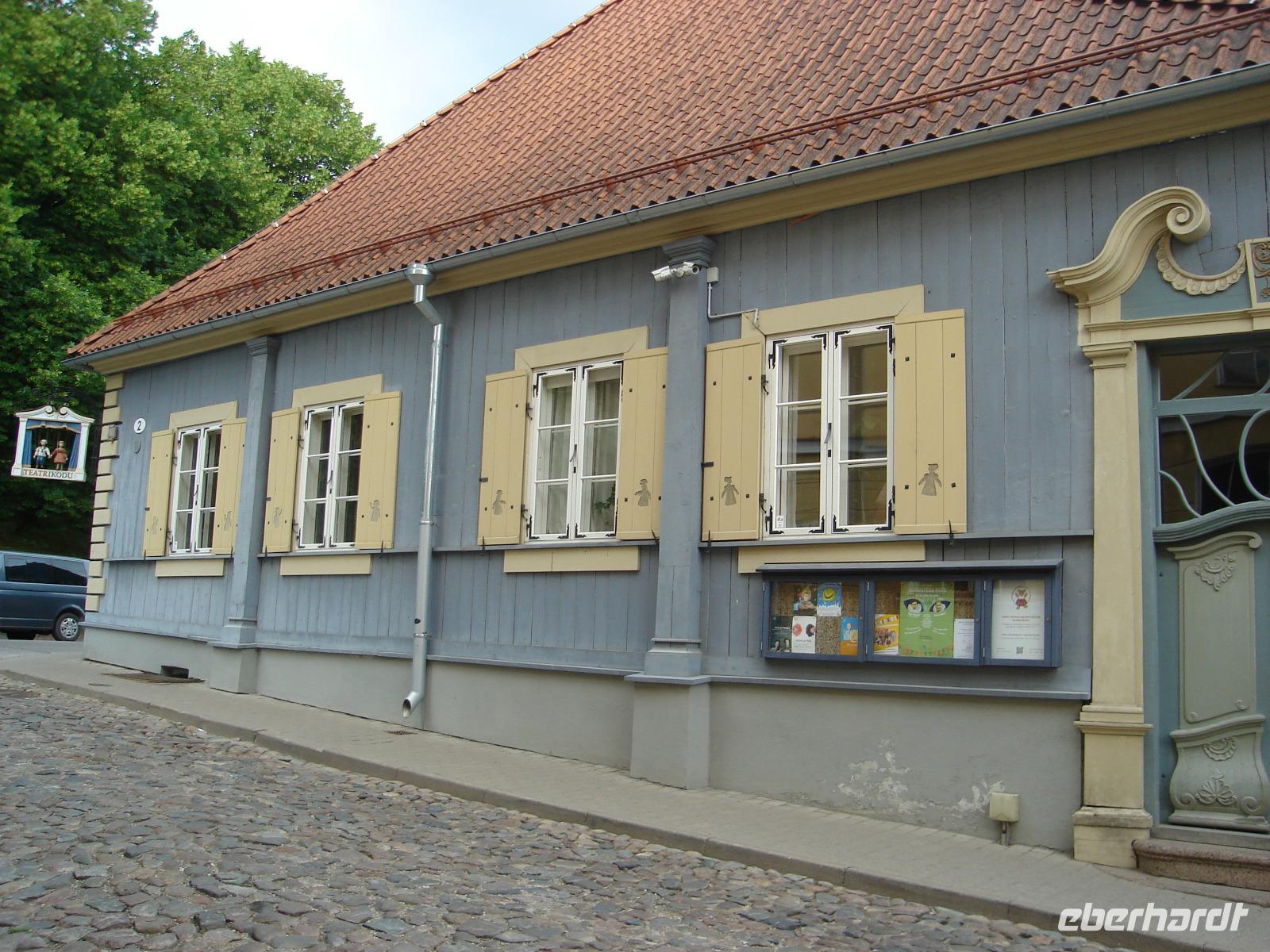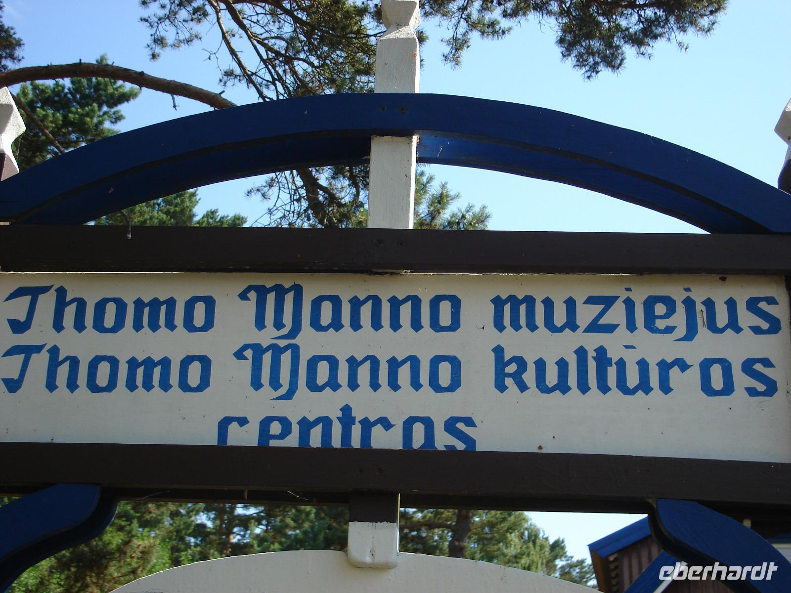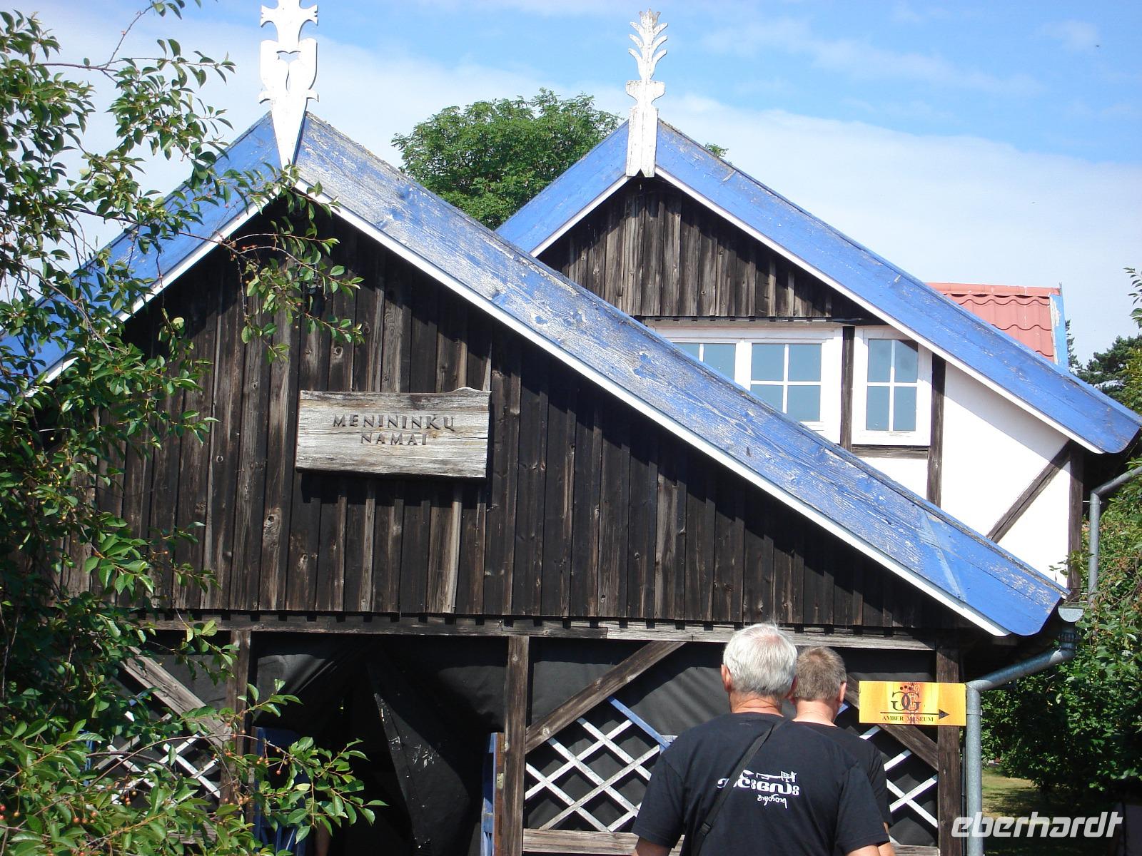 Weiter ging es zum Thomas-Mann-Haus, gebaut in den typischen Niddener Farben. Es liegt etwas außerhalb von Nidden auf dem sogenannten Schwiegermutterberg. Heute ist dort das Thomas-Mann-Kulturzentrum, in dem sich auch ein Museum über Thomas Mann und seine Aufenthalte hier am Haff befindet. Der Schriftsteller ließ das Haus nach einem Besuch auf der Nehrung im Jahre 1929 für sich und seine Familie als Urlaubsquartier bauen. Anschließend unternahmen wir noch einen Spaziergang durch den Ort Nidden: Hier sahen wir auch die typischen Kurenhäuser mit den Kurenwimpeln, an denen man in der Vergangenheit etwas über die Geschichte und Größe der Familie eines jeden Fischers erfahren konnte. Und überall lockten Stände mit Bernsteinerzeugnissen, die uns von nun an auf unserer Rundreise begleiten sollten.