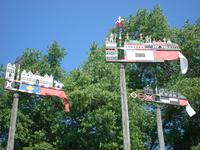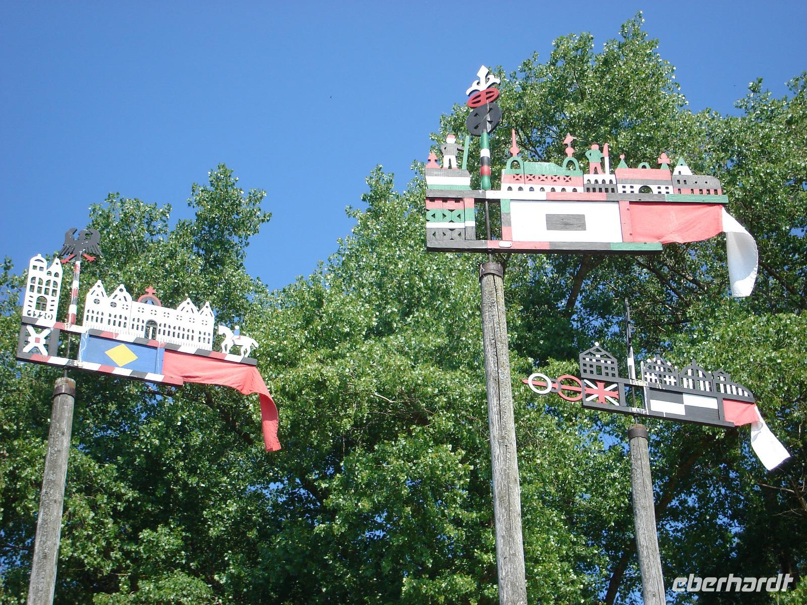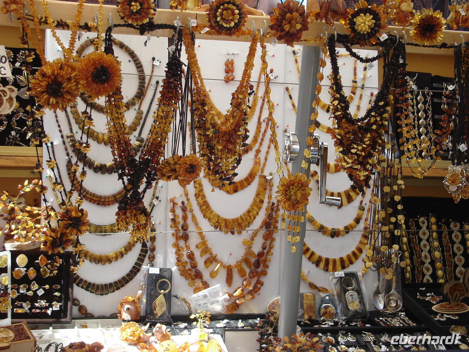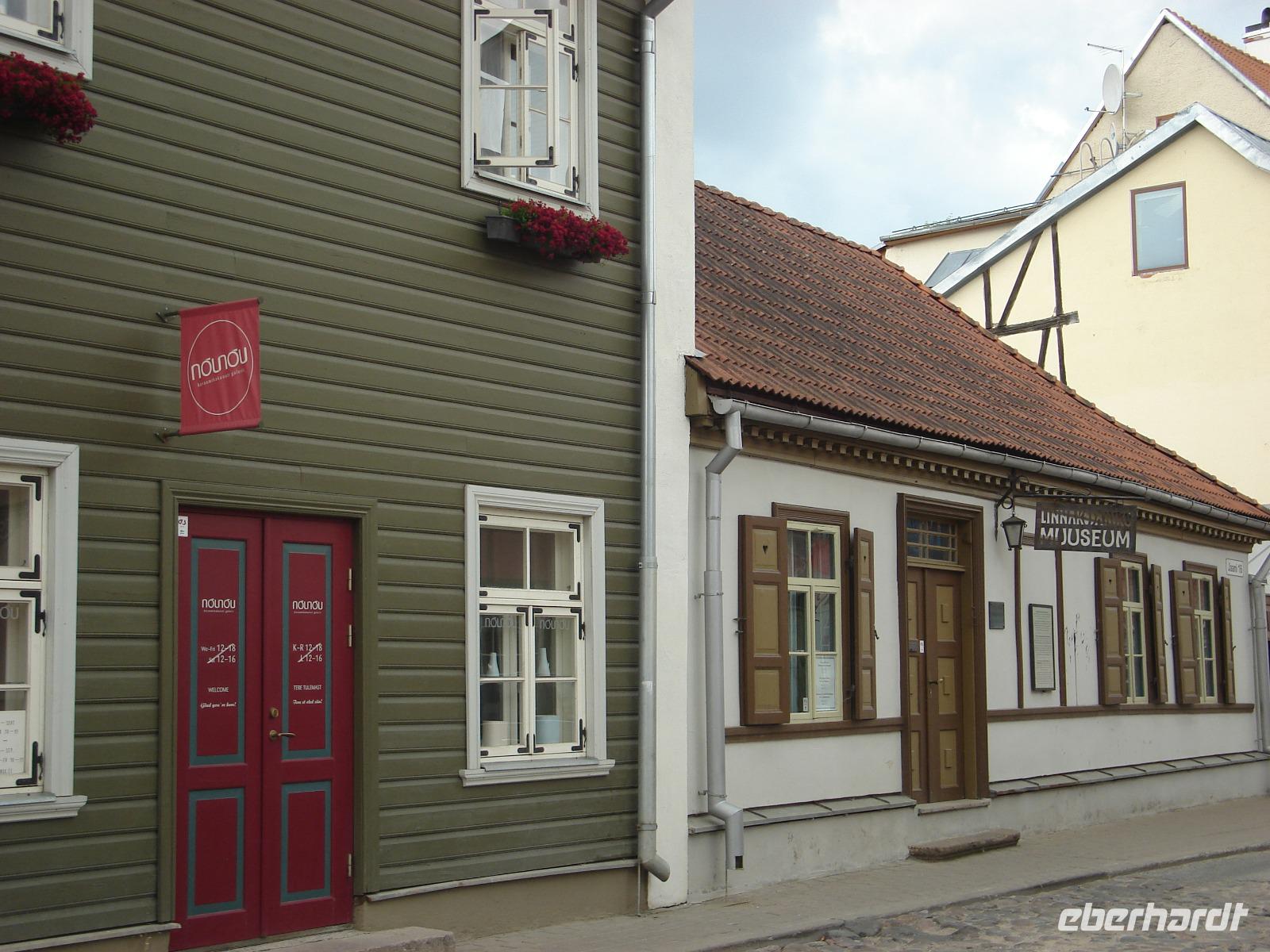 Weiter ging es zum Thomas-Mann-Haus, gebaut in den typischen Niddener Farben. Es liegt etwas außerhalb von Nidden auf dem sogenannten Schwiegermutterberg. Heute ist dort das Thomas-Mann-Kulturzentrum, in dem sich auch ein Museum über Thomas Mann und seine Aufenthalte hier am Haff befindet. Der Schriftsteller ließ das Haus nach einem Besuch auf der Nehrung im Jahre 1929 für sich und seine Familie als Urlaubsquartier bauen. Anschließend unternahmen wir noch einen Spaziergang durch den Ort Nidden: Hier sahen wir auch die typischen Kurenhäuser mit den Kurenwimpeln, an denen man in der Vergangenheit etwas über die Geschichte und Größe der Familie eines jeden Fischers erfahren konnte. Und überall lockten Stände mit Bernsteinerzeugnissen, die uns von nun an auf unserer Rundreise begleiten sollten.