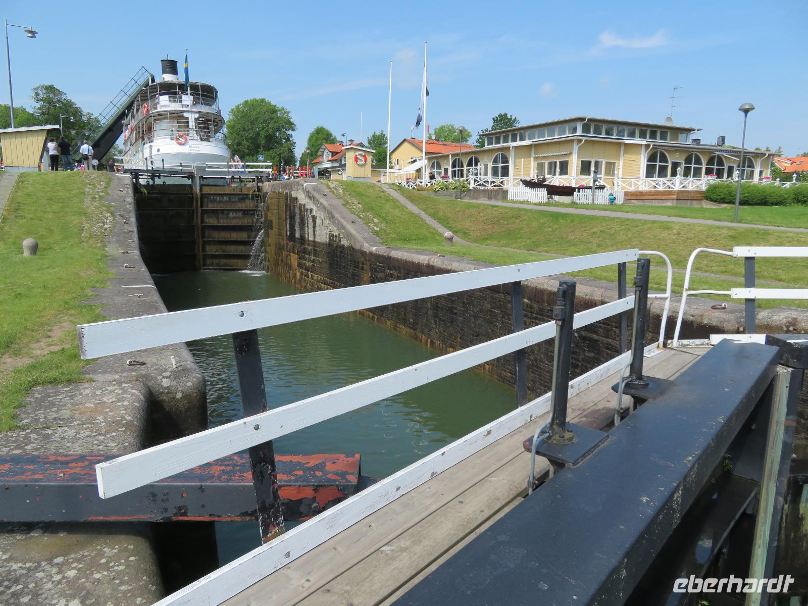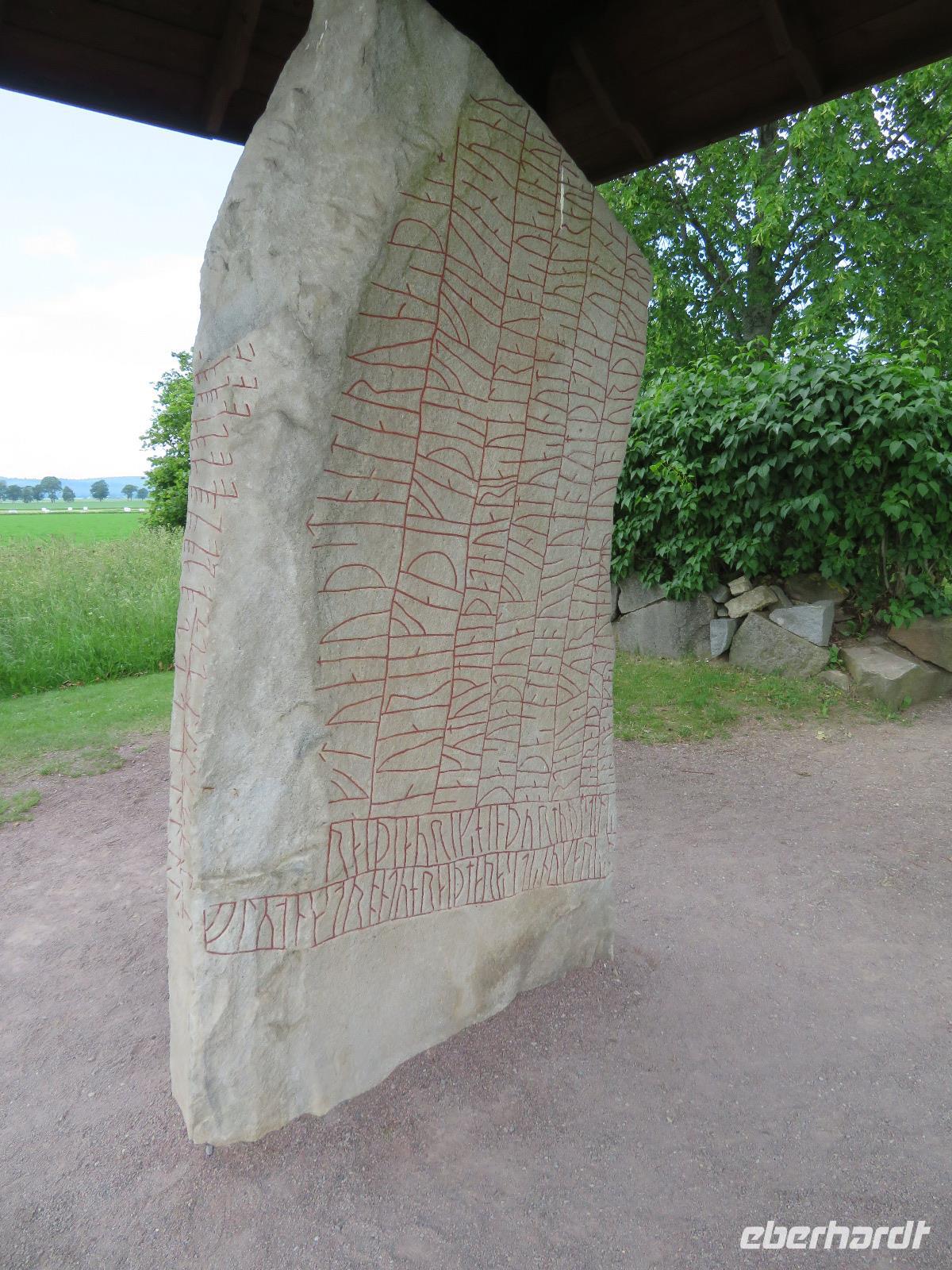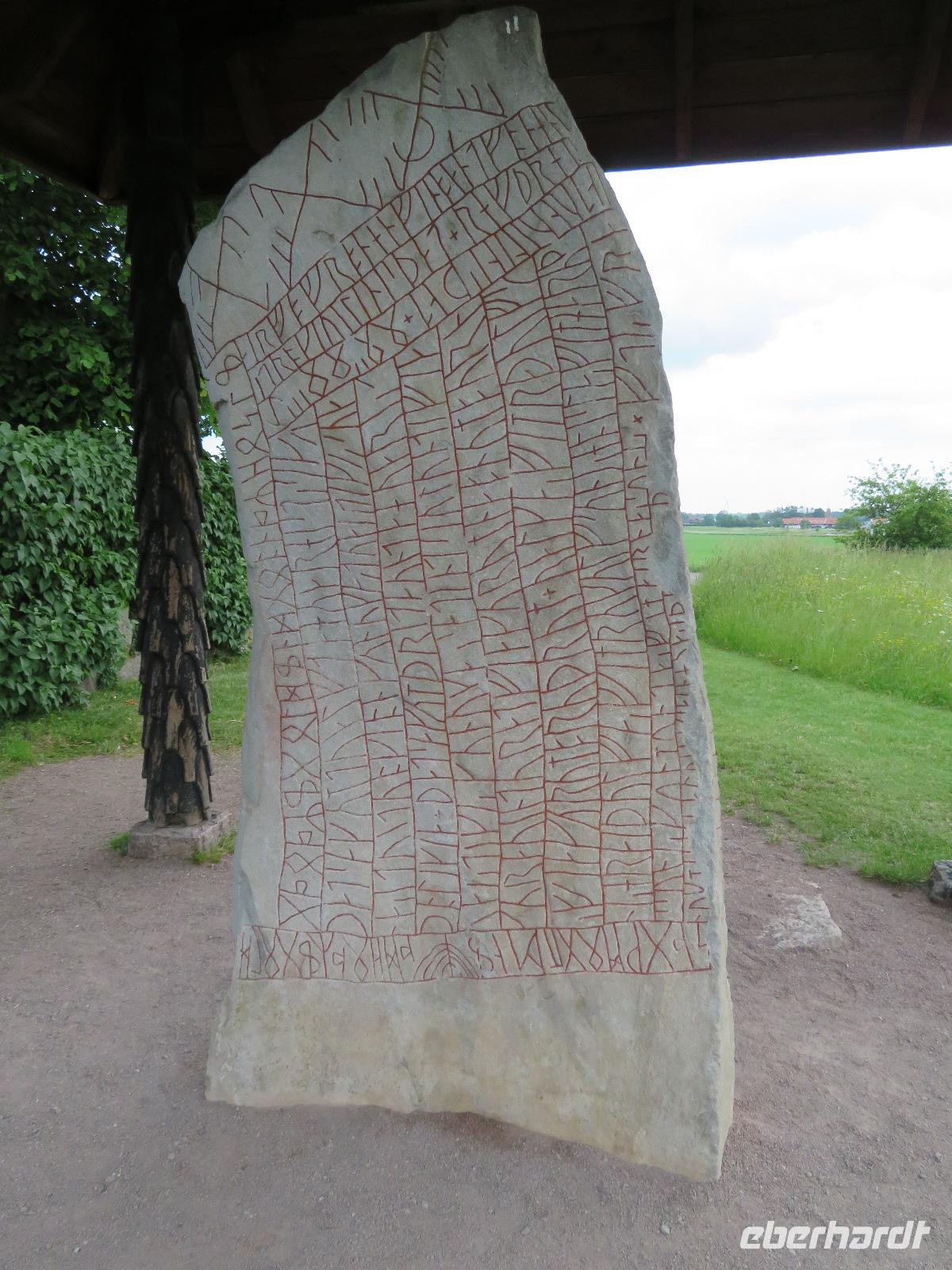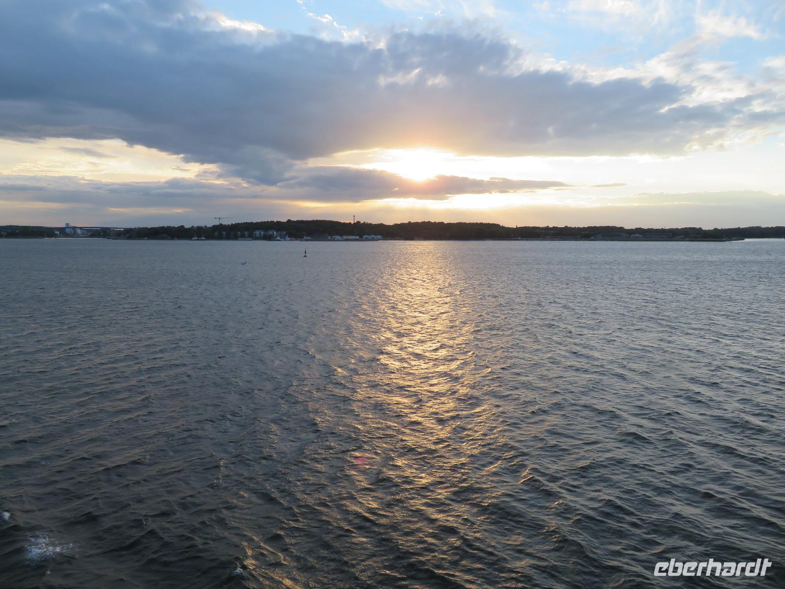 Bei Sonne verließen wir Stockholm und fuhren durch Zentralschweden Richtung Göteborg. Für diese Fahrt gibt es zwei gleichlange Verbindungen: über die A4 oder die A20. Wir entschieden uns für die südliche Variante, die A4. Bereits am späten Vormittag konnten wir in Berg am Götekanal pausieren uns gar zwei Schiffe beim Schleusen beobachten. Nach dieser großzügigen Pause beschäftigten wir uns bei Ödeshög mit Runensteinen. Einst eingemauert in ein Zehntenhaus, später die Ortskirche, steht einer der größten Runensteine Schwedens mit einer Höhe von 3,82 Meter hier und berichtet wohl von Vämod, dem toten Sohn von Varin: der Runenstein von Rök. Zurück auf der Europastraße stoppten wir am Bradehus mit bestem Blick auf den Vätternsee, dem zweitgrößten See Schwedens und fünftgrößten Europas. Durch diese Stopps wurde die 470 Kilometer lange Busstrecke mannigfaltig und auch fotografisch interessant. Wir erreichten den Göteborger Hafen noch vor Fünf Uhr und waren dreißig Minuten später schon in den Kabinen an Bord. Um 18 Uhr fanden wir uns zum wieder reichhaltigen Büffet auf dem Schiff ein. An diesem Abend wechselten die Blicke zwischen schwedisch-dänischer Küstenlandschaft des Belt und den Köstlichkeiten des Büffets.
