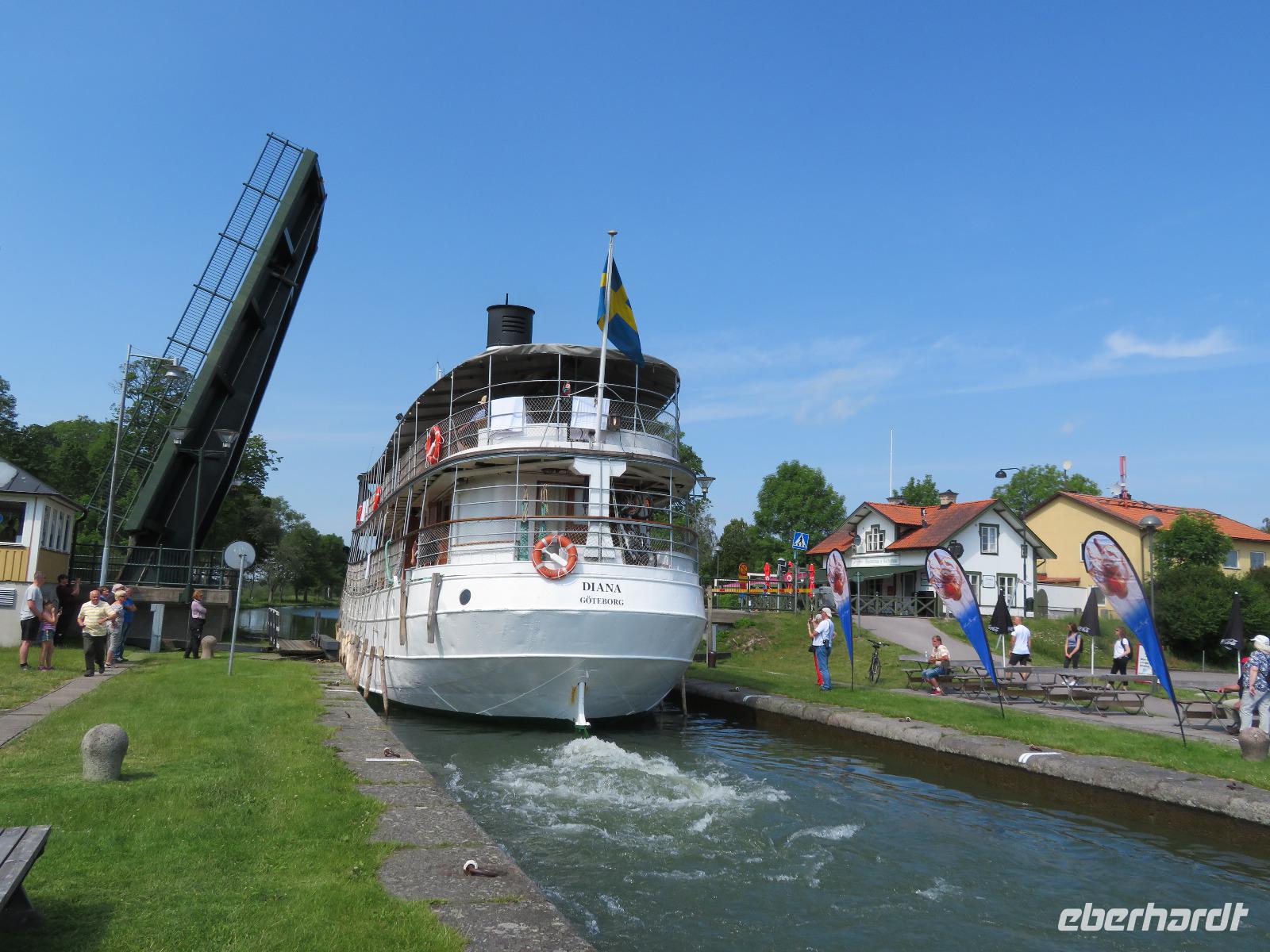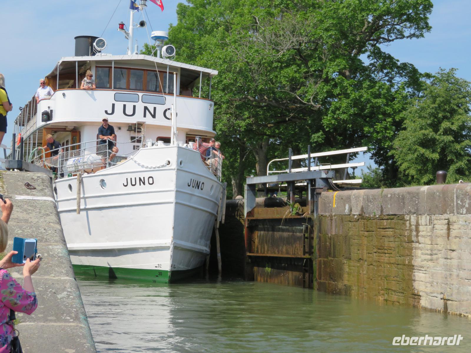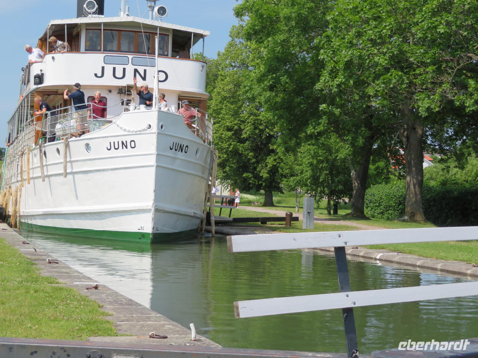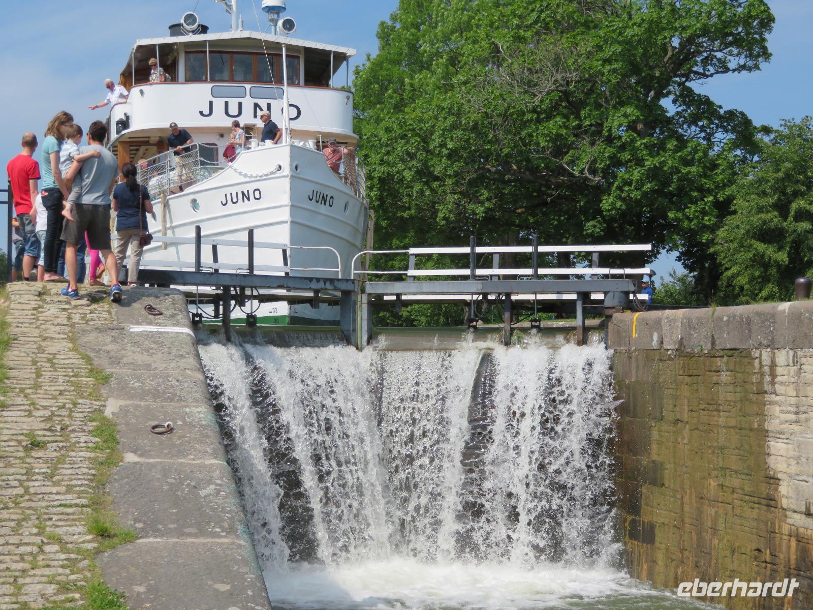 Bei Sonne verließen wir Stockholm und fuhren durch Zentralschweden Richtung Göteborg. Für diese Fahrt gibt es zwei gleichlange Verbindungen: über die A4 oder die A20. Wir entschieden uns für die südliche Variante, die A4. Bereits am späten Vormittag konnten wir in Berg am Götekanal pausieren uns gar zwei Schiffe beim Schleusen beobachten. Nach dieser großzügigen Pause beschäftigten wir uns bei Ödeshög mit Runensteinen. Einst eingemauert in ein Zehntenhaus, später die Ortskirche, steht einer der größten Runensteine Schwedens mit einer Höhe von 3,82 Meter hier und berichtet wohl von Vämod, dem toten Sohn von Varin: der Runenstein von Rök. Zurück auf der Europastraße stoppten wir am Bradehus mit bestem Blick auf den Vätternsee, dem zweitgrößten See Schwedens und fünftgrößten Europas. Durch diese Stopps wurde die 470 Kilometer lange Busstrecke mannigfaltig und auch fotografisch interessant. Wir erreichten den Göteborger Hafen noch vor Fünf Uhr und waren dreißig Minuten später schon in den Kabinen an Bord. Um 18 Uhr fanden wir uns zum wieder reichhaltigen Büffet auf dem Schiff ein. An diesem Abend wechselten die Blicke zwischen schwedisch-dänischer Küstenlandschaft des Belt und den Köstlichkeiten des Büffets.
