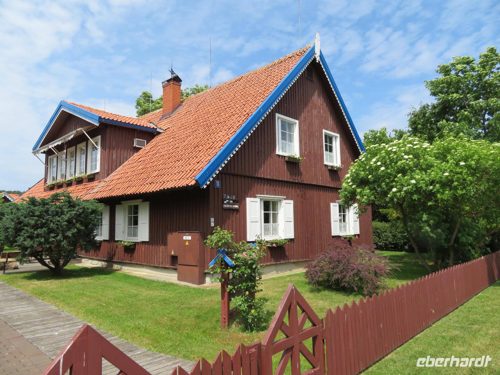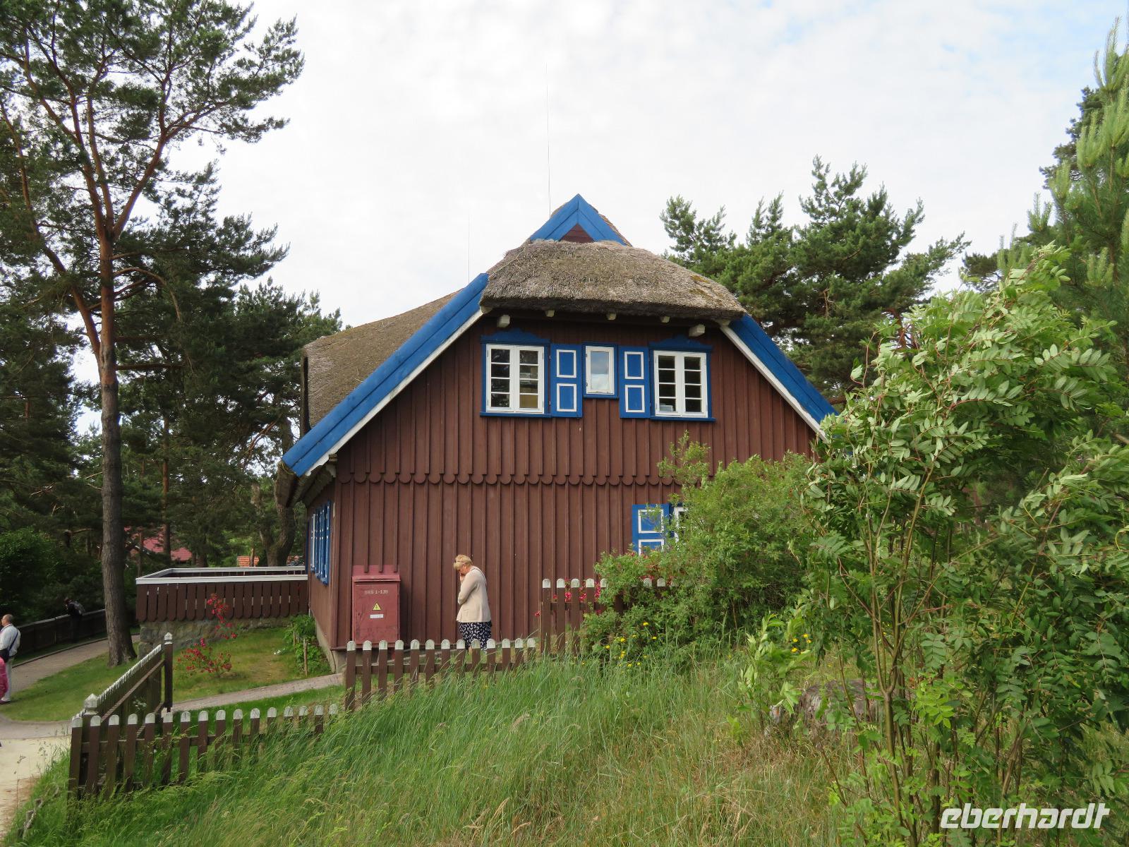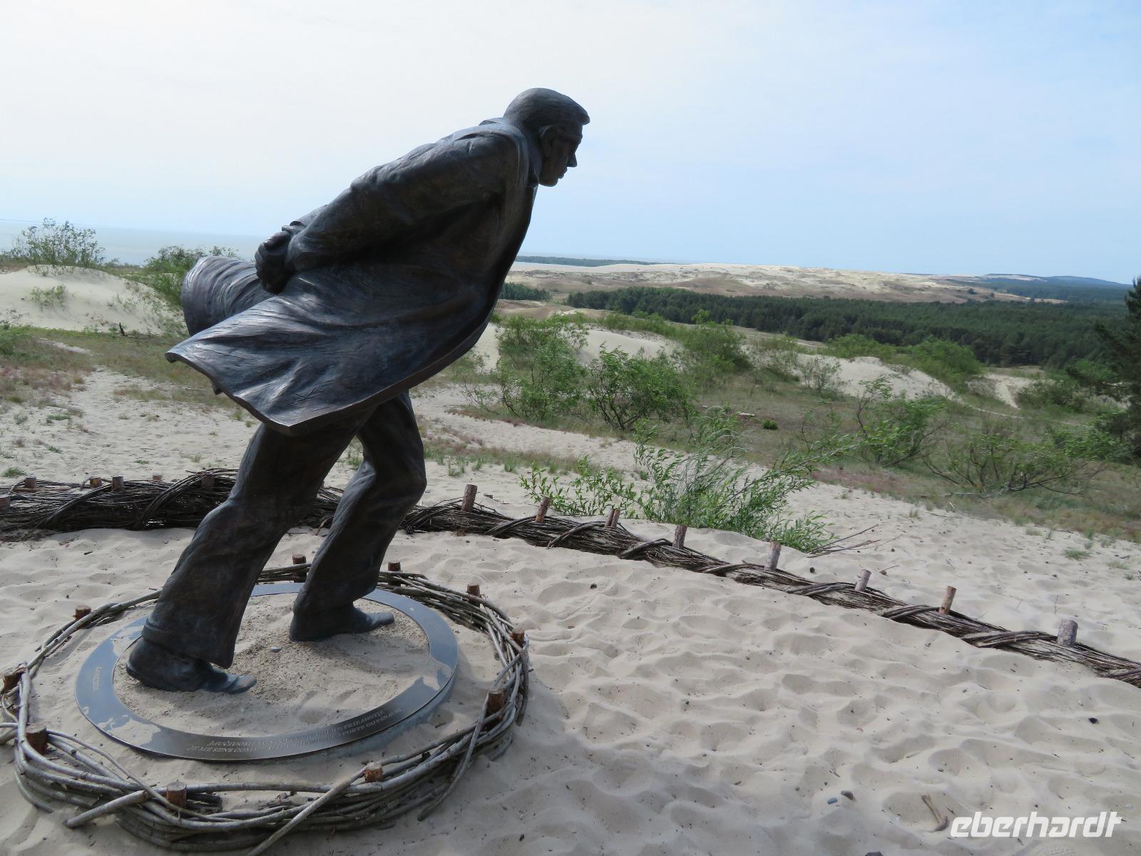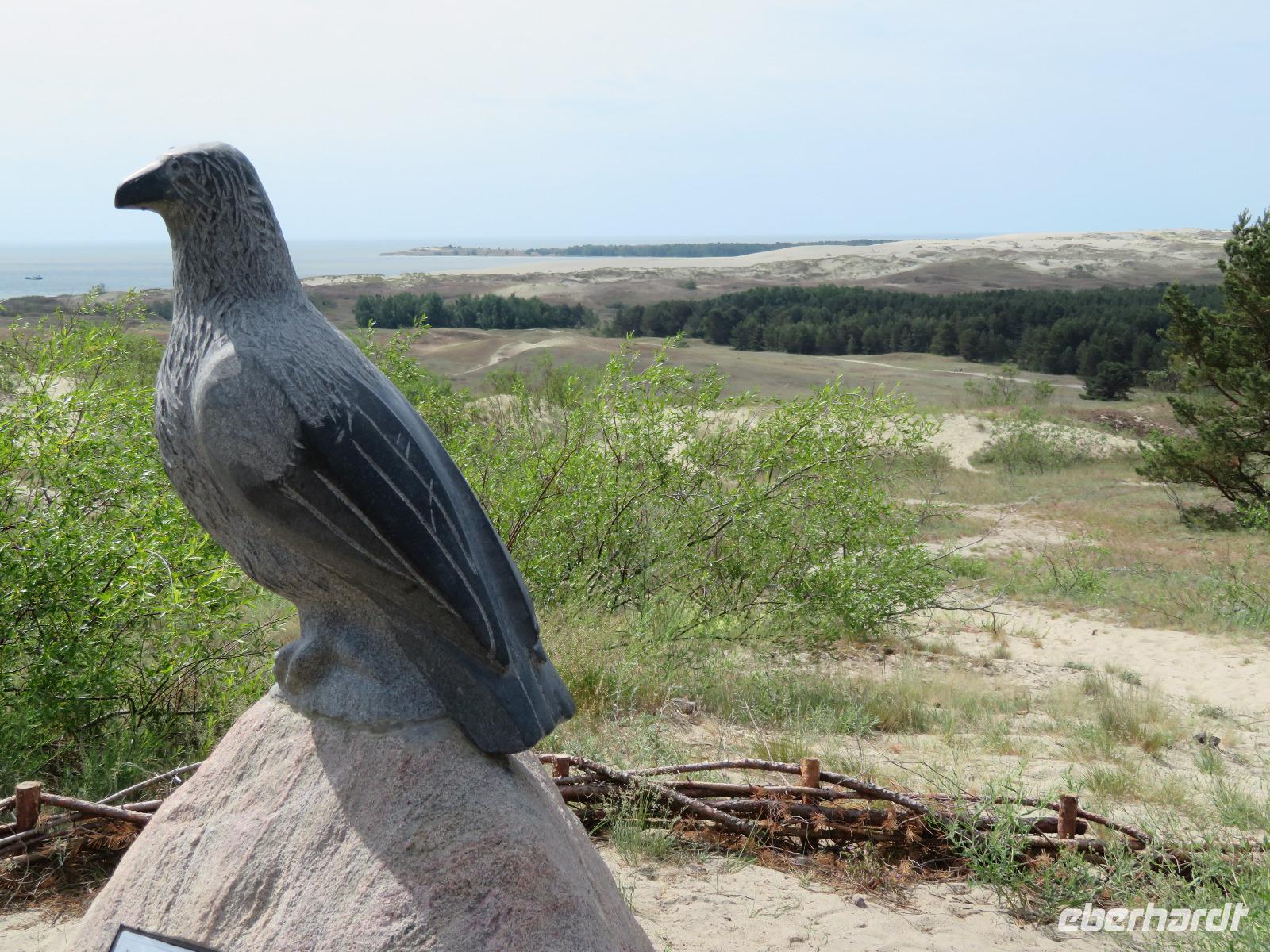 Gegen 8:30 Uhr fuhren wir nach dem Frühstück zur Fähre, um möglichst vor anderen Touristengruppen auf die Kurische Nehrung zu gelangen. Der nördliche Zipfel der Kurischen Nehrung gehört noch zur Stadt Klaipeda und bald beginnt dann die alle Orte der Nehrung zusammenfassende Großgemeinde Neringa. Hier erwartet uns die Nationalparkwacht, wo man nochmals löhnen muss. Fährgebühr und Nationalparkeintritt haben scheinbar mittlerweile sogar Einfluss auf die Gästeanzahl auf der Nehrung, denn im Gegensatz zu alten hält sich die Anzahl an Touristengruppen in Grenzen. Hinter dem Ortsteil Schwarzort (Joudkrante) stoppten wir, um dem Treiben der sich hier massiv entwickelnden Population von Kormoranen und Reihern zuzuschauen. Nach reichlich einer Stunde erreichten wir dann das Thomas-Mann-Haus im nördlichen Teil von Nidden. Es ist schon eine vortreffliche Lage und mancher hätte sich die in diesem Jahr demontierte Bank gewünscht, um wie einst Thomas Mann auf das Haff zu schauen. Wenige Minuten von hier erreichten wir mit dem Bus die Hohe Düne, zweithöchste Düne Europas. Beeindruckender Blick über die Dünenwellen hinüber auf den russischen Teil der Kurischen Nehrung, nach Osten auf das Haff und nach Westen auf die Ostsee. Den Weg hat man nun mit einigen Aussichtspunkten und einer Plastik von Jean Paul Sartre gesäumt. Fast alle Gäste entschieden sich zu einem gemächlichen Spaziergang über den holzbefestigten Weg mit mancher verwehter Sandhäufung von der Düne hinunter nach Nida am Haff. Wem diese kaum zwei Kilometer Wegstrecke doch zu anstrengend erschienen sollten, der kann sich mit dem Bus bis zum Busparkplatz am Rande des Ortes fahren lassen und spaziert zu den typischen Kurenhäusern. Nach dem kleinen Ortsbummel an den braun-blau-weiß gestrichenen Kurenhäusern vorbei war sogar noch eine Stunde Zeit für einen litauischen Imbiss: kalte rote Beete - Suppe oder Heringshappen.