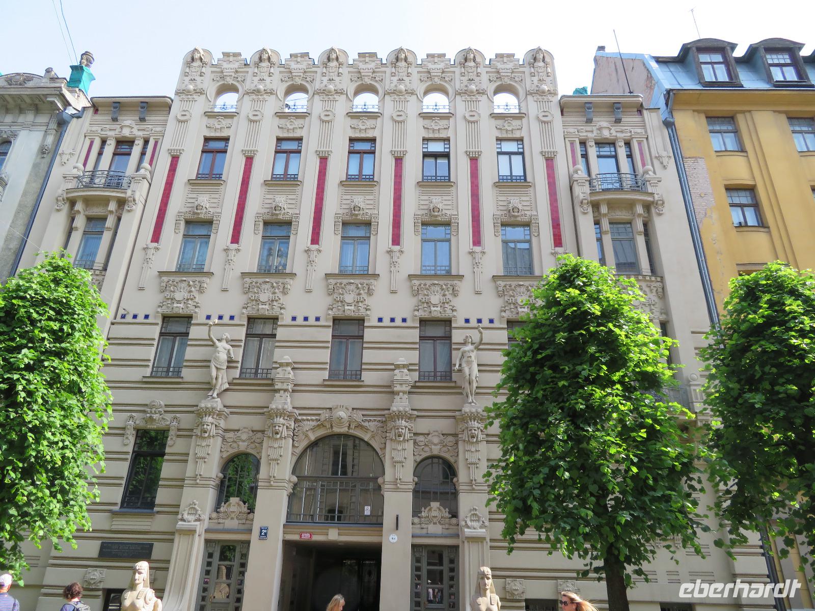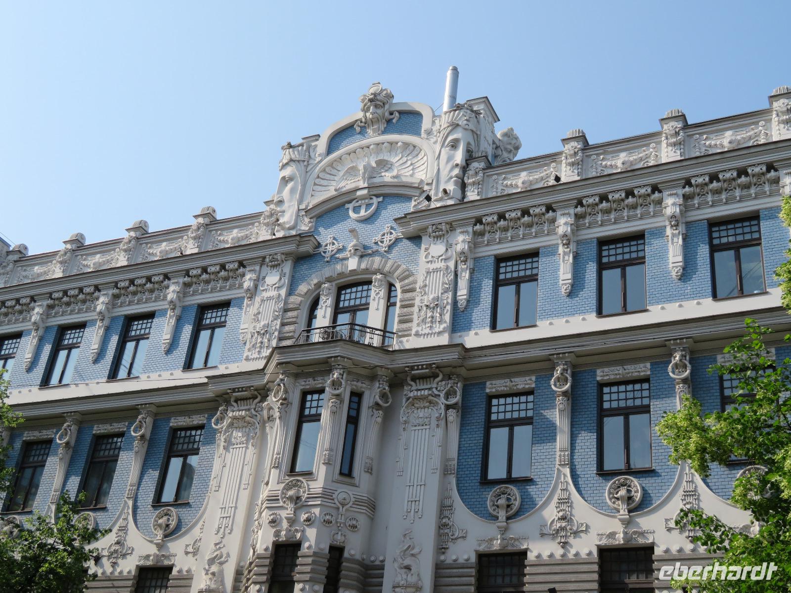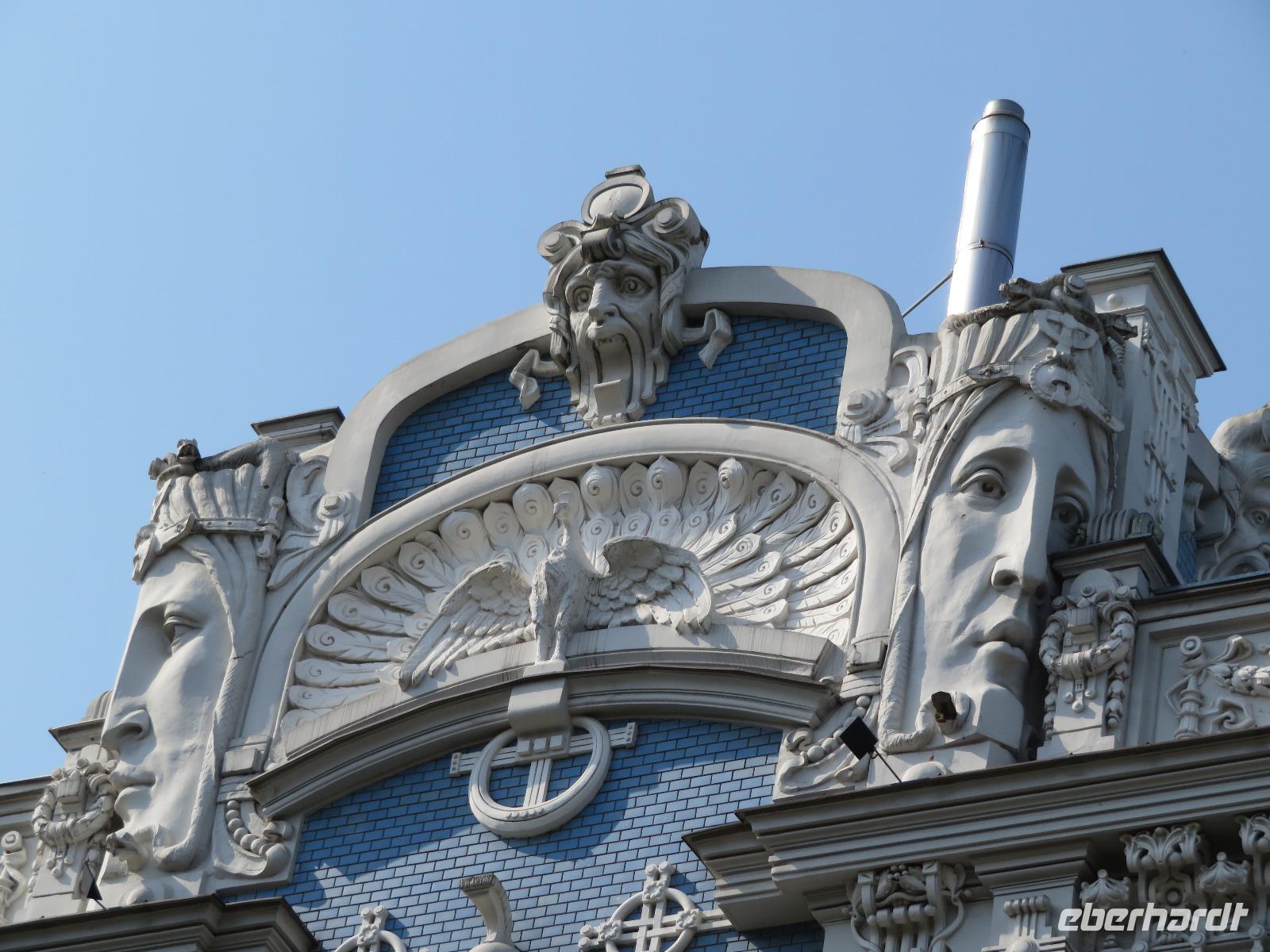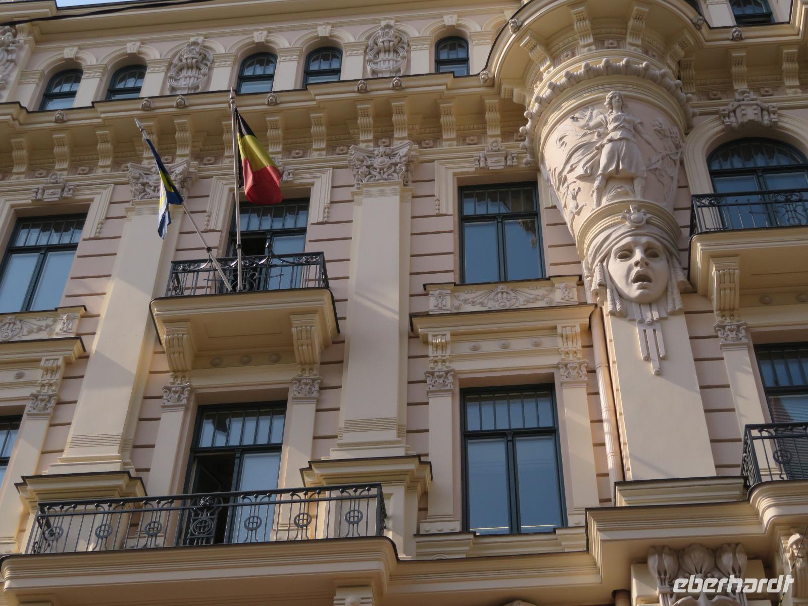 Mit unserem Reisebus fuhren wir auf die andere Seite der Daugava, um an der Elizabethstraße unsere kleine Tour zu den markantesten Rigaer Jugenstilgebäuden, insbesondere jenen von Michail Eisenstein, zu starten. Nach einem Stillstands der Restauration in den Jahres der Wirtschaftskrise ab 2008 sieht man nun sehr langsame Fortschritte bei der Sanierung von Gebäuden in der Albertstraße; während bei einigen der ersten sanierten mitunter schon die Farbe recht dunkel wird und eigentümerabhängig eine weitere Sanierung erfolgt. Meist sind es wohl institutionelle Eigentümer, die eine Sanierung eher vorantreiben als private Eigentümer es können und wollen. So ist der erkennbare Sanierungsfortschritt seit 2010 selbst in der Albertstraße nur marginal. Aber auch bei den noch grauen Fassaden der Gebäude sieht man deutlich die bestimmenden Stilelemente des Jugendstils.