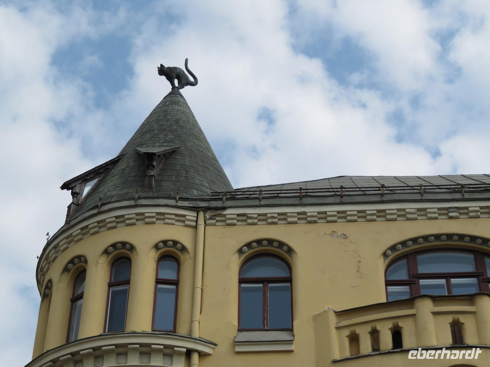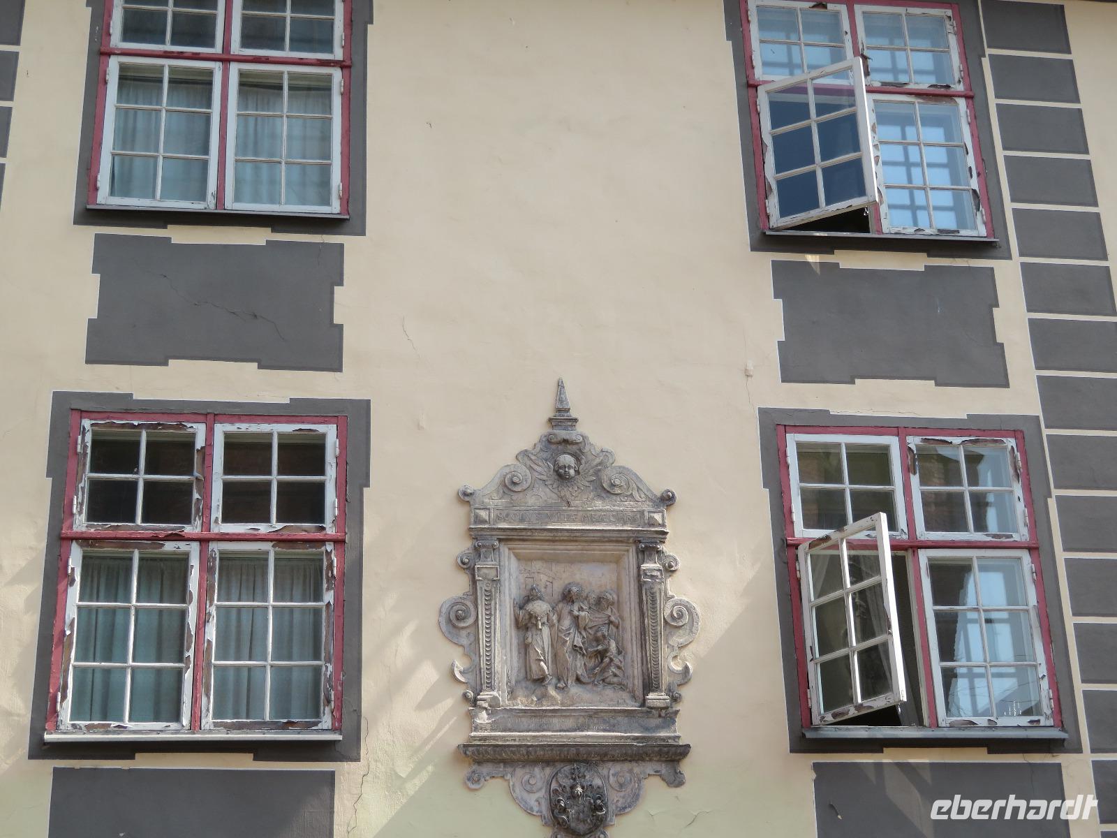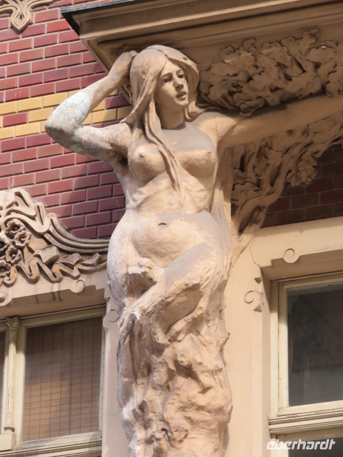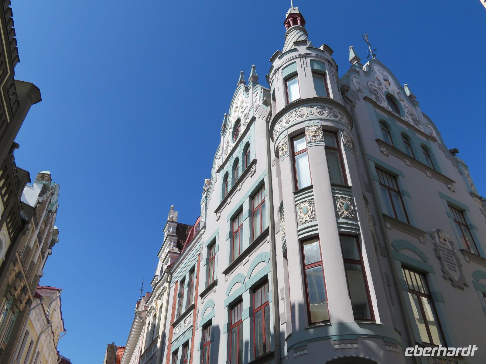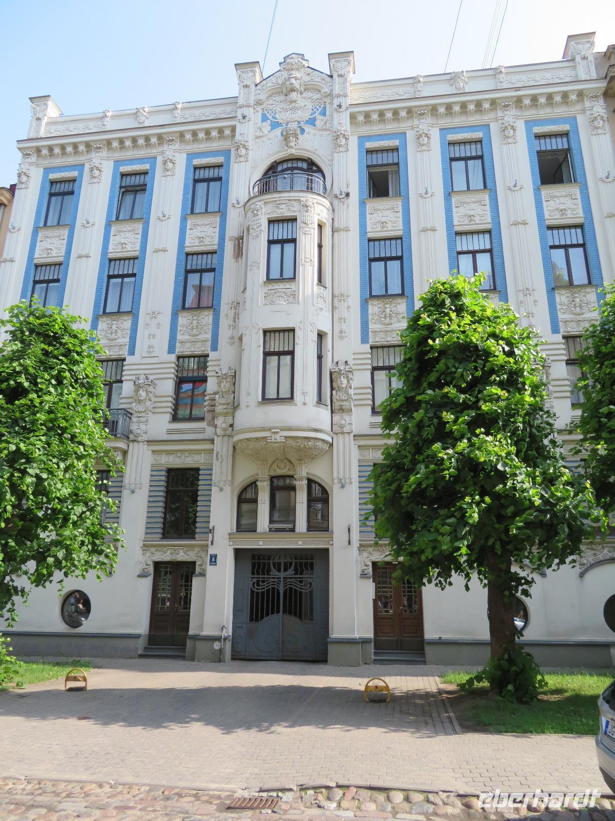Mit unserem Reisebus fuhren wir auf die andere Seite der Daugava, um an der Elizabethstraße unsere kleine Tour zu den markantesten Rigaer Jugenstilgebäuden, insbesondere jenen von Michail Eisenstein, zu starten. Nach einem Stillstands der Restauration in den Jahres der Wirtschaftskrise ab 2008 sieht man nun sehr langsame Fortschritte bei der Sanierung von Gebäuden in der Albertstraße; während bei einigen der ersten sanierten mitunter schon die Farbe recht dunkel wird und eigentümerabhängig eine weitere Sanierung erfolgt. Meist sind es wohl institutionelle Eigentümer, die eine Sanierung eher vorantreiben als private Eigentümer es können und wollen. So ist der erkennbare Sanierungsfortschritt seit 2010 selbst in der Albertstraße nur marginal. Aber auch bei den noch grauen Fassaden der Gebäude sieht man deutlich die bestimmenden Stilelemente des Jugendstils.