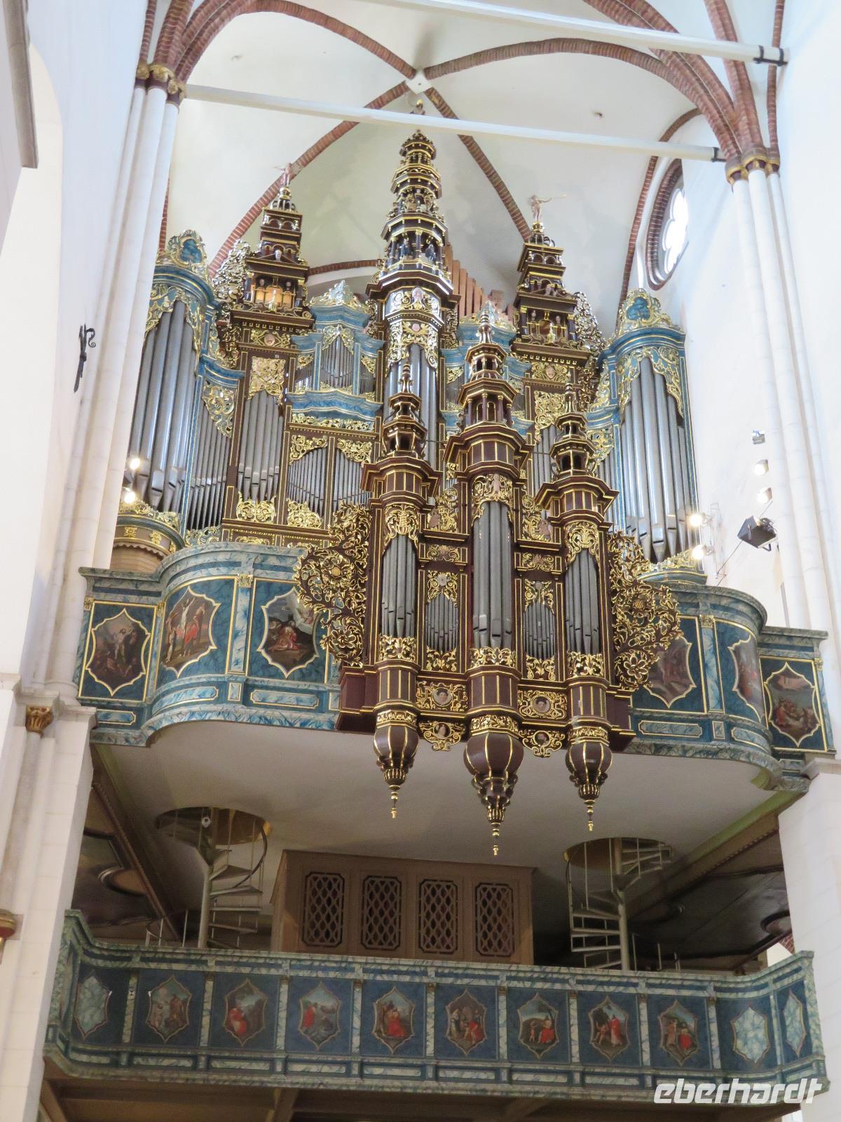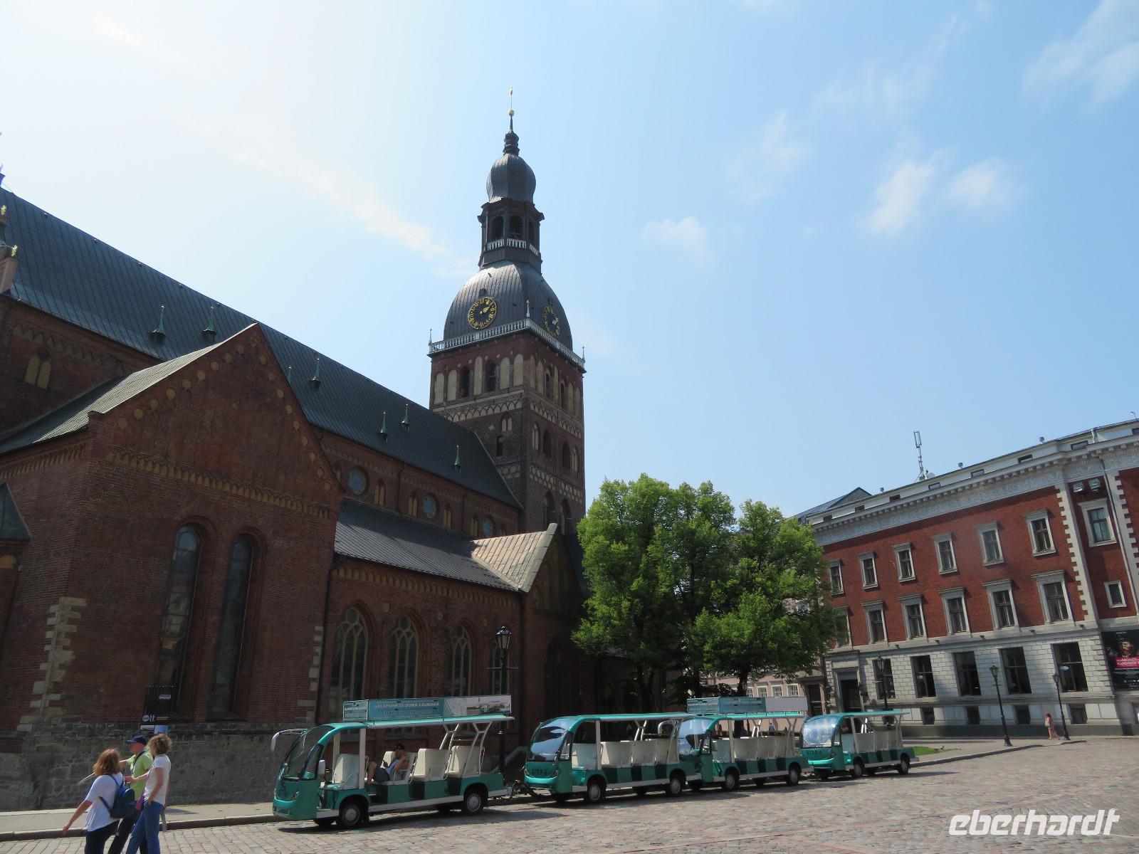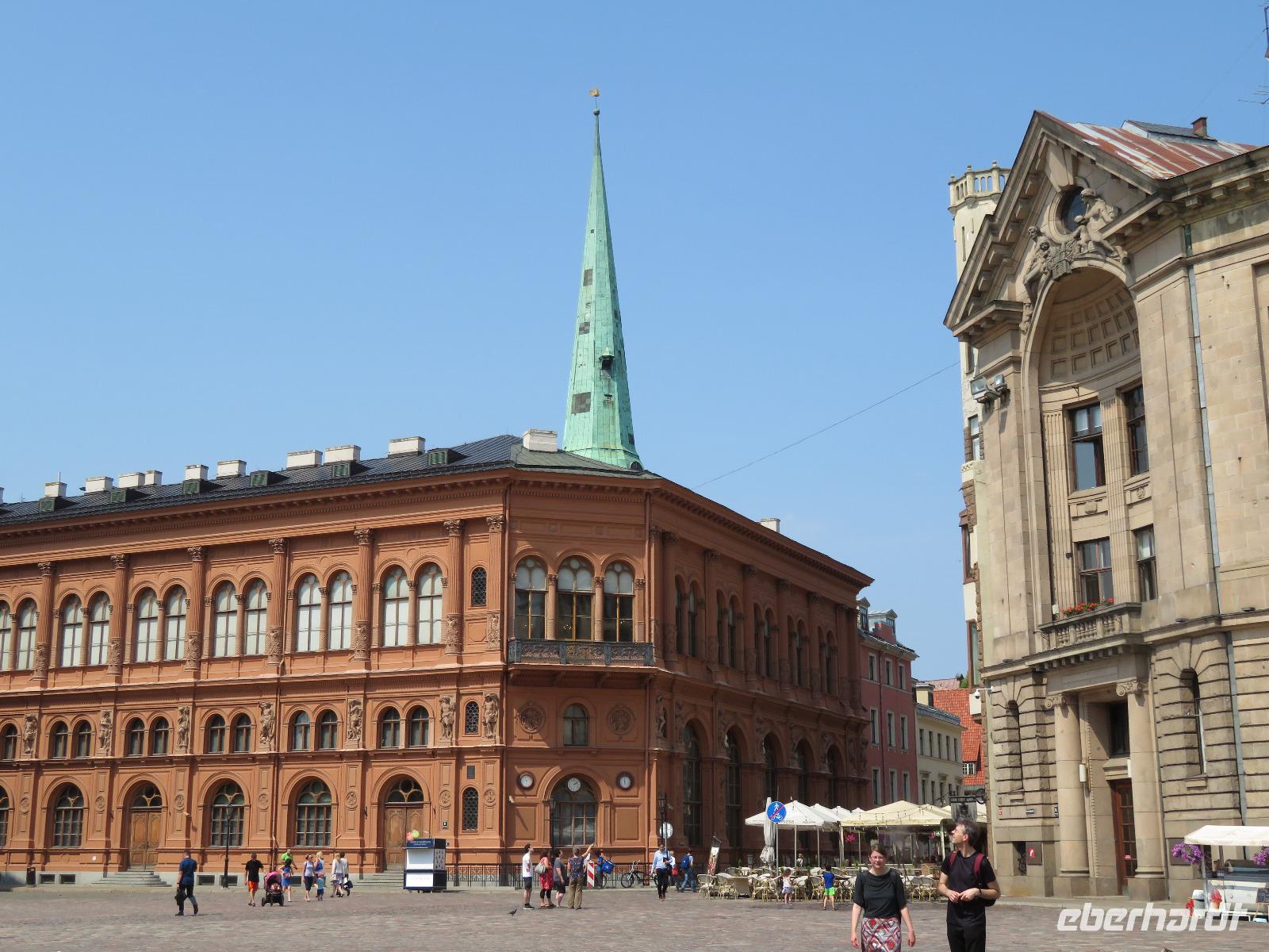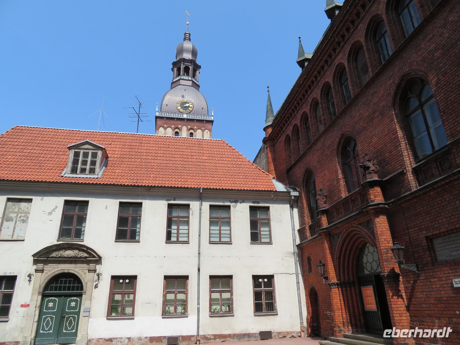 Der Reisebus brachte uns anschließend an zahlreichen bedeutenden öffentlichen Gebäuden am einstigen Wall vorbei zum Rathausplatz mit dem Denkmal der Lettischen Schützen, die noch immer dort in rotem Granit stehen, weil Sie nicht nur als Lenins Wachelite dienten, sondern sich bereits im 1. Weltkrieg bei der Verteidigung von Riga Ruhm erwarben. Vom Schwarzhäupterhaus bummelten wir bei Sonne zu St. Pauli, durch den Konventhof, zur Großen und Kleinen Gilde, dem Katzenhaus, vorbei am Parlament mit dem Barrikadendenkmal, den drei Brüdern und beendeten den Bummel auf dem Platz vor dem Dom einige Minuten vor Zwölf. So hatten wir keine Not rechtzeitig in den Dom zum Piccolo-Orgelspiel zu gelangen. Nach dem Konzert ist immer eine gute Möglichkeit sich des gotische Gewölbe der Kirche, den Kreuzgang und einige Epithaphen anzuschauen.