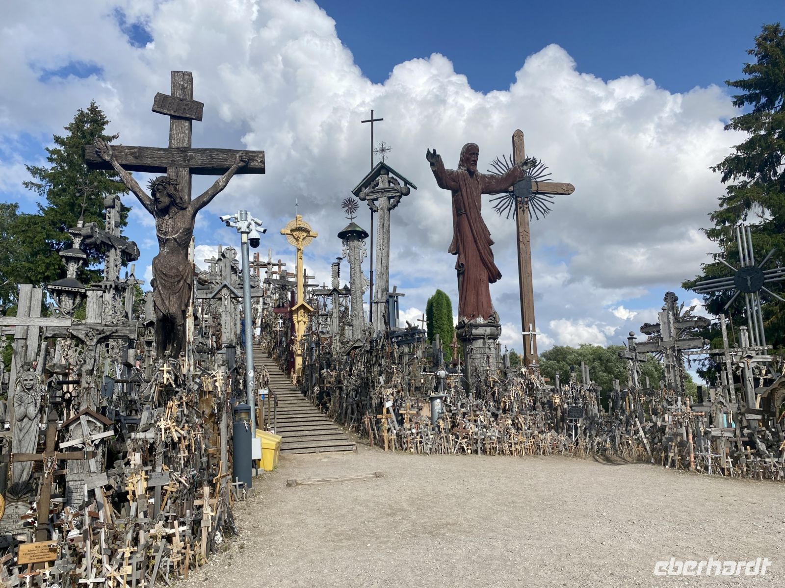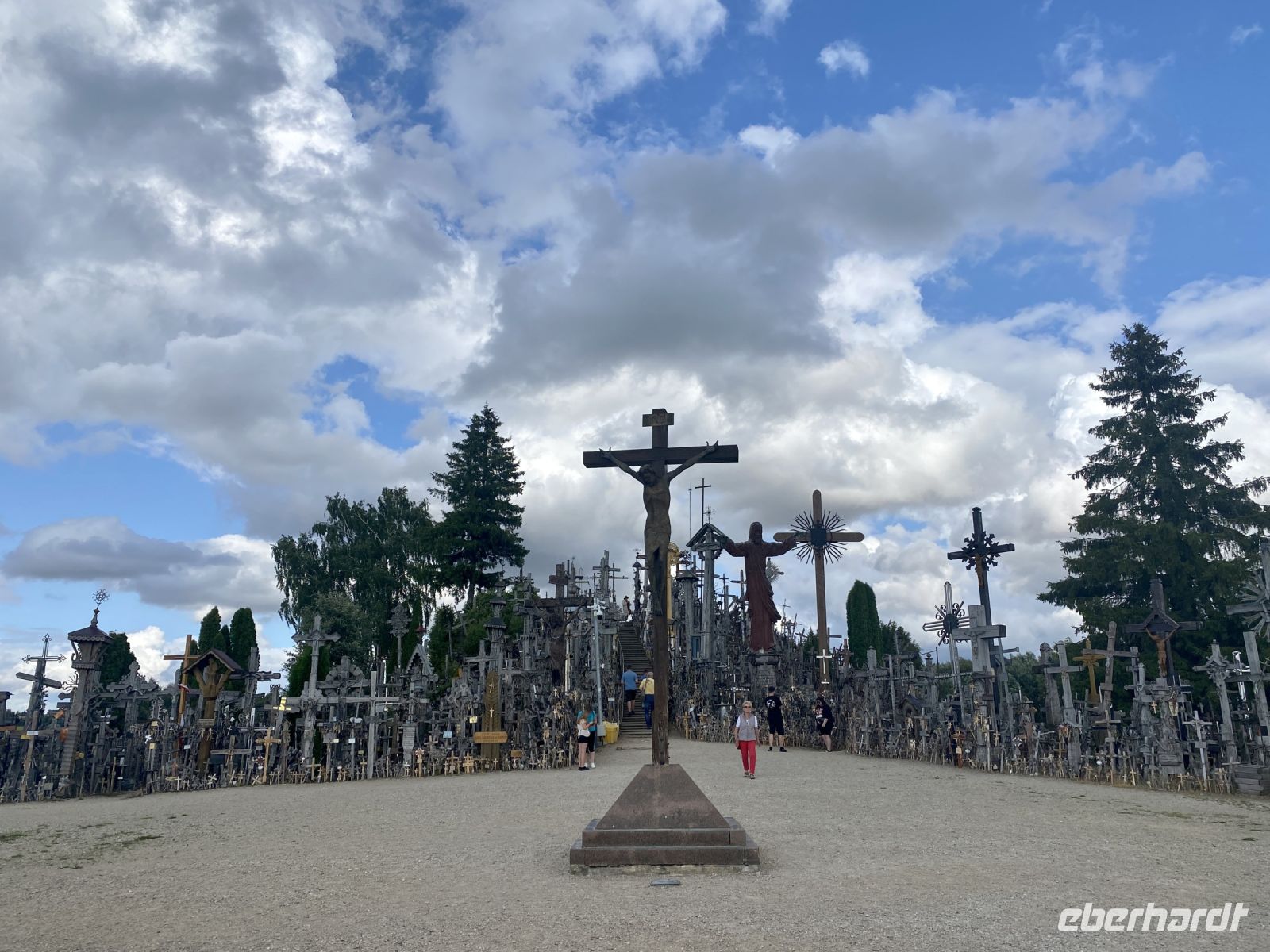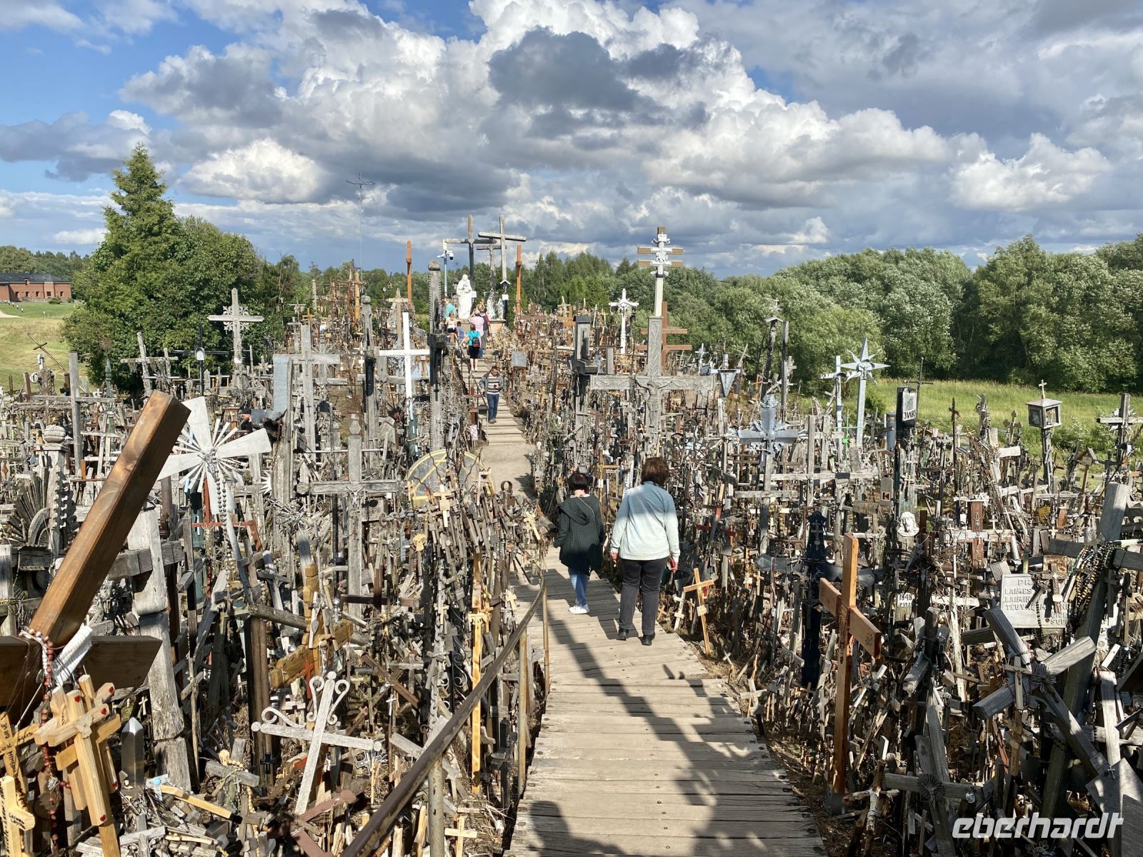 Aufgrund einer Verzögerung verlassen wir unser Hotel am Morgen etwas später als geplant, um zur nahegelegenen Fähre zu fahren, die uns zum nächsten Highlight der Reise bringen soll – die Kurische Nehrung. Die riesigen Wanderdünen, die zu den größten Europas gehören, sind beeindruckend mächtig und dürfen natürlich auf einer Reise durch das Baltikum nicht fehlen. Nach 5 Minuten Fährüberfahrt erreichen wir den nördlichen Zipfel der Nehrung – Sandkrug - der noch zur Stadt Klaipeda gehört. Kurze Zeit später finden wir uns dann aber schon am Eingang zum Nationalpark und somit auch an dem kleinen Kassenhäuschen vor, das uns nur gegen die vorgeschriebene Nationalparkgebühr den Zutritt gewährt. Für den Erhalt dieser einzigartigen Natur ein faires Angebot. Hinter dem Ortsteil Schwarzort legen wir dann unseren nächsten Stopp ein, um dem Treiben und den ökologischen Folgen der sich hier massiv entwickelnden Population von Kormoranen zuzuschauen. Nach reichlich einer Stunde Fahrt über die Nehrung erreichen wir das Thomas-Mann-Haus im nördlichen Teil von Nidden. Die Lage ist perfekt gewählt und bietet uns von der Steilküste ein fantastischen Blick auf das Kurische Haff. Niemand von uns kann es Thomas Mann wohl verdenken sich hier ein Häuschen gebaut zu haben. Wir genießen die Aussicht und schlendern ein wenig entlang der ausgedehnten Promenade nach Nidden hinein, bevor wir unseren Weg fortsetzen. Nur kurze Zeit später erreichen wir die gut 52 Meter hohe Parnidis-Düne. Hier oben lassen wir unseren Blick schweifen und können von hieraus nicht nur die Ostsee und das Kurische Haff erblicken, vor uns breitet sich auch der russische Teil der Kurischen Nehrung aus. Hier oben haben wir ein bisschen Zeit um über die befestigten Wege zu spazieren und die tollen Ausblicke zu genießen. Zurück am Bus stärken wir uns bei einer kleinen Mittagspause, bevor wir unseren Rückweg zur Fähre antreten. Gerne hätten wir heute noch etwas mehr Zeit hier gehabt, aber es liegen noch einige Kilometer und eine Landesgrenze vor uns, bevor wir unser Übernachtungsdomizil in der lettischen Hauptstadt Riga erreichen. Doch ein kleiner, wenn auch überraschender, Höhepunkt erwartet uns noch. Kurz nach der litauischen Stadt Siauliai biegt unser Busfahrer Uwe von der Straße ab und nur wenige Augenblicke später erscheint vor unseren Augen der Berg der Kreuze - Wallfahrtsort und Ort der Manifestation des Unabhängigkeitsstrebens der Litauer. Überwältigt von der Flut der hier aufgestellten und niedergelegten Kreuze erreichen wir am Abend unser komfortables Hotel in Riga, wo wir den Abend beim reichhaltigen Abendbuffet ausklingen lassen.
