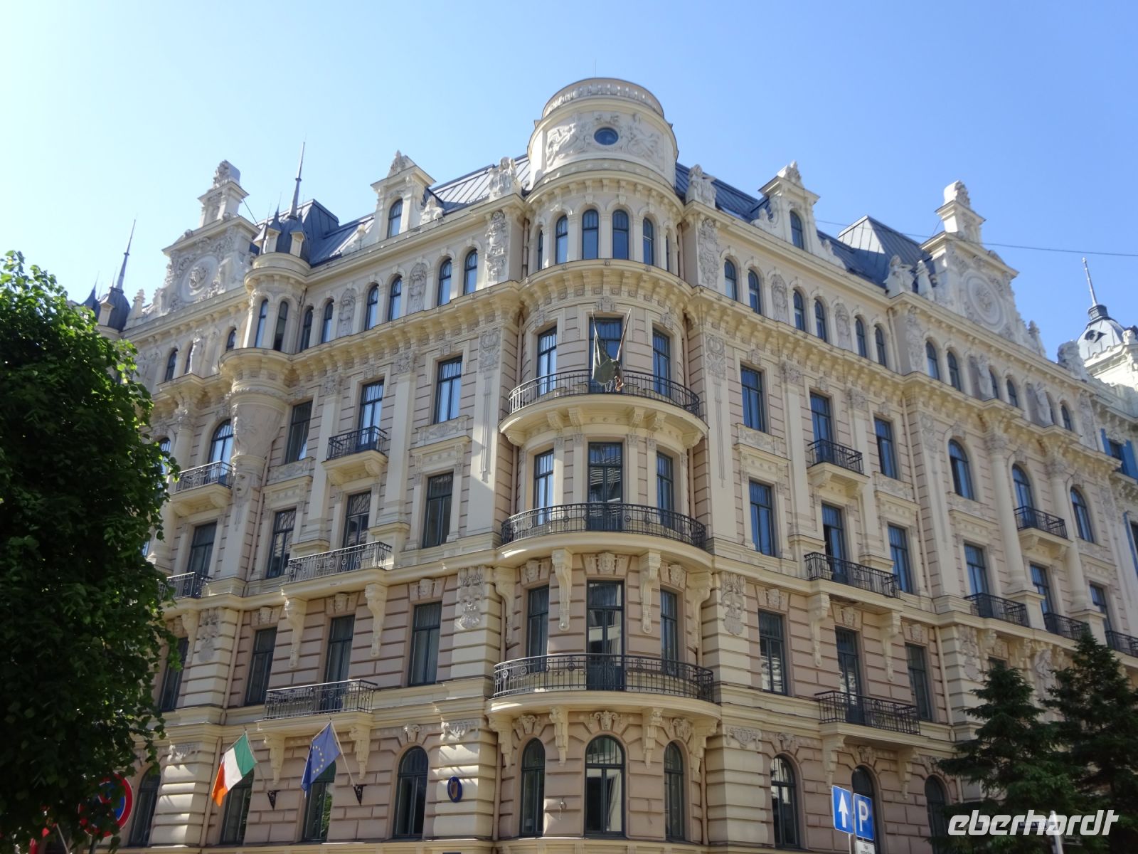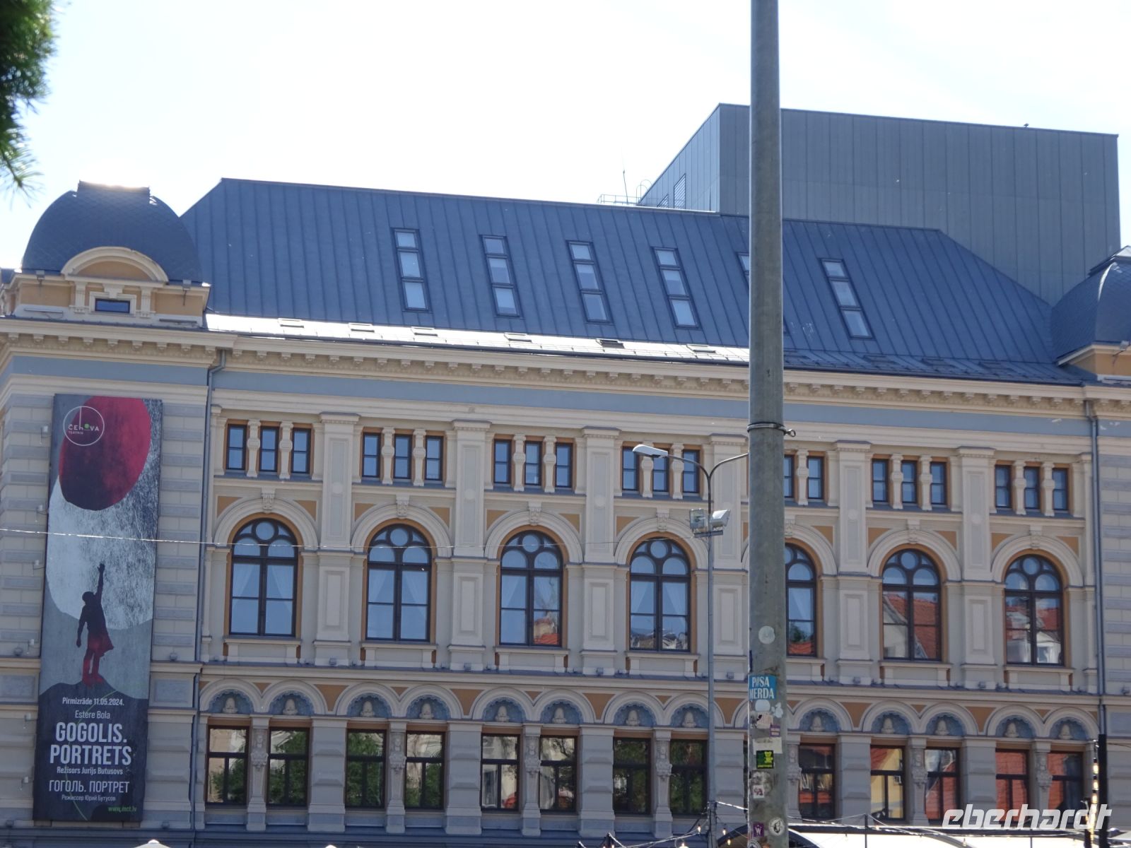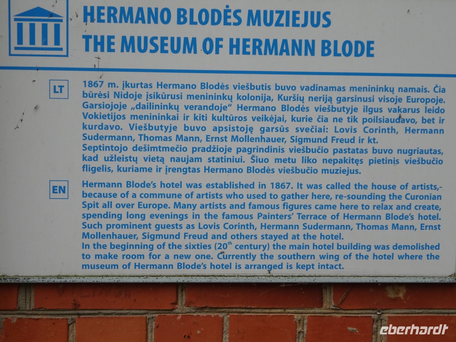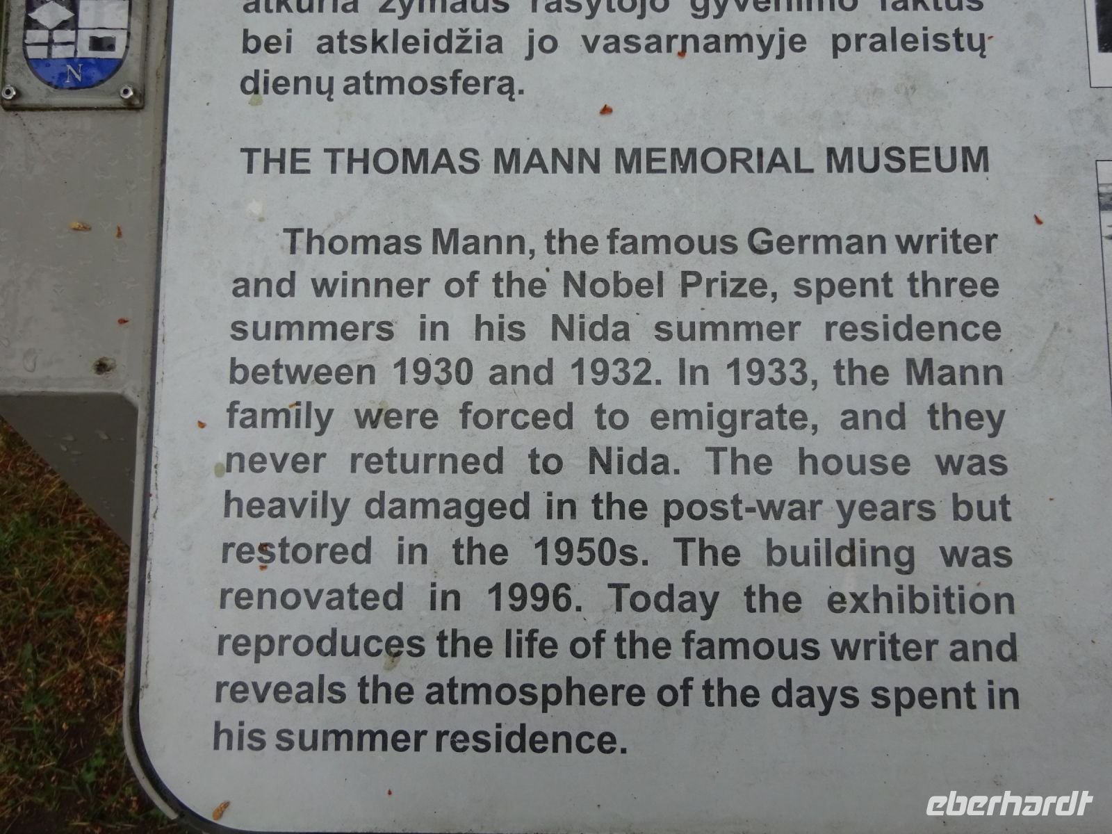 Heute nun die Kurische Nehrung, ein ganz besonderer Höhepunkt der Reise rund um die Ostsee. Das Frühstück hatten wir für uns extra etwas früher bestellt, denn wir wollten zeitig starten. Heute, zum Sonntag, werden Gäste wie auch Einheimische auf die Nehrung fahren, auf die allerdings täglich nur 2000 Gäste kommen dürfen. Kleipeda ist das Tor zur Nehrung und damit Startpunkt für alle Besucher. Das gesamte Gebiet der Nehrung ist ein Nationalpark und unterliegt einem besonderen Schutz und strengen Regeln, damit dieses Paradies möglichst erhalten bleibt. Mit der Fähre ging es in wenigen Minuten von Kleipeda hinüber nach Sandkrug [litauisch Smiltyne]. Zunächst gab es im Bus einige Informationen, darunter auch eine Übersichtskarte der Nehrung. Hinter dem Ortsteil Schwarzort [litauisch Joudkrante] sah man die Folgen des Aufenthalts der sich hier rasant vermehrenden Kormorane und Reiher: zahllose abgestorbene Bäume. In den Bäumen sahen wir große Nester. Bald waren wir in Nidden [litauisch Nida]. Zuerst fuhren wir auf die Hohe Düne, die zweithöchste Düne Europas. Wir hatten eine gute Sicht auf die Dünenwellen hinüber auf den russischen Teil der Nehrung, auch nach Osten auf das Kurische Haff und nach Westen auf die Ostsee. Gleich mehrere Souvenirstände lockten uns: Bernstein in allen Varianten gab es, auch hübsche Ansichtskarten, große und kleine Kurenwimpel, dazu Magnete und vieles mehr. Weiter fuhren wir dann zum Thomas-Mann-Haus, gebaut in den typischen Niddener Farben. Es liegt etwas außerhalb von Nidden auf dem sogenannten Schwiegermutterberg. Heutzutage ist dort das Thomas-Mann-Kulturzentrum, in dem sich auch ein Museum über Thomas Mann und seine Aufenthalte hier am Haff befindet. Der Schriftsteller ließ das Haus nach einem Besuch auf der Nehrung im Jahre 1929 für sich und seine Familie als Urlaubsquartier bauen. Sie hatten hier alle zusammen eine wunderbare Zeit mit vielfältigen Möglichkeiten, sich zu erholen. Gäste kamen immer wieder her. Auch uns gefiel es ausgesprochen gut hier. Wir sahen uns zunächst den sehr informativen Film über Thomas Mann an, danach folgte ein Rundgang durch das Museum. Anschließend war noch genügend Zeit für Fotos und einen Spaziergang, so zur Promenade, zum alten Friedhof oder einfach in den Ort Nidden. Vom Fährhafen Smiltyne fuhren wir schließlich zurück nach Klaipeda, dann über die Autobahn nach Lettland, genauer in die lettische Hauptstadt Riga, in die Stadt an der Daugava [deutsch: Düna]. Die Daugava mündet übrigens in die Ostsee. Mit über 700.000 Einwohnern ist Riga die größte Stadt des Baltikums. Unser Hotel Bellevue Park liegt wirklich in einem schönen Park. Auch der Bus fand dort einen guten Platz, was ja in großen Städten inzwischen eher eine Seltenheit ist. Nach dem Abendessen hatten wir uns noch einen Abendspaziergang vorgenommen.