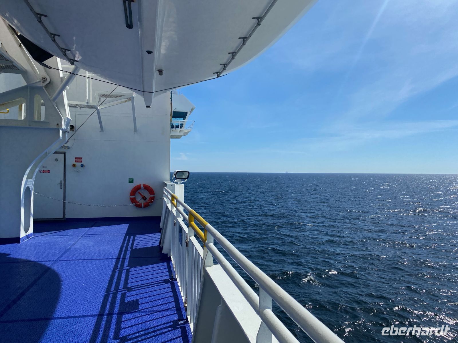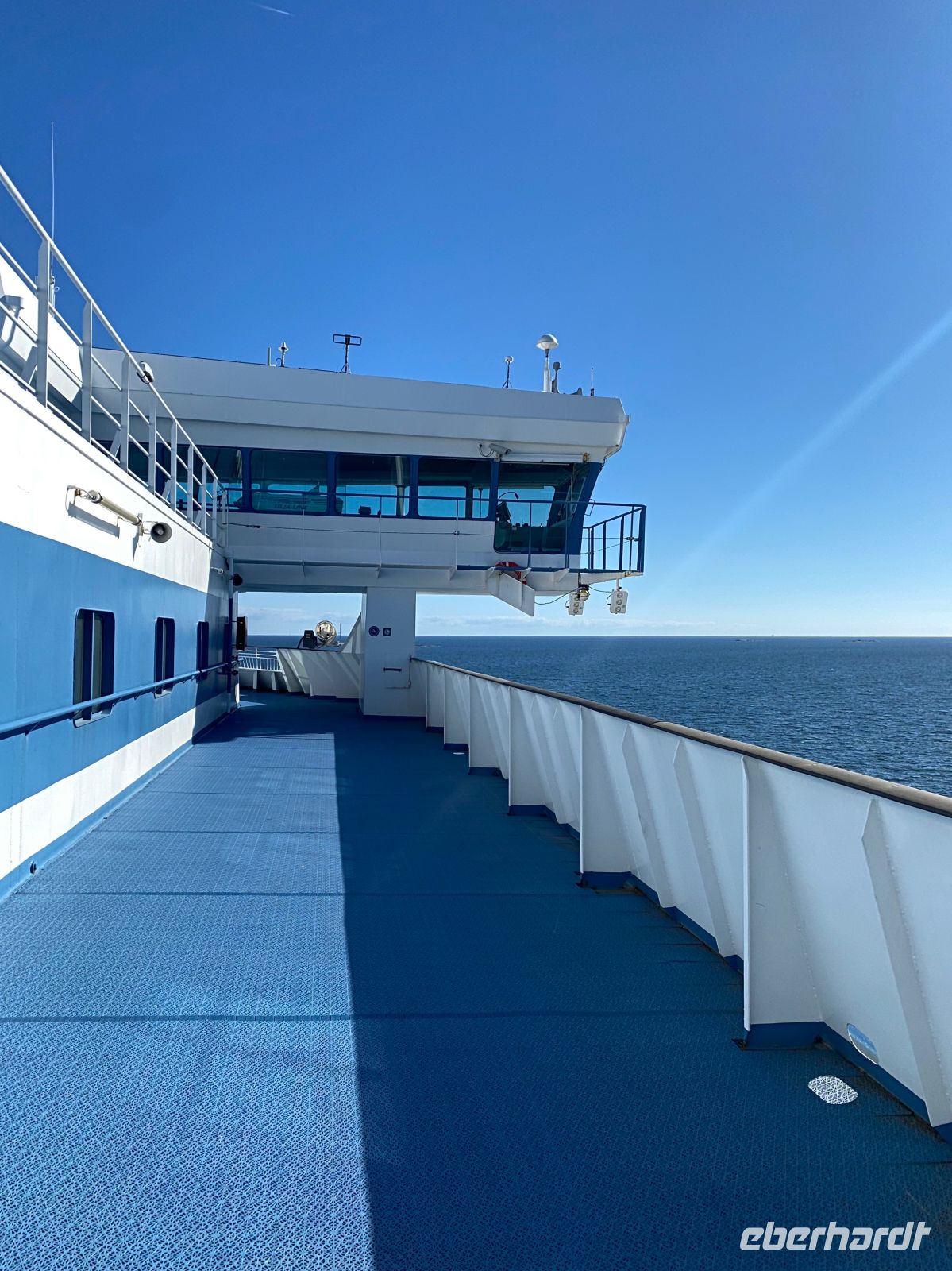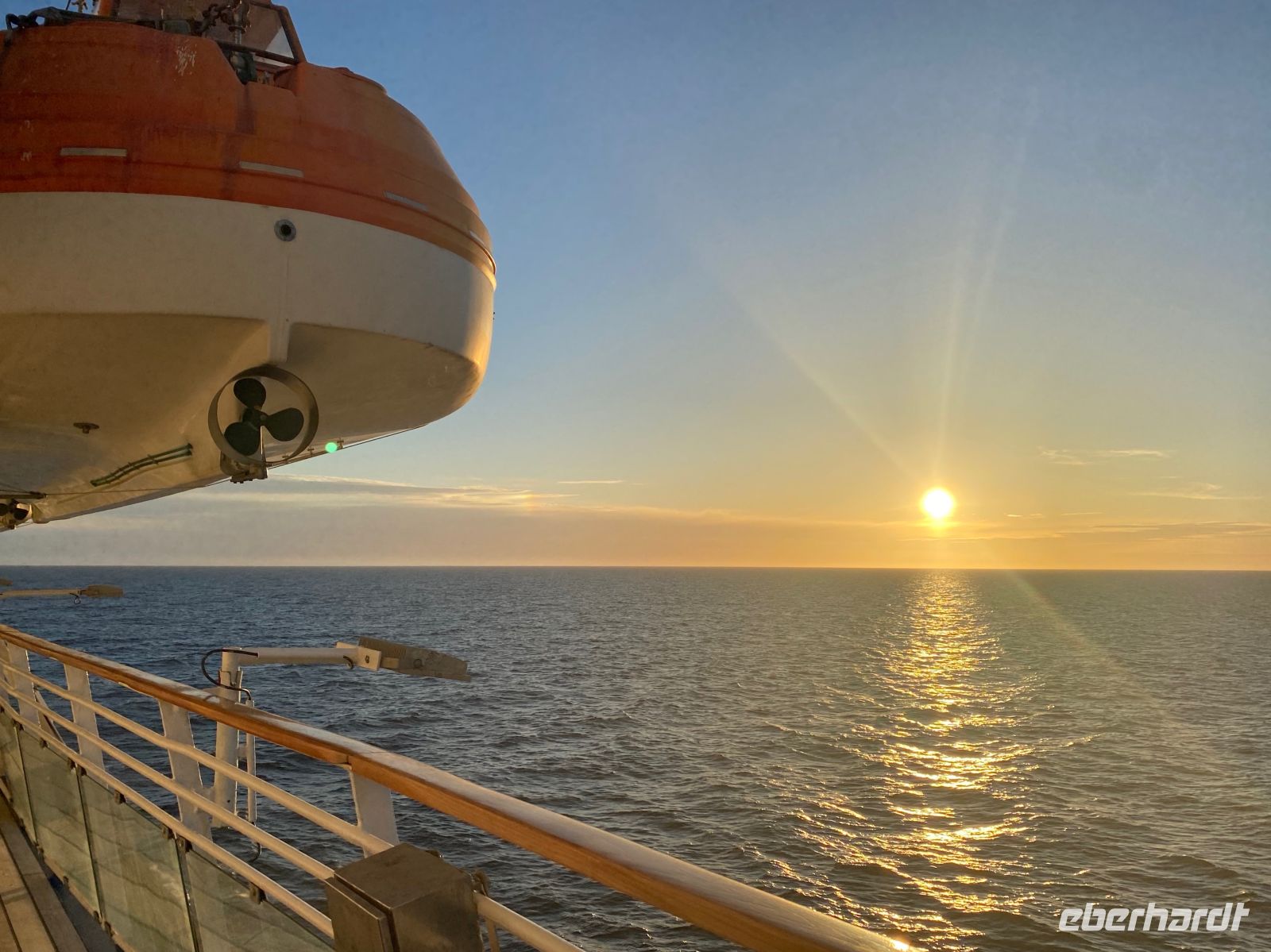 Der Tag beginnt nach Lust und Laune. Mussten gestern manche doch recht früh aufstehen, so heißt es heute ausschlafen nach Lust und Laune! Die Zeit vergeht wie im Fluge, falls man das bei einer Fast‑Kreuzfahrt auch sagen kann. Herrliches Wetter, Sonnenschein an Deck machen Appetit; Frühstück und Mittagessen sind tadellos, und für Getränke an Bord ist ausreichend gesorgt.