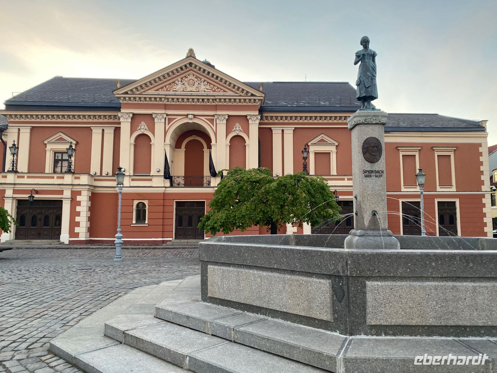 So geht es auch nach dem Abendessen zu Fuß auf eine kleine Zeitreise in diese Epochen. Wir sehen die Reste der westlichsten Deutschordensburg, der Memelburg, mit ihrem rekonstruierten Turm, und spazieren an alten Lagerhäusern mit deutscher Aufschrift vorbei zum Theaterplatz, wo wir uns ins 17. Jahrhundert versetzen. Dort, am Simon‑Dach‑gewidmeten Brunnen, singen wir gemeinsam das Lied von „Ännchen von Tharau“, einer der ersten ganz besonderen Momente auf unserer Reise.