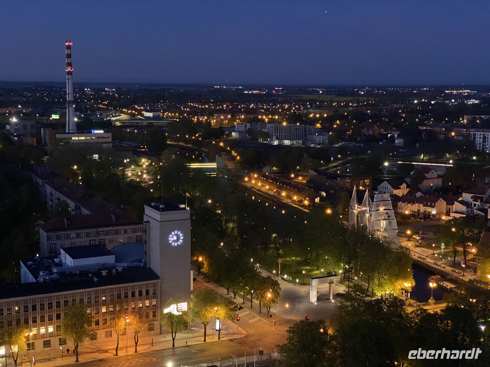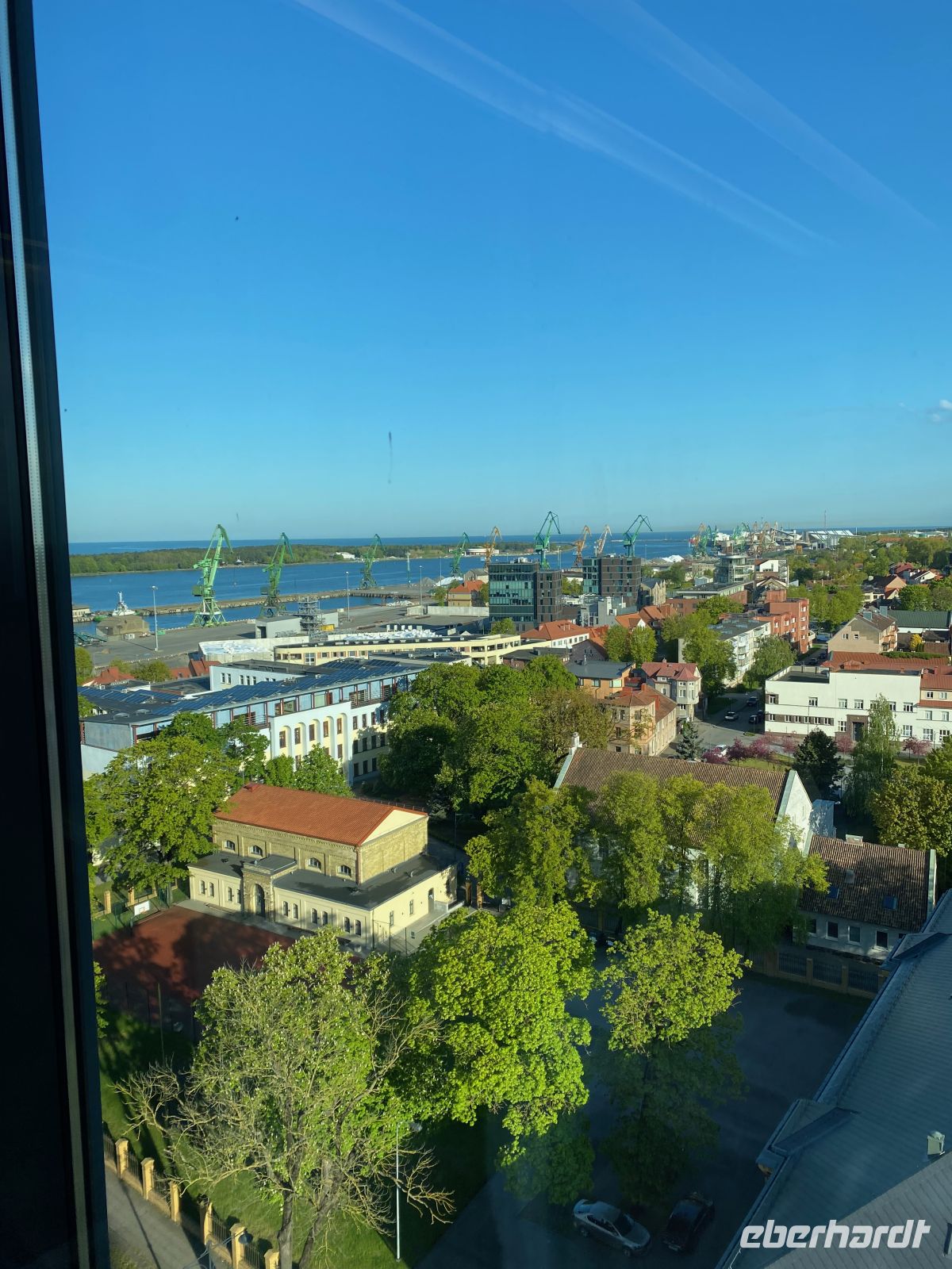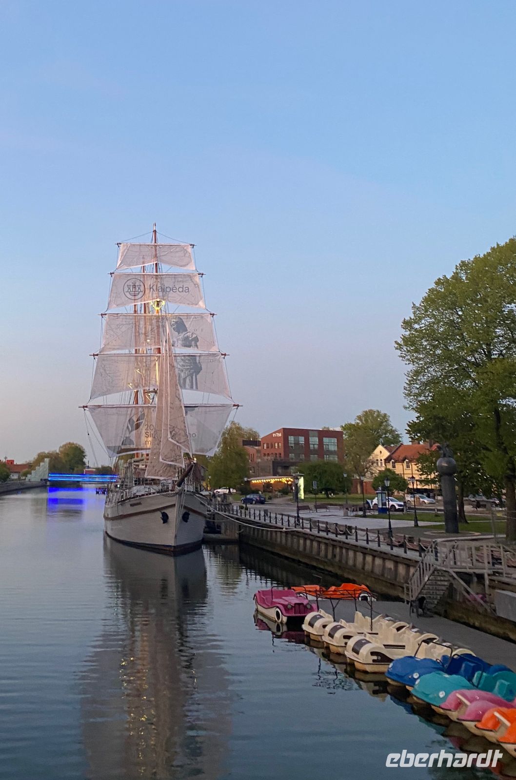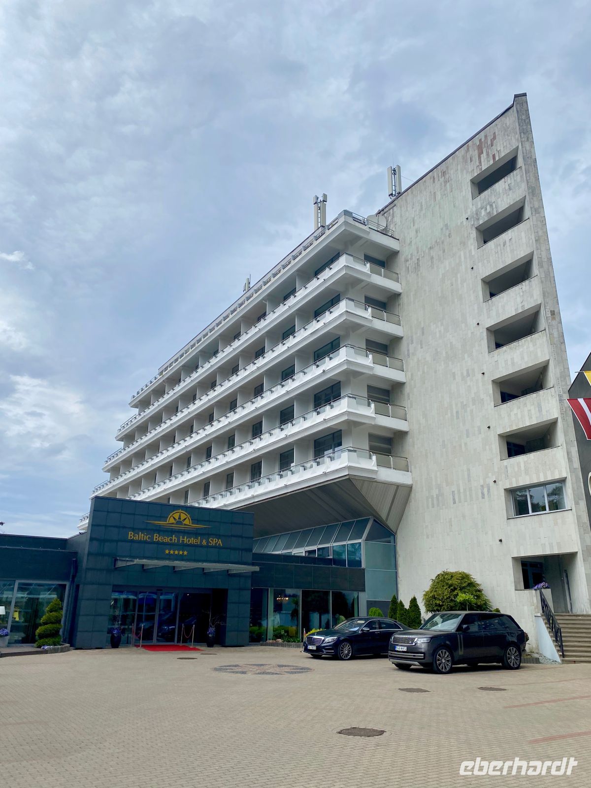 Unsere Uhren zeigen schon Osteuropäische Sommerzeit, wir kommen pünktlich in Klaipėda an. Im Bus geht es von Bord, nur eine kurze Fahrt, und wir haben unser Hotel erreicht. Mitten in einer historischen Stadt steht es da, ein riesiger Turm mit der ungewöhnlichen Form des Anfangsbuchstaben von Klaipėda, erbaut noch in den letzten Jahren der Sowjetunion als internationales Repräsentationshotel.