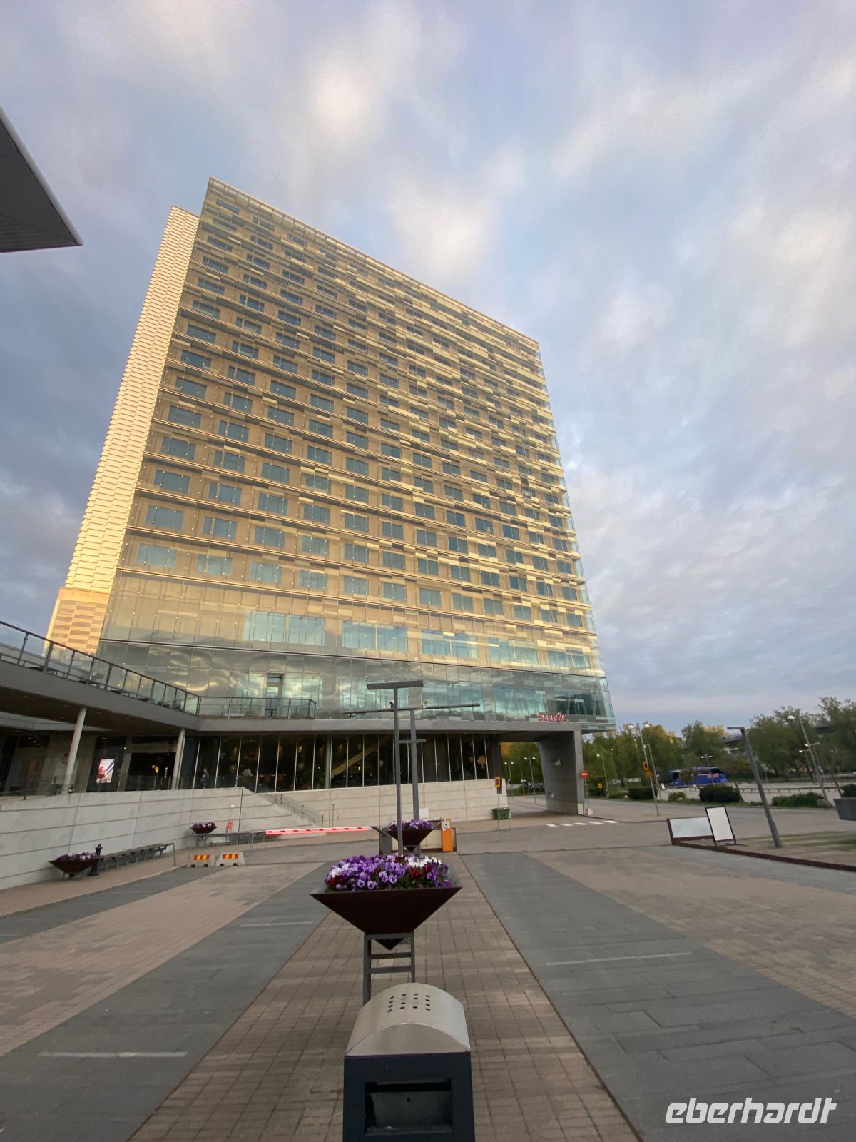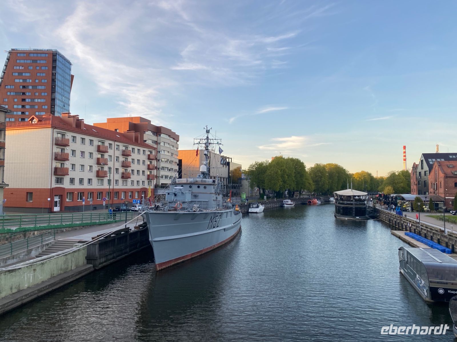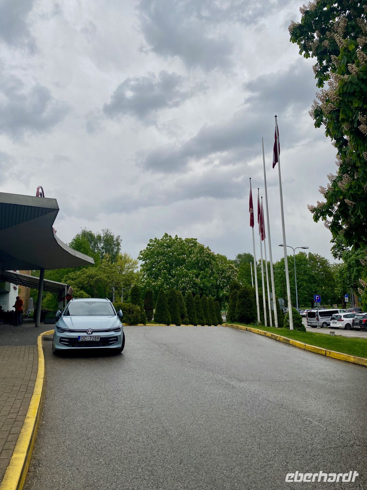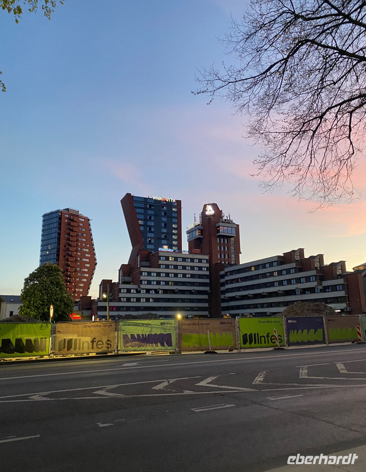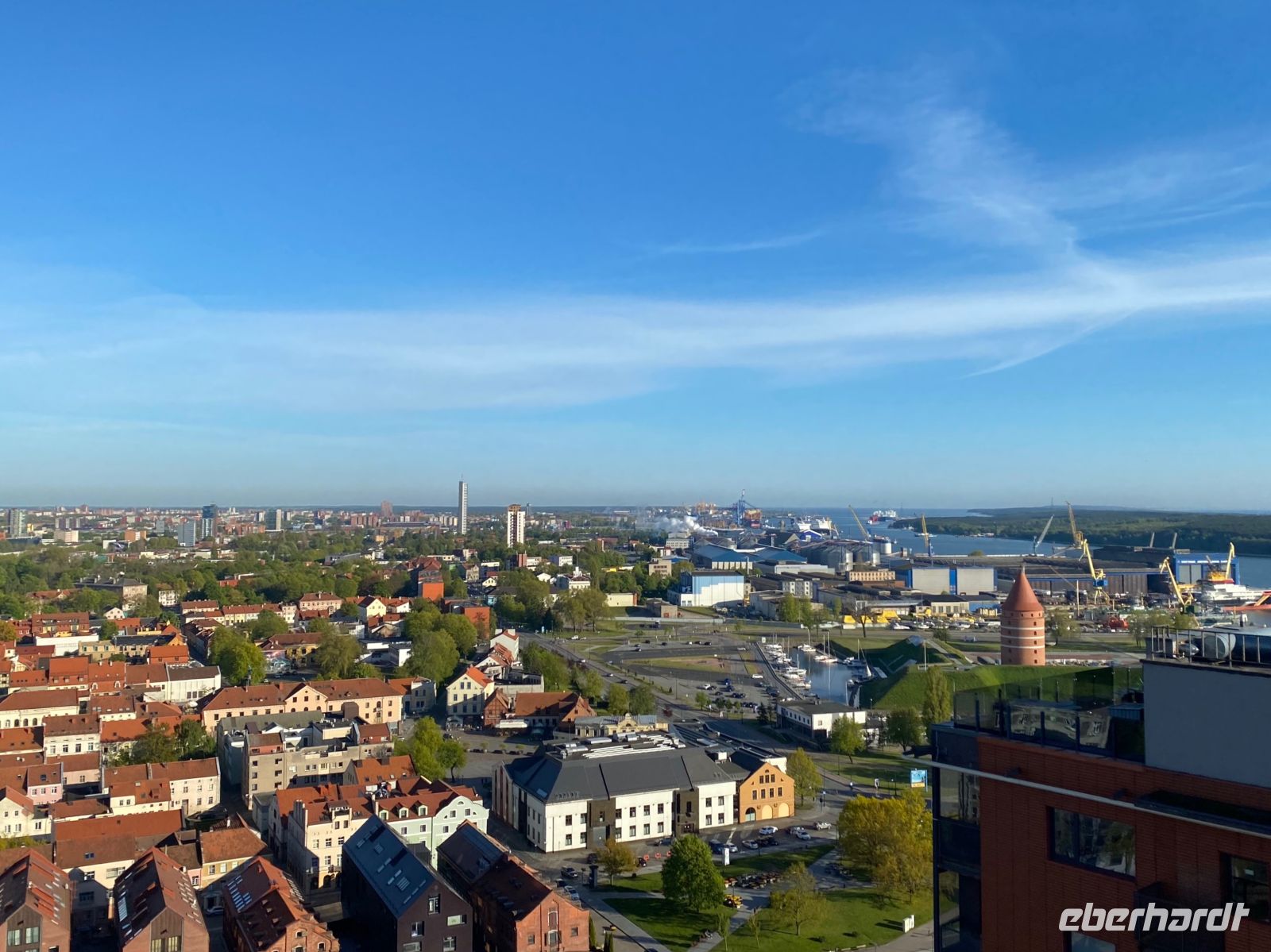 Unsere Uhren zeigen schon Osteuropäische Sommerzeit, wir kommen pünktlich in Klaipėda an. Im Bus geht es von Bord, nur eine kurze Fahrt, und wir haben unser Hotel erreicht. Mitten in einer historischen Stadt steht es da, ein riesiger Turm mit der ungewöhnlichen Form des Anfangsbuchstaben von Klaipėda, erbaut noch in den letzten Jahren der Sowjetunion als internationales Repräsentationshotel.