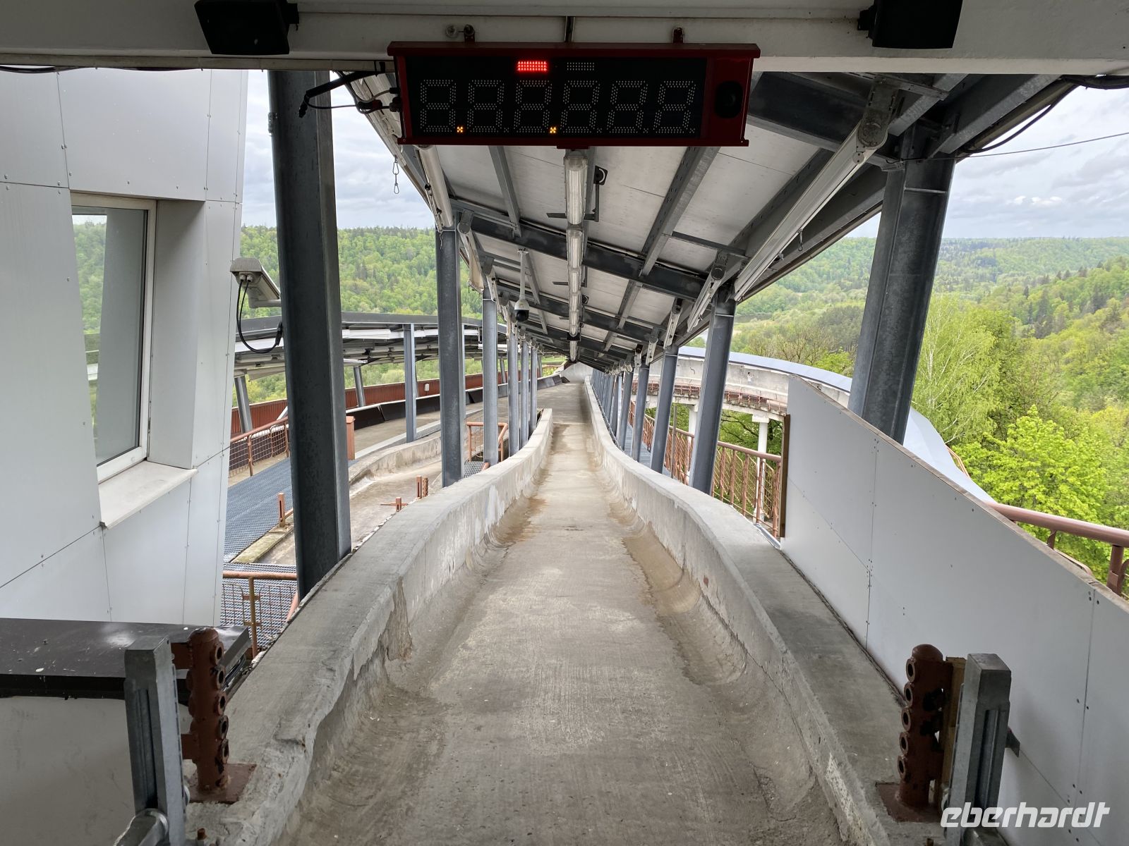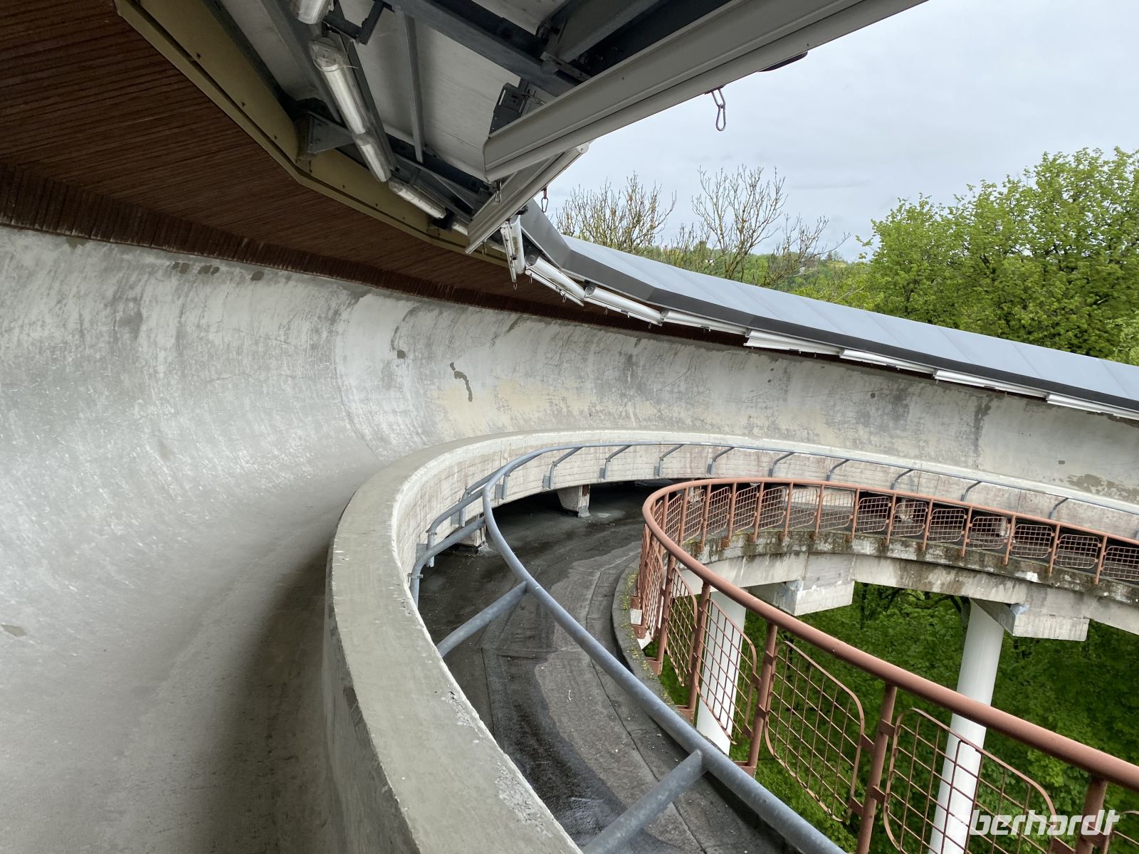 Nach so viel Geschichte und Geschichten erwartet uns nun eine ziemlich überraschende Abwechslung: Nur wenige Kilometer entfernt, hier im Tal, liegt das Bob‑Trainingszentrum von Sigulda. Wir werden herzlich willkommen geheißen und dürfen uns alles aus der Nähe ansehen – ganz aus der Nähe: Wir dürfen tatsächlich vom Startgebäude aus durch die gerade eisfreie Bobbahn laufen!