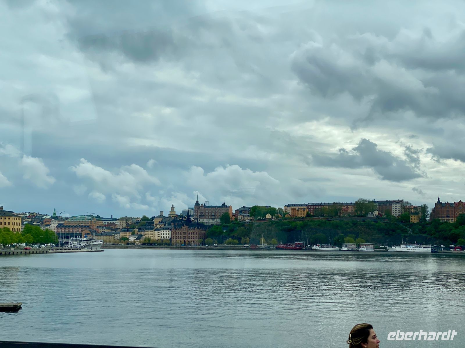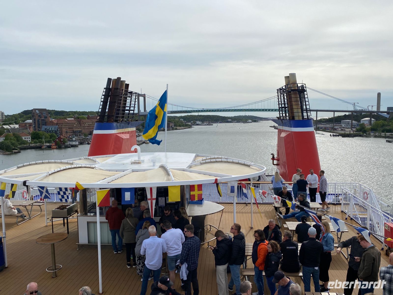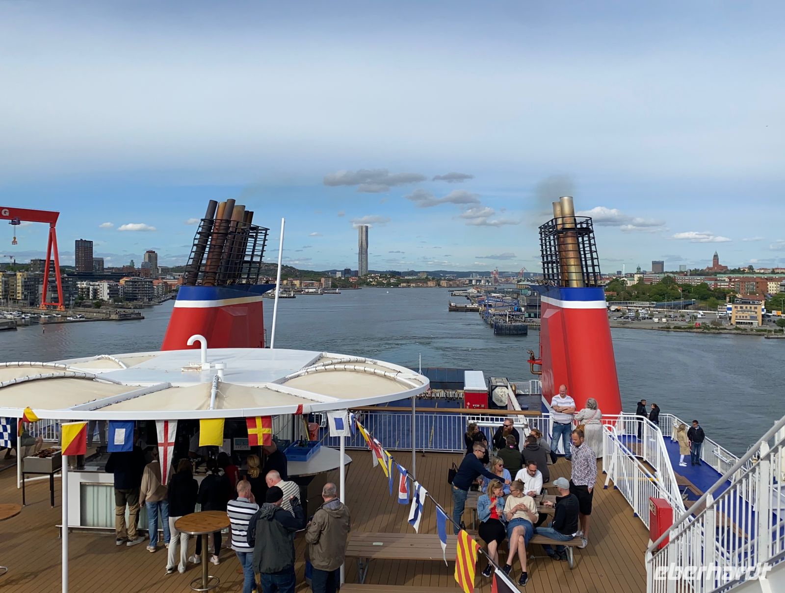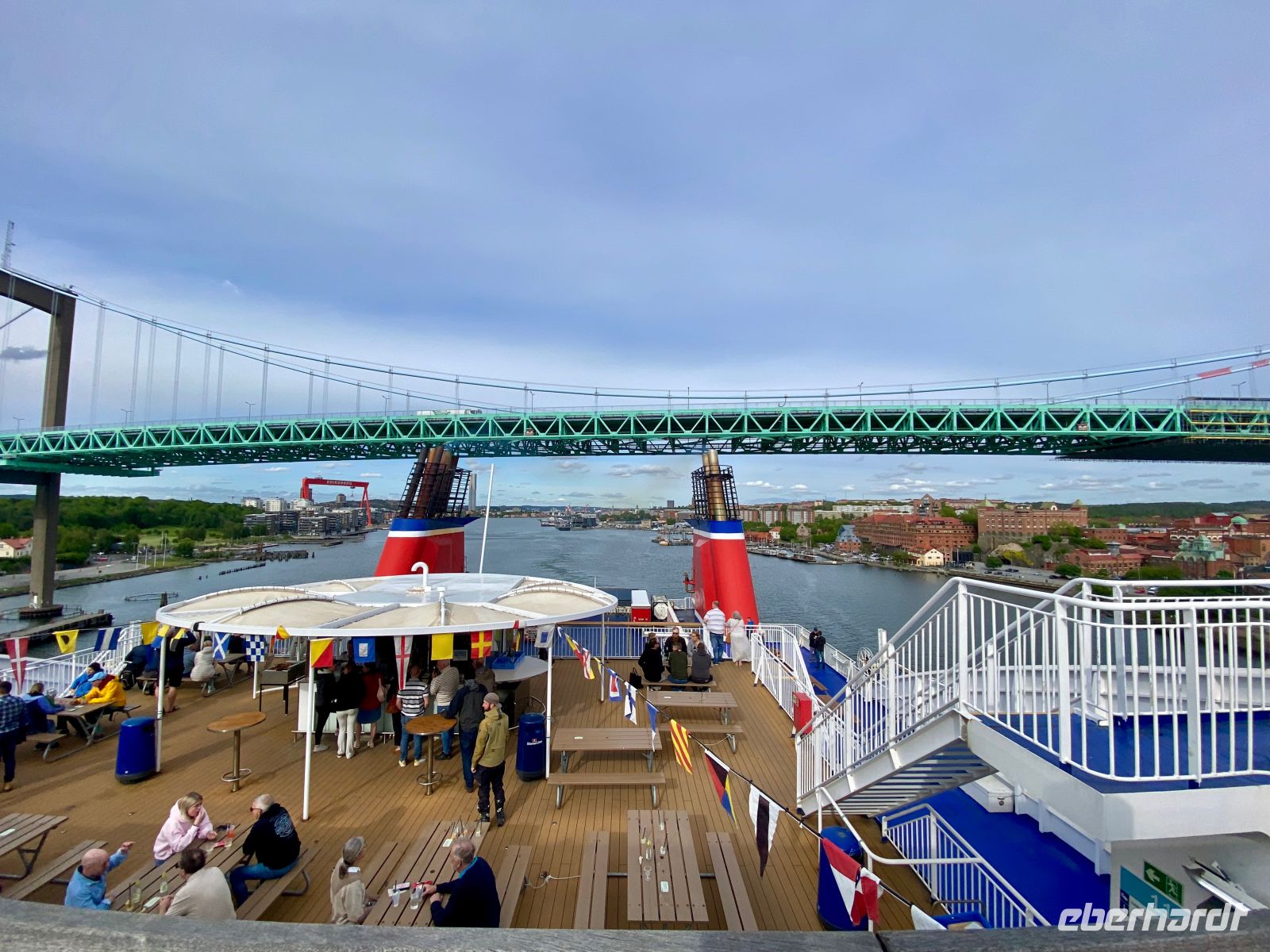Die nächsten Getränke gibt es dann schon am Sonnendeck unseres Fährschiffes. Als wir aus dem Hafen auslaufen, bieten sich uns noch spektakuläre Blicke auf die Älvsborgbrücke, auf Schwedens umstrittenstes Hochhaus und natürlich zurück auf die Anhöhe mit der Masthuggskirche, wo wir kurz zuvor noch waren.