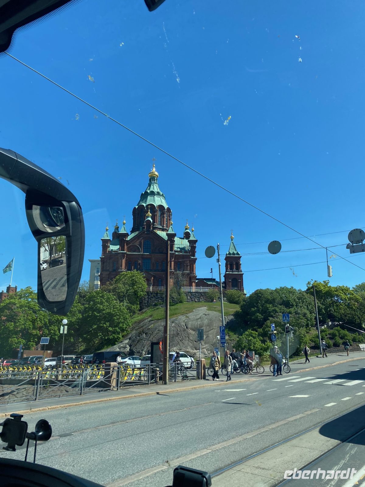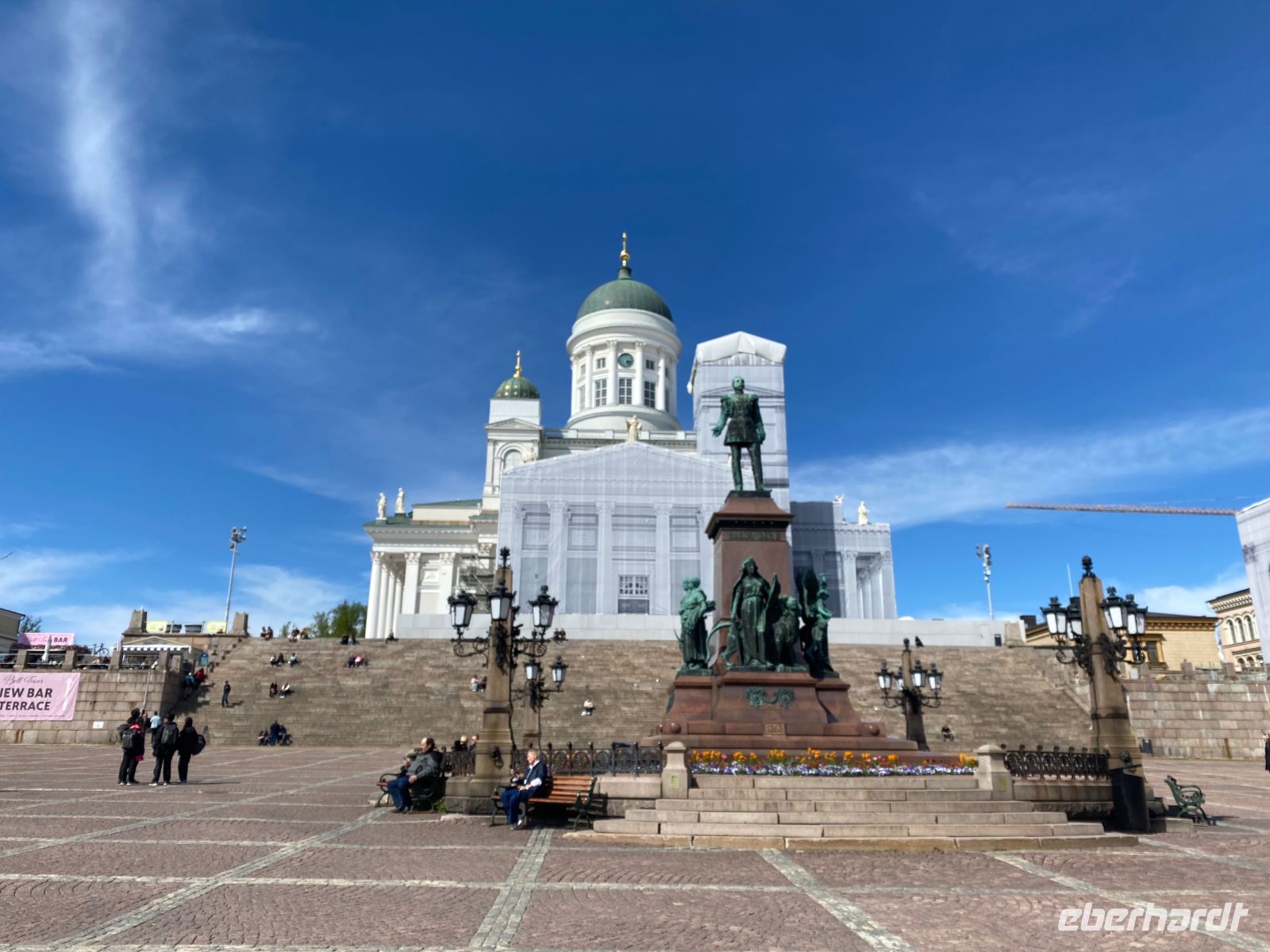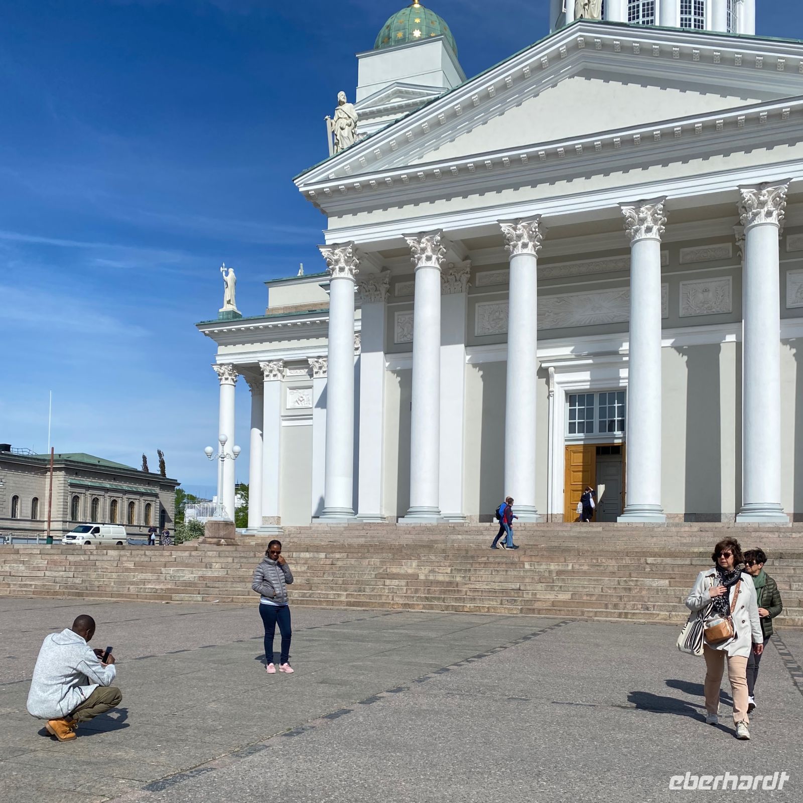 Immer wieder steigen wir aus, um ganz besondere Orte zu Fuß zu besuchen, das Sibelius‑Denkmal und die Felsenkirche gehören dazu. Wir sehen natürlich auch den Senatsplatz, der vom markanten Dom überragt wird, und vieles mehr.