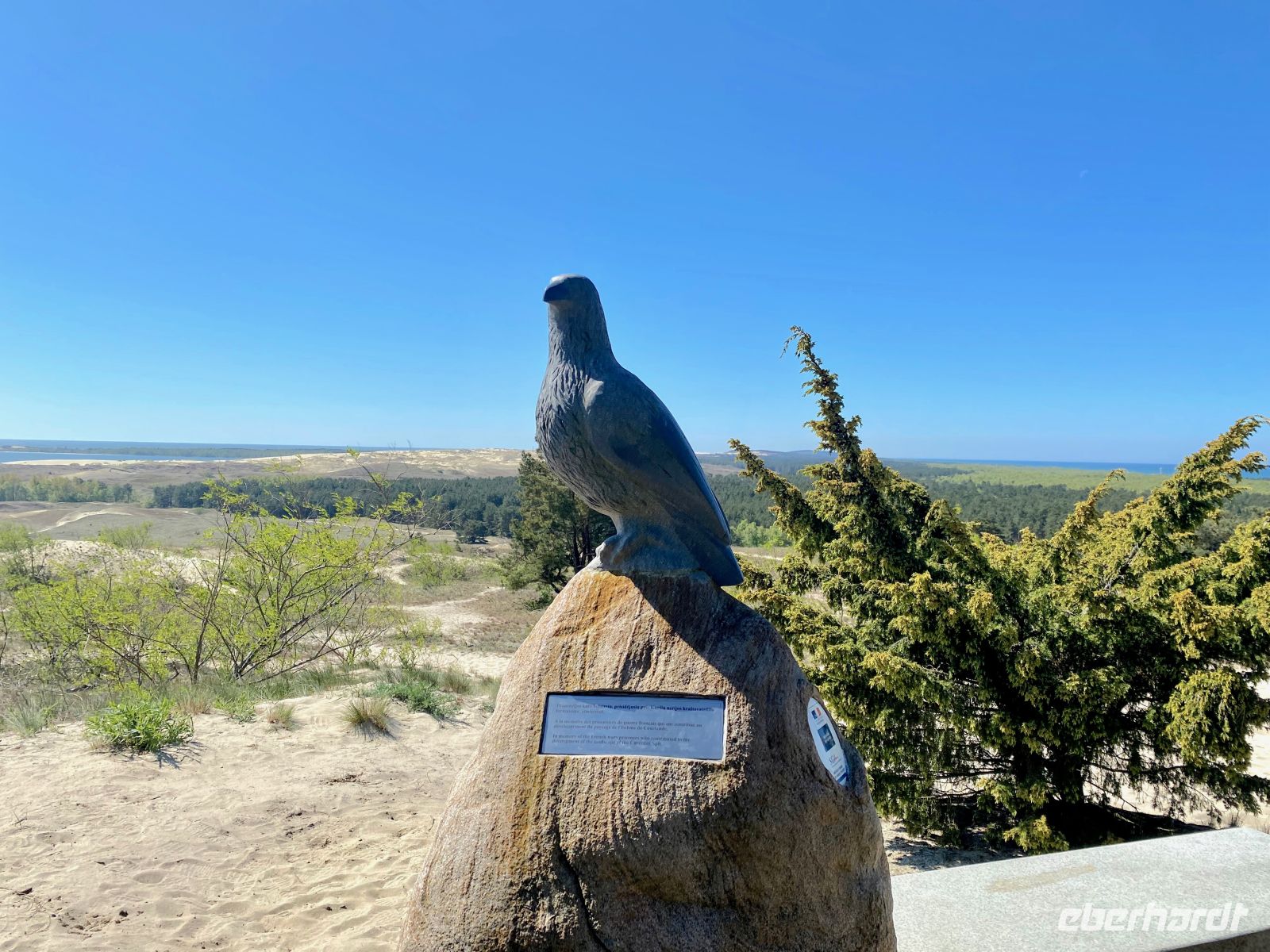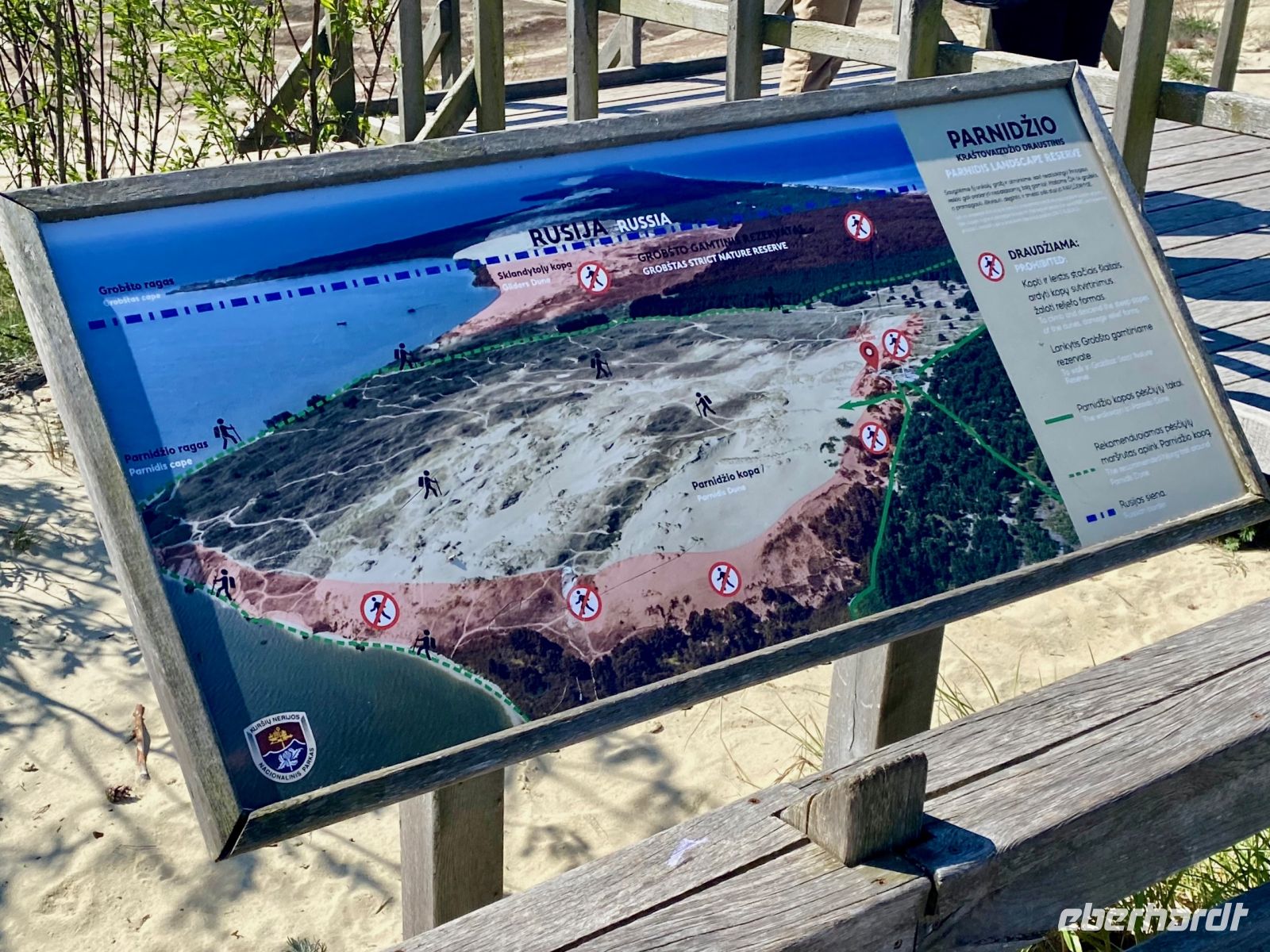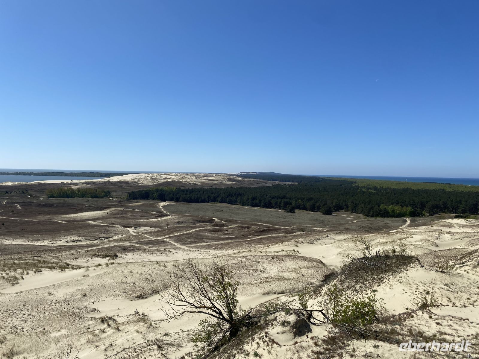 Nach etwas Freizeit mit einem Spaziergang am Haffstrand geht es noch weiter südlich zur Parnidi‑Düne, auch Große Düne genannt. Seit langer Zeit wird dafür gesorgt, dass diese riesige Wanderdüne nicht zu stark erodiert; die neuesten und strengsten Absperrungen hier in letzter Zeit haben jedoch einen anderen Grund. Wir stehen nur noch einen Kilometer vor der Grenze zum russischen Teil der Nehrung, dem Teil des Oblasts Kaliningrad.