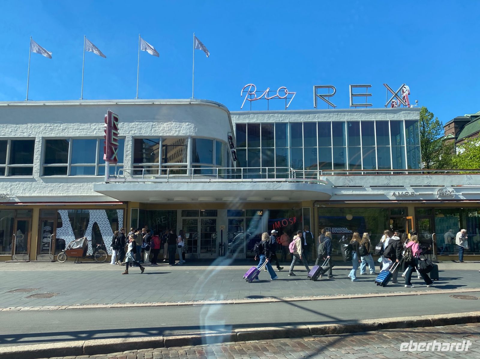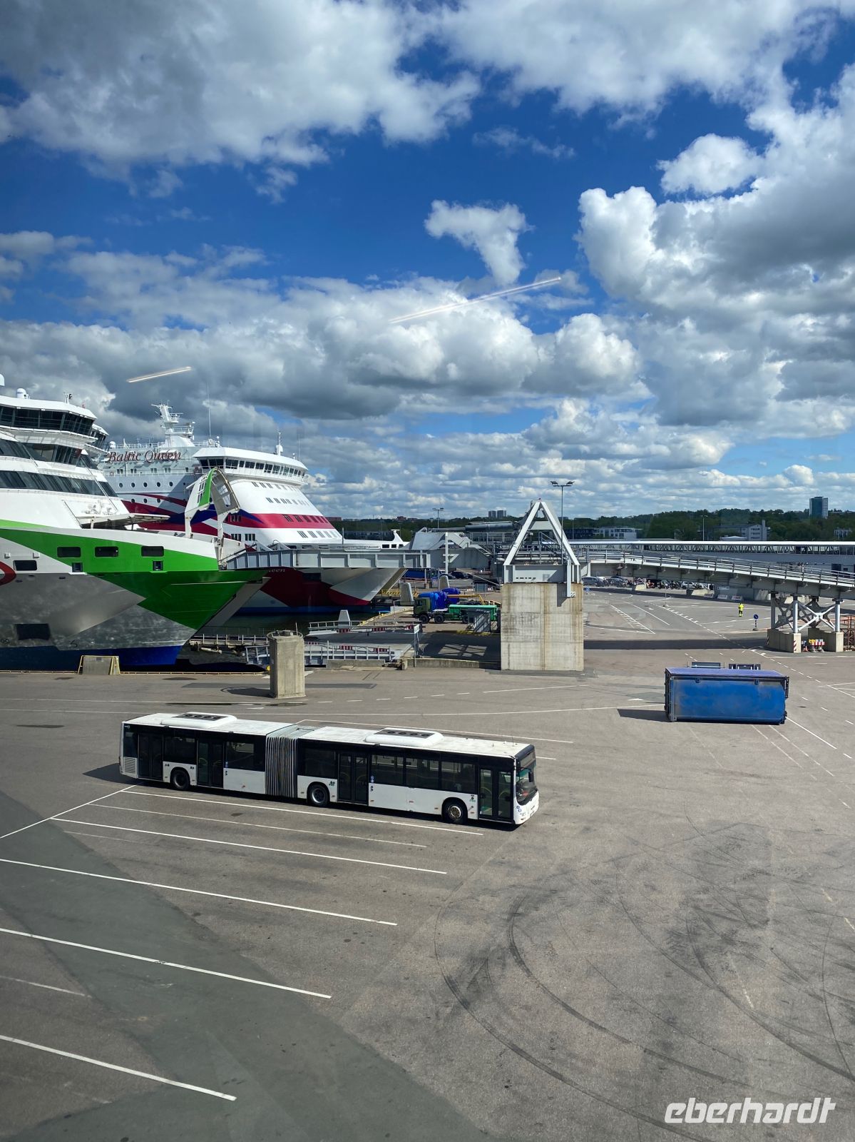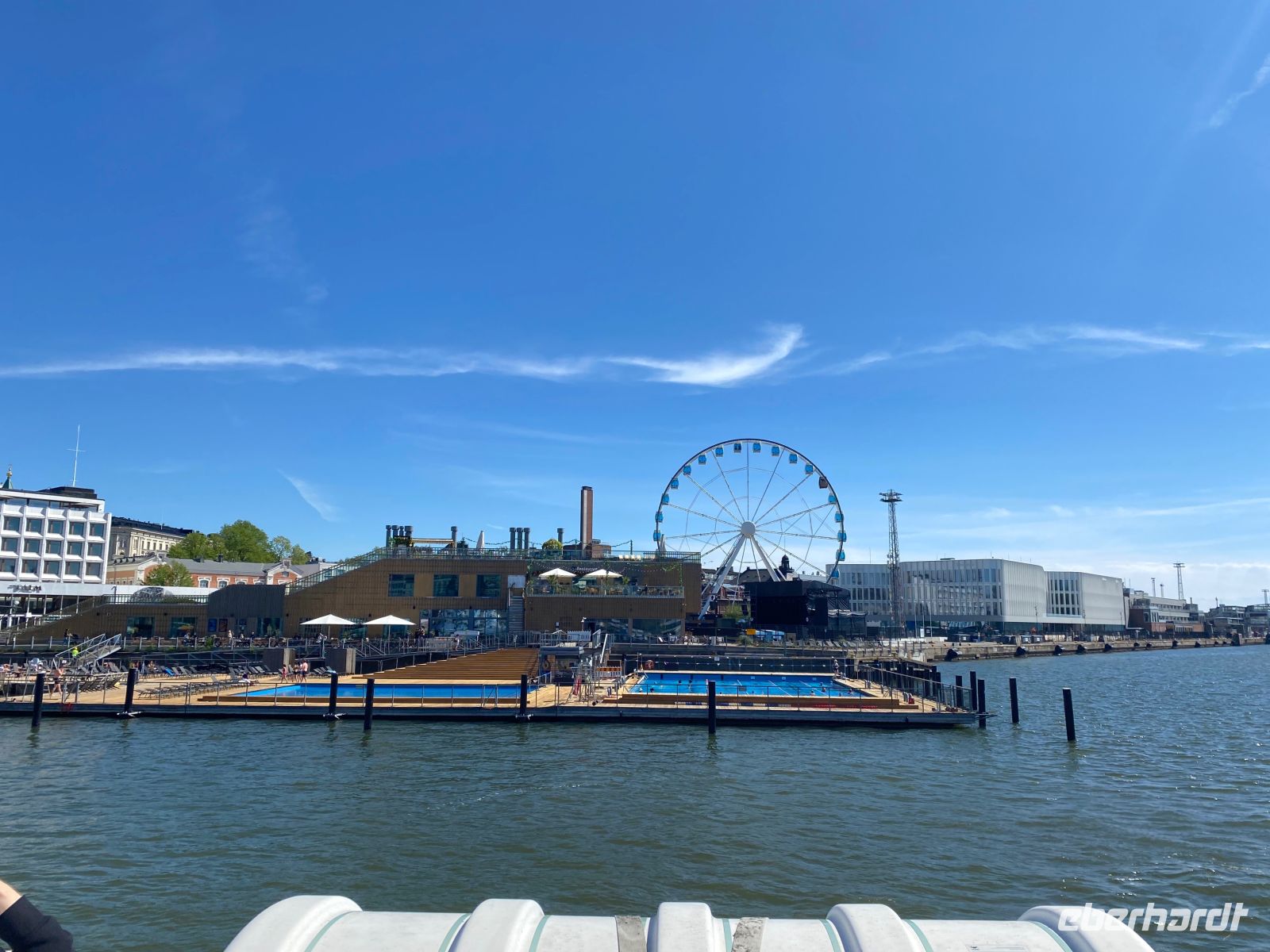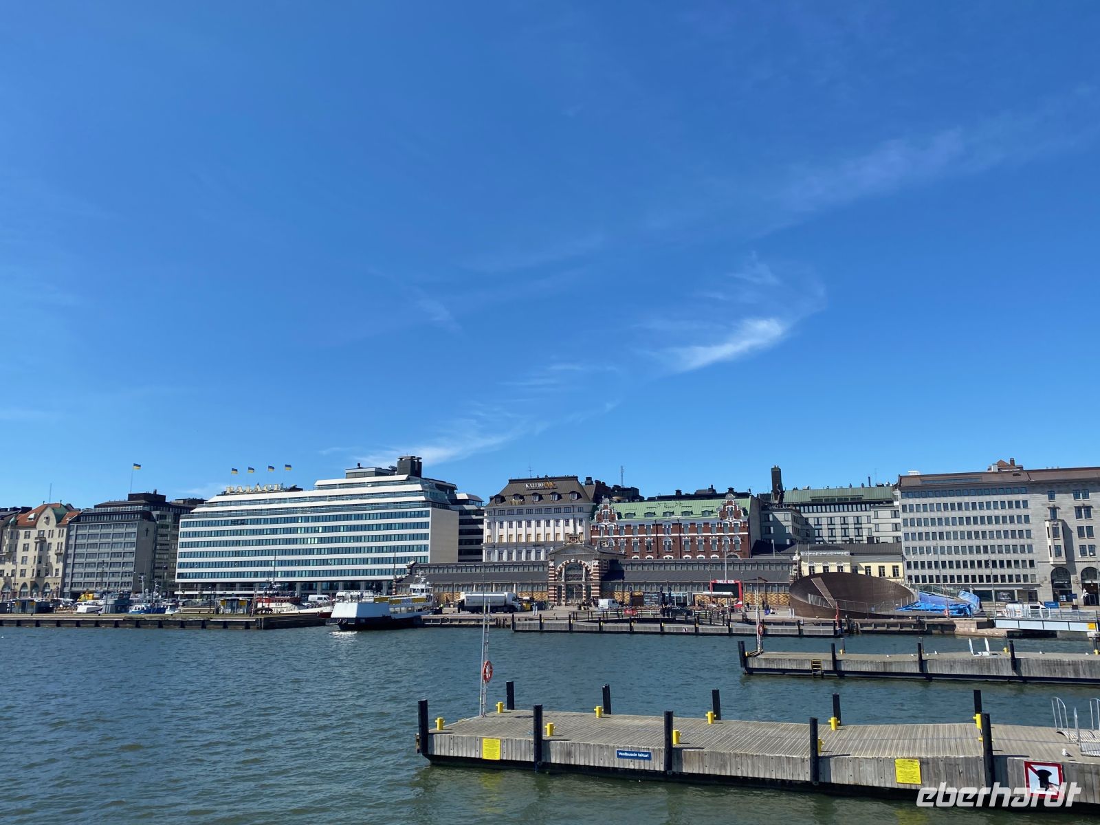 Rechtzeitig für eine schöne Mittagspause sind wir dann wieder in Helsinki. Hier können wir am Südhafen an einem der vielen Marktstände, in der alten Markthalle oder anderswo noch etwas essen, im Freien natürlich, der finnische Vorsommer lässt uns nicht im Stich. Entspannt geht es dann im Bus ein kurzes Stück zum eleganten Olympiaterminal, wo unsere Fähre schon auf uns wartet. Eigentlich muss man sagen: unser Kreuzfahrtschiff – so komfortabel und vielseitig ist unser Schiff.