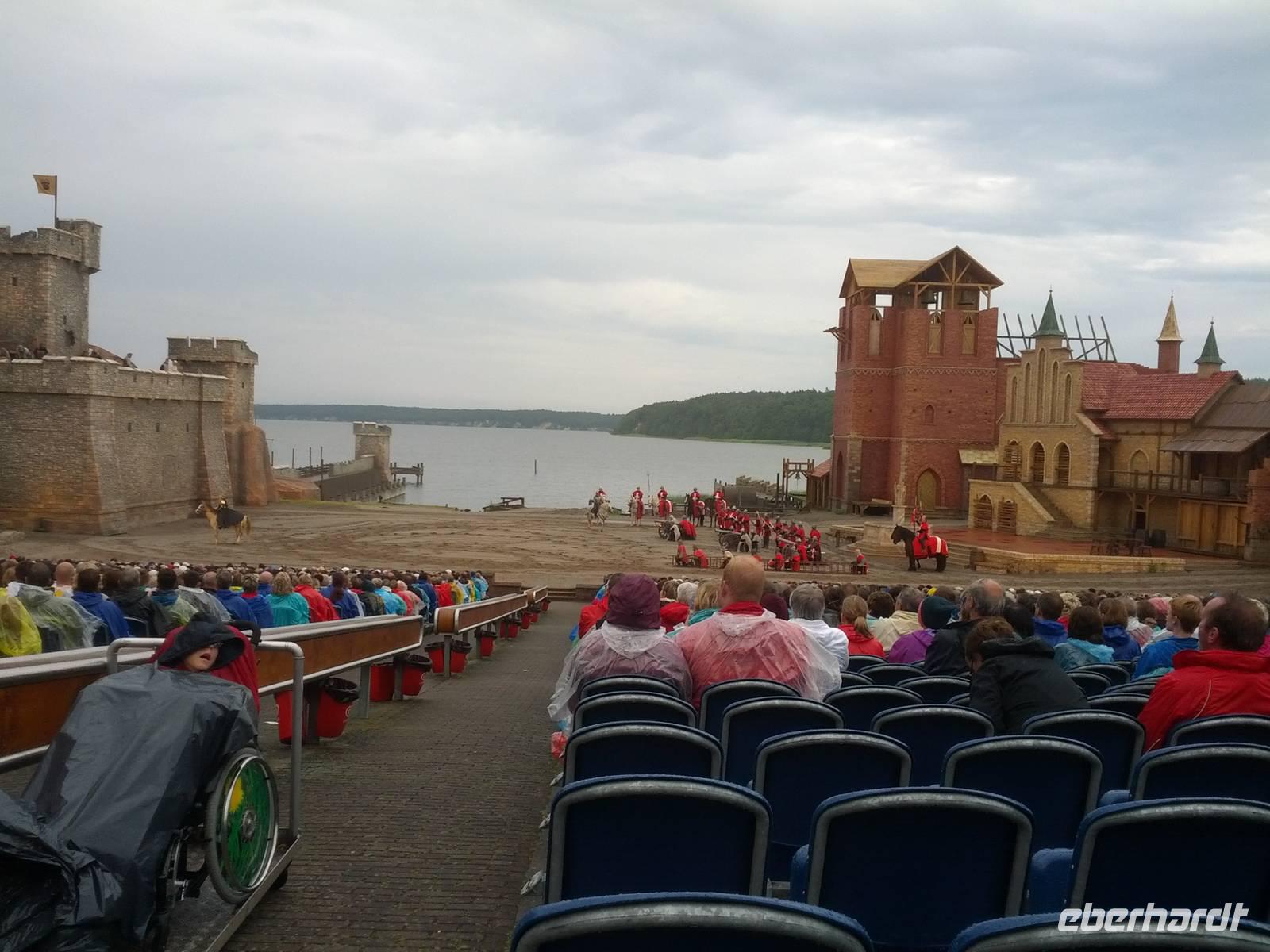Ausgerüstet mit Regenbekleidung dann die Fahrt nach Ralswiek zu den Störtebeker-Festspielen. Etwas missmutig dann dort der Ausstieg bei anhaltendem Regen.