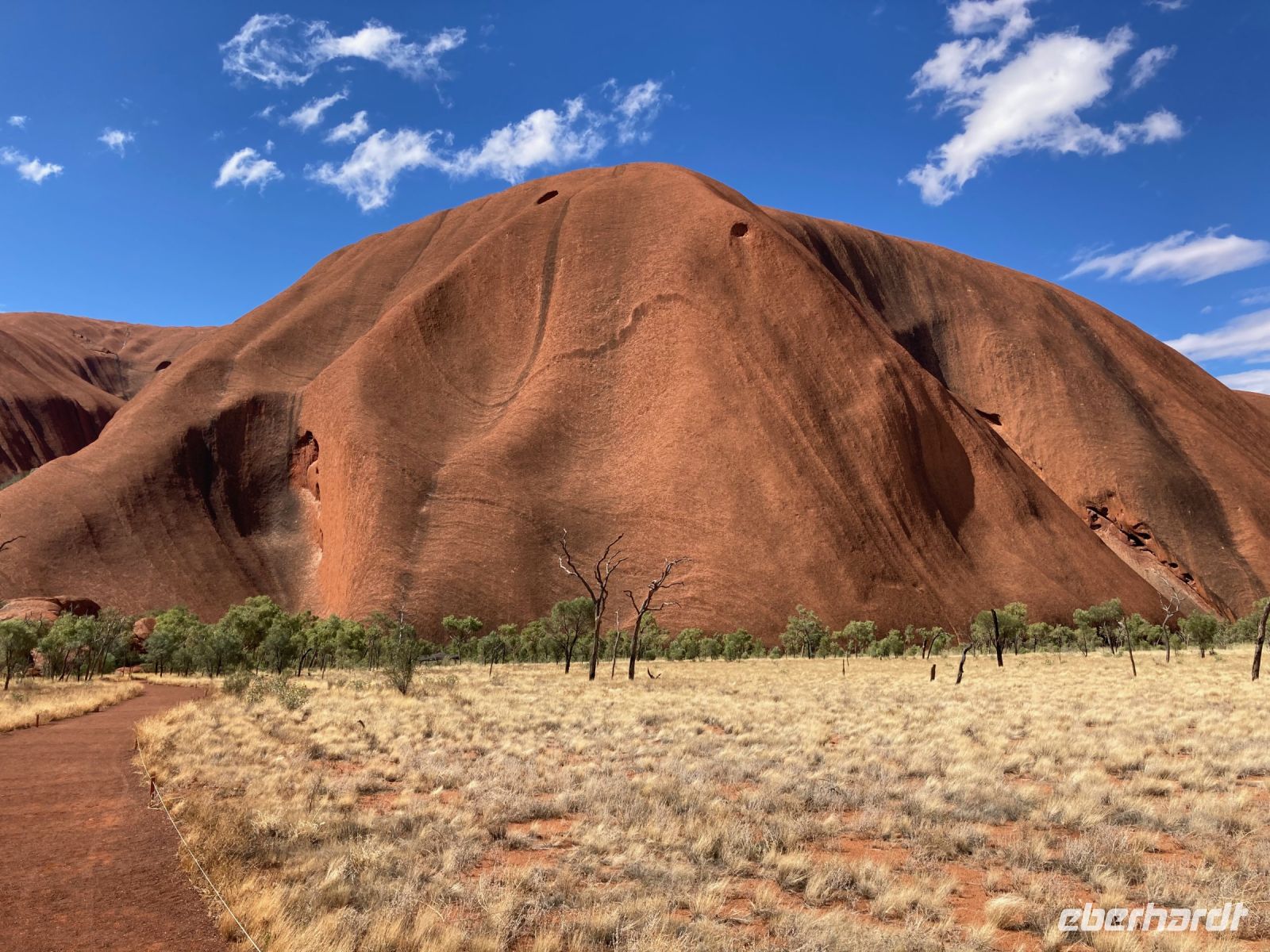 Auf der Karte von Australien liegen Alice Springs und der Uluru ziemlich nah beeinander, doch es sind mehr als 400 Kilometer, die wir zurücklegen müssen. Wir unterbrechen die Fahrt aber in regelmäßigen Abständen, um Road Trains und Emus zu fotografieren, oder an Rasthäusern einen Kaffee zu trinken, ein Sandwich oder ein Eis zu kaufen. Zudem weiß uns Eva mit allerlei Informationen und Kartenmaterial gut zu unterhalten. Zwischendurch wird der Himmel ganz schwarz und wir geraten sogar in ein richtiges Outback-Gewitter. Als wir den Aussichtspunkt am Tafelberg Mount Conner erreichen, sind die Wolken aber wieder weg und es ist wieder wüstentypisch trocken. Dass die Welt sehr klein ist, beweist ein freudiges Zufallstreffen mit zwei Reisegästen, die mit mir auf einer Eberhardt-Reise in Kanada waren, und nun zeitgleich, aber mit einer anderen Gruppe ebenfalls Australien erkunden. Dann erreichen wir den Uluru, der als mächtiger Felsen inmitten des Roten Zentrums vor uns aufragt. Nach einem ersten Fotostopp steuern wir das Aborigine-Kulturzentrum an, in dem schon wir ein paar Geschichten dieser ältesten noch existierenden menschlichen Kultur kennenlernen dürfen. Der Uluru ist aber nicht einfach nur ein Monolith, sondern tatsächlich ein sehr vielseitiges und lohnendes Ausflugsziel. Beim Spaziergang zum Mutitjulu Waterhole bestaunen wir alte Felsmalereien und erfahren von Eva, wie die Geschichte der beiden mythischen Schlangenwesen ausgeht. Auf unserer Entdeckungstour um den Uluru herum sehen wir später weitere Höhlen und Felsformationen, die im Alltagsleben und in der Religion der Ureinwohner eine wichtige Rolle spielten. Unser heutiges Hotel liegt im Touristendorf Yulara, gleich außerhalb des Nationalparks. Viel Zeit zum Ausruhen haben wir nicht, denn es wartet noch ein weiterer Höhepunkt auf uns: das „Sounds of Silence“-Abendessen unter dem australischen Sternenhimmel. Ein Shuttlebus holt uns und andere Gäste vom Hotel ab und bringt uns zu einer kleinen Anhöhe, von der aus wir beim Sektempfang mit kleinen Leckerbissen den Sonnenuntergang beobachten können. Die Sonne geht von uns aus gesehen genau hinter dem Gebirgsmassiv Kata-Tjuta (den Olgas) unter. Bevor es richtig dunkel wird, führt man uns hinunter an unsere Tische, wo das Abendessen stattfindet. Später werden für eine Zeit alle Lichter gelöscht und wir lauschen tatsächlich der Stille des Outbacks. Ein Astronom erklärt uns die wichtigsten sichtbaren Sternbilder des Südsternhimmels und zeigt uns das Band der Milchstraße, die Andromeda-Galaxie und die Magellanschen Wolken. Und wir sehen ein paar Sternschnuppen und dürfen uns etwas wünschen!
