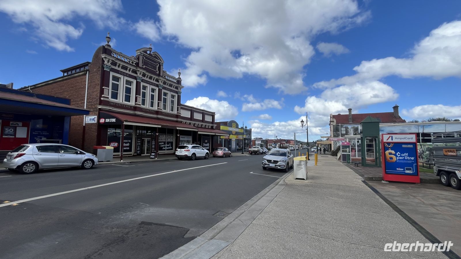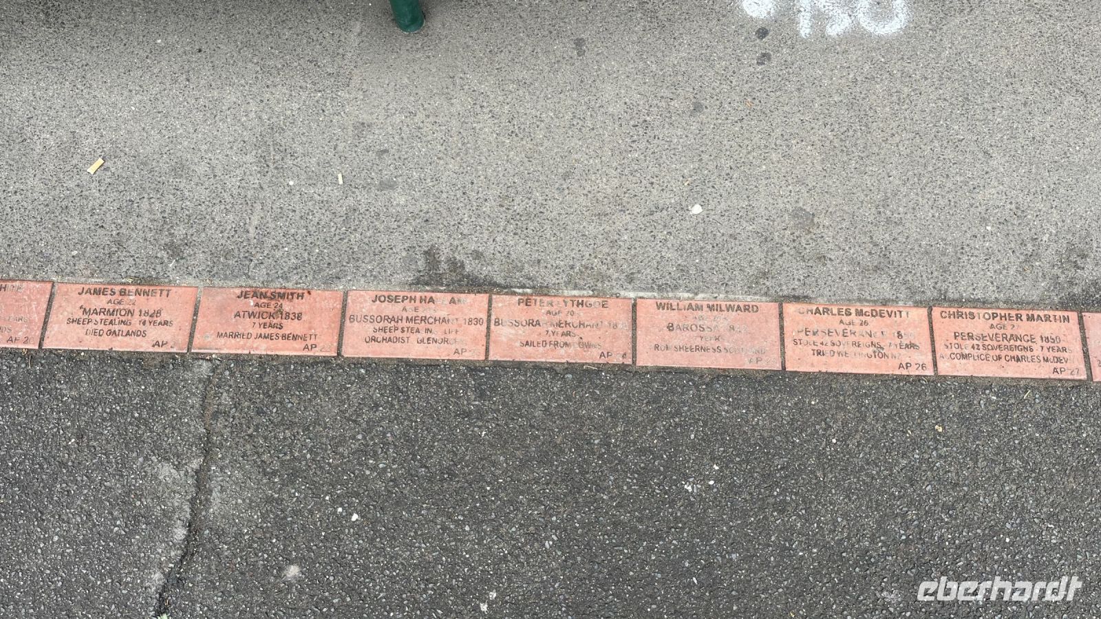 In Campbell Town legen wir den nächsten Stopp ein. Hier schauen wir uns die Straßen an, in deren Gehweg Ziegelsteine eingelassen sind, die die Namen, Verurteilungen und Strafjahre ehemaliger Sträflinge zeigen – ein eindrucksvolles Denkmal, das an die Zeit erinnert, als Tasmanien noch eine britische Strafkolonie war.