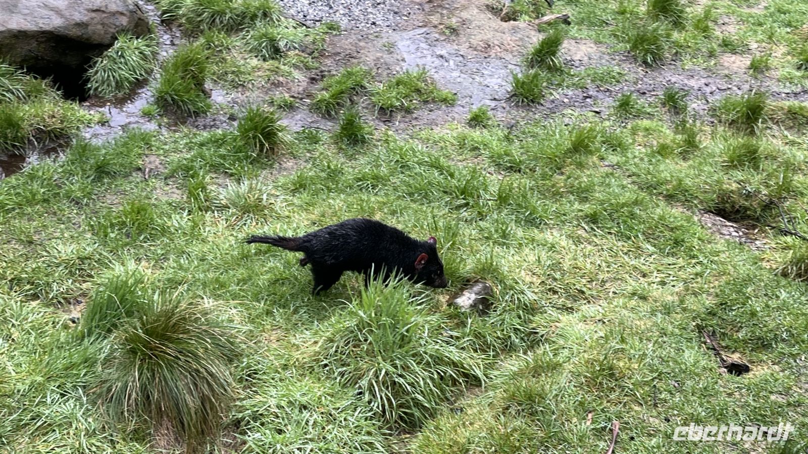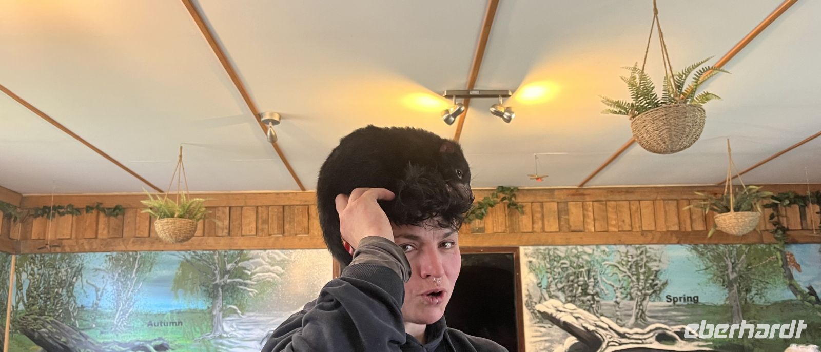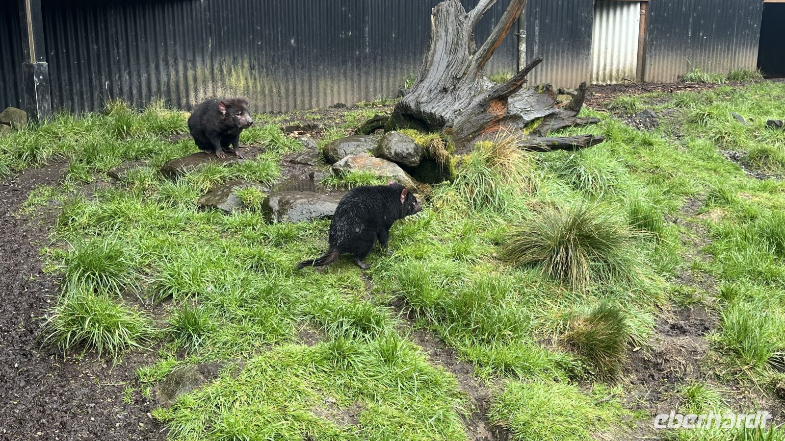 Am Nachmittag klart das Wetter etwas auf, und wir machen uns auf den Weg zur Aufzuchtstation „Devils at Cradle“. Hier erfahren wir viel über die bedrohten Tasmanischen Teufel und Beutelmarder, die nur auf dieser Insel vorkommen. Unser Guide führt uns zunächst zu den jungen Tieren, die in der Station aufgezogen werden, und erklärt uns, wie wichtig dieses Schutzprojekt ist, um die Art vor dem Aussterben zu bewahren. Draußen beobachten wir in den Gehegen die erwachsenen Teufel, die mit ihrem kräftigen Kiefer und ihrem lauten Fauchen durchaus beeindruckend wirken. Der Besuch ist spannend und lehrreich zugleich und gibt uns einen faszinierenden Einblick in Tasmaniens einzigartige Tierwelt.