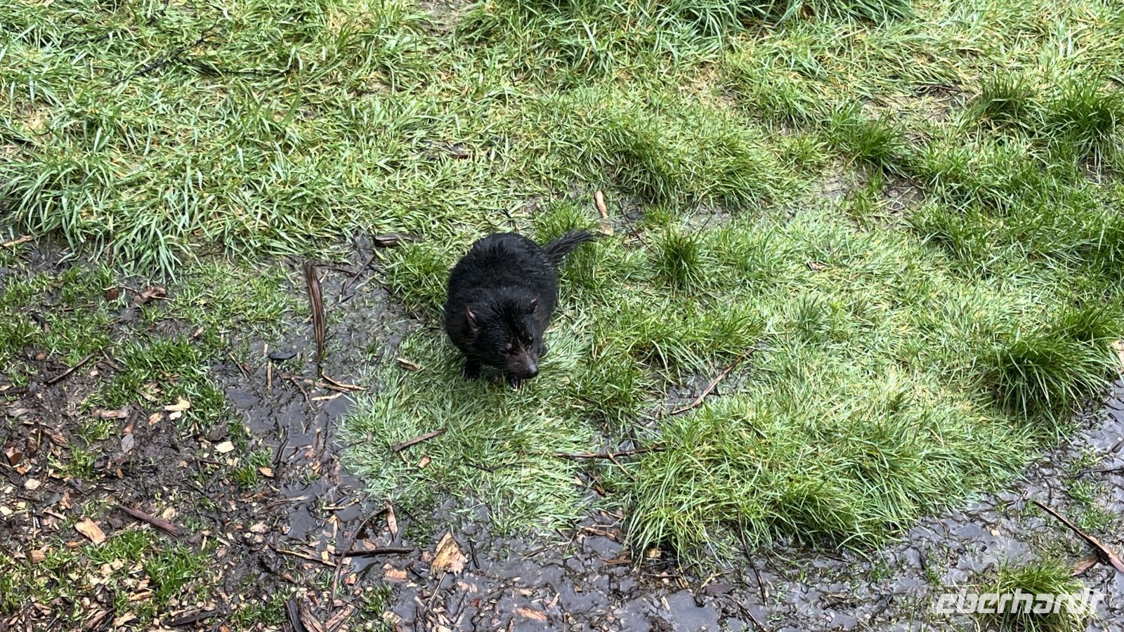 Zum Abendessen kehren wir in eine gemütliche Taverne ein, wo wir uns am warmen Kaminfeuer aufwärmen. Doch bevor wir in das Lokal gehen wartet noch eine Überraschung auf uns: Direkt vor dem Parkplatz läuft ein Wombat gemächlich über die Wiese. Ganz unbeeindruckt vom Wind schnuppert er im Gras – ein weiteres Highlight unseres Tages! Einige von uns schließen sich später noch Marina und mir an zu einem kleinen Spaziergang entlang des „Enchanted Walk“, einem zauberhaften Pfad am Flussufer. Im sanften Dämmerlicht glitzern Regentropfen auf den Farnen, und wir lauschen dem Rauschen des Wassers – ein friedlicher Abschluss eines stürmischen, aber erlebnisreichen Tages im Herzen der tasmanischen Wildnis.