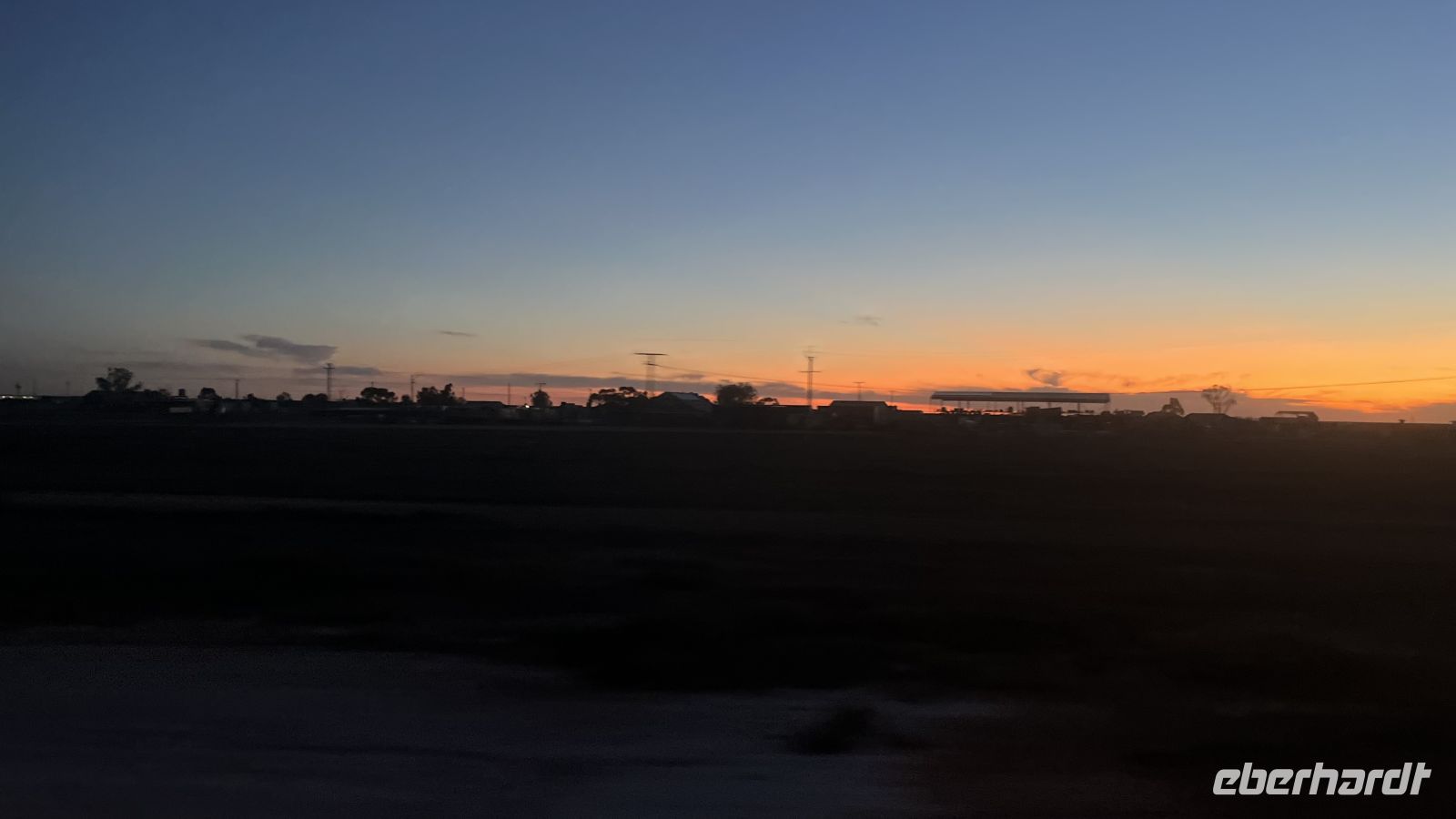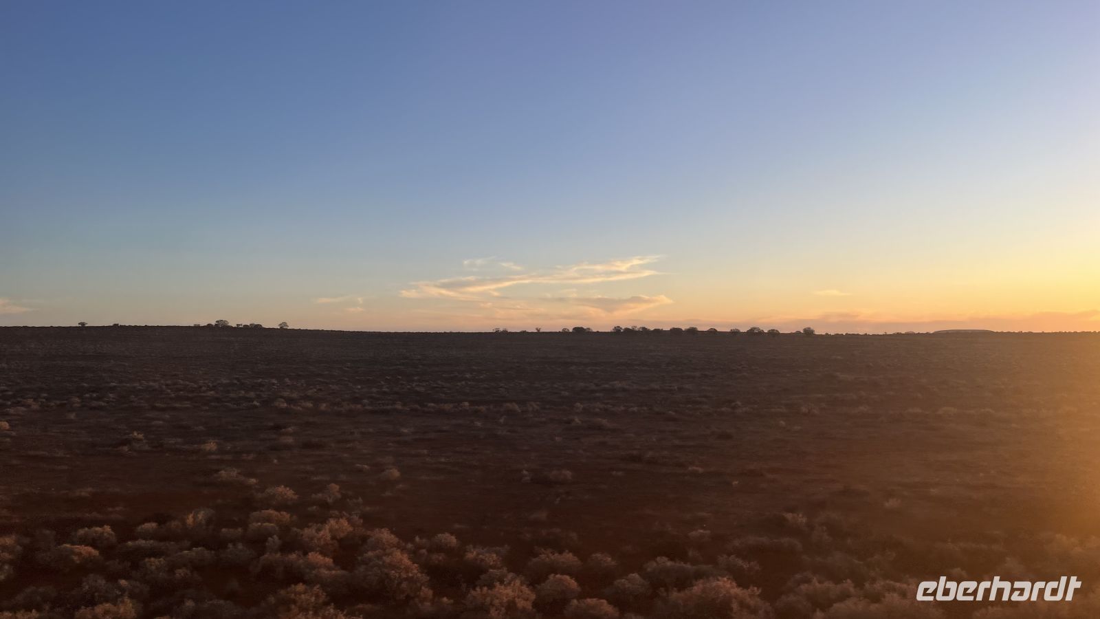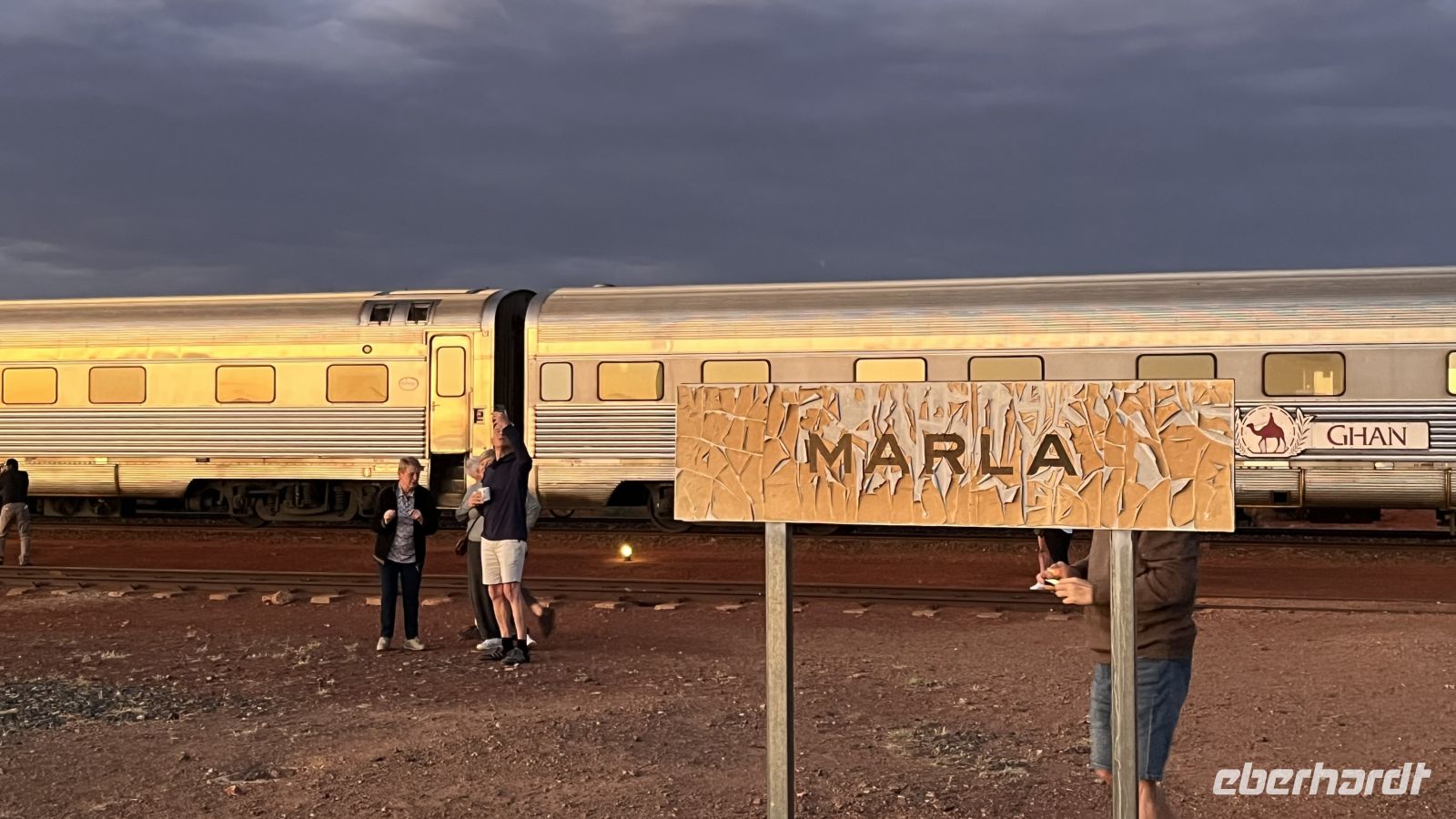 Noch vor Sonnenaufgang, gegen 6 Uhr morgens, hält der Ghan auf offener Strecke im winzigen Outback-Ort Marla. Wir steigen aus und genießen bei einer Tasse heißen Kaffees und kleinen Snacks den Beginn eines neuen Tages mitten im roten Zentrum Australiens. Die Stille ist beeindruckend – nur das Zirpen der Insekten und das Knirschen des Sandes unter den Füßen sind zu hören, während die Sonne langsam über dem Horizont aufgeht und das Outback in warmes, goldenes Licht taucht – ein unvergesslicher Moment.