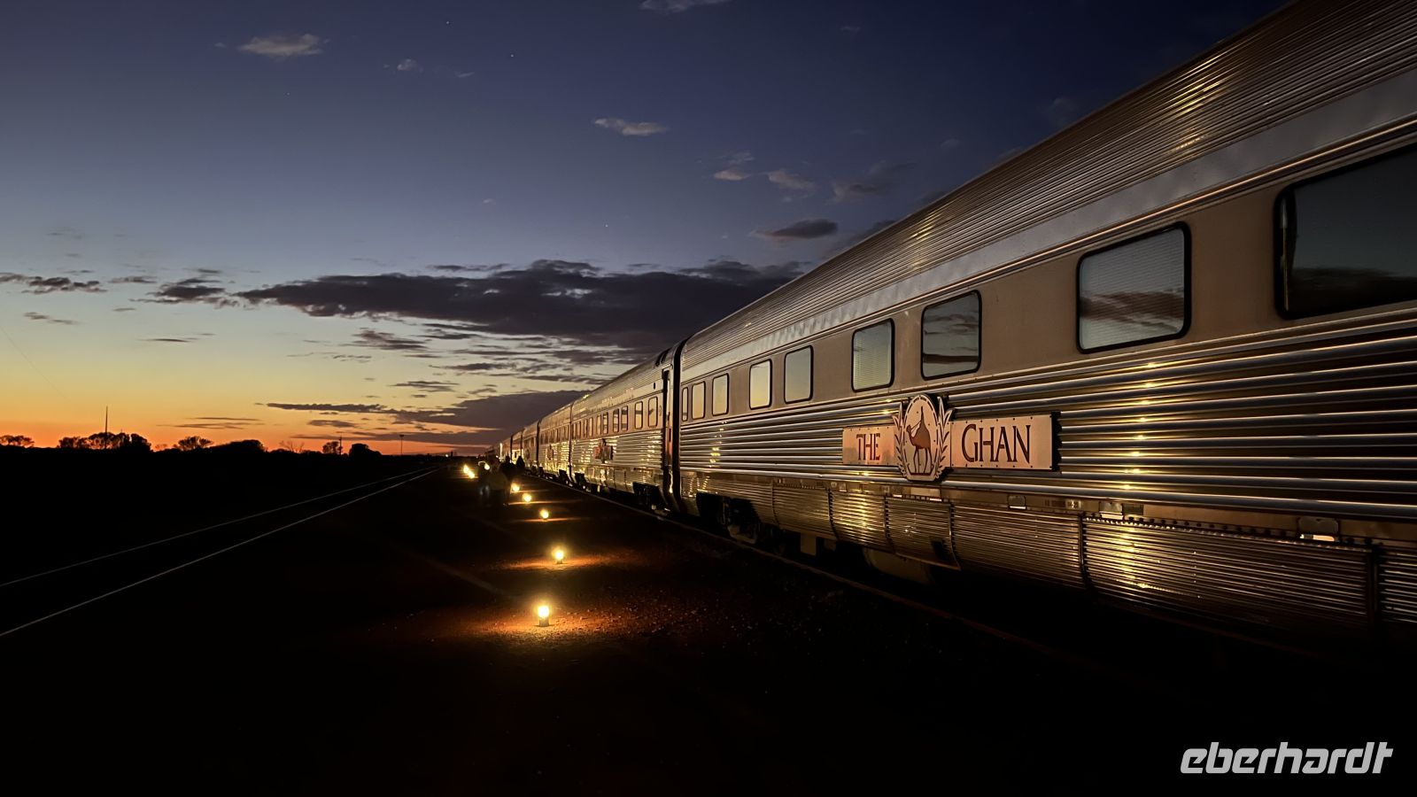 Nachdem das Gepäck verladen ist, beziehen wir unsere Kabinen, die trotz ihrer kompakten Größe gemütlich und stilvoll eingerichtet sind. Kurz darauf setzt sich der Zug in Bewegung – und das Abenteuer durch das australische Outback beginnt.