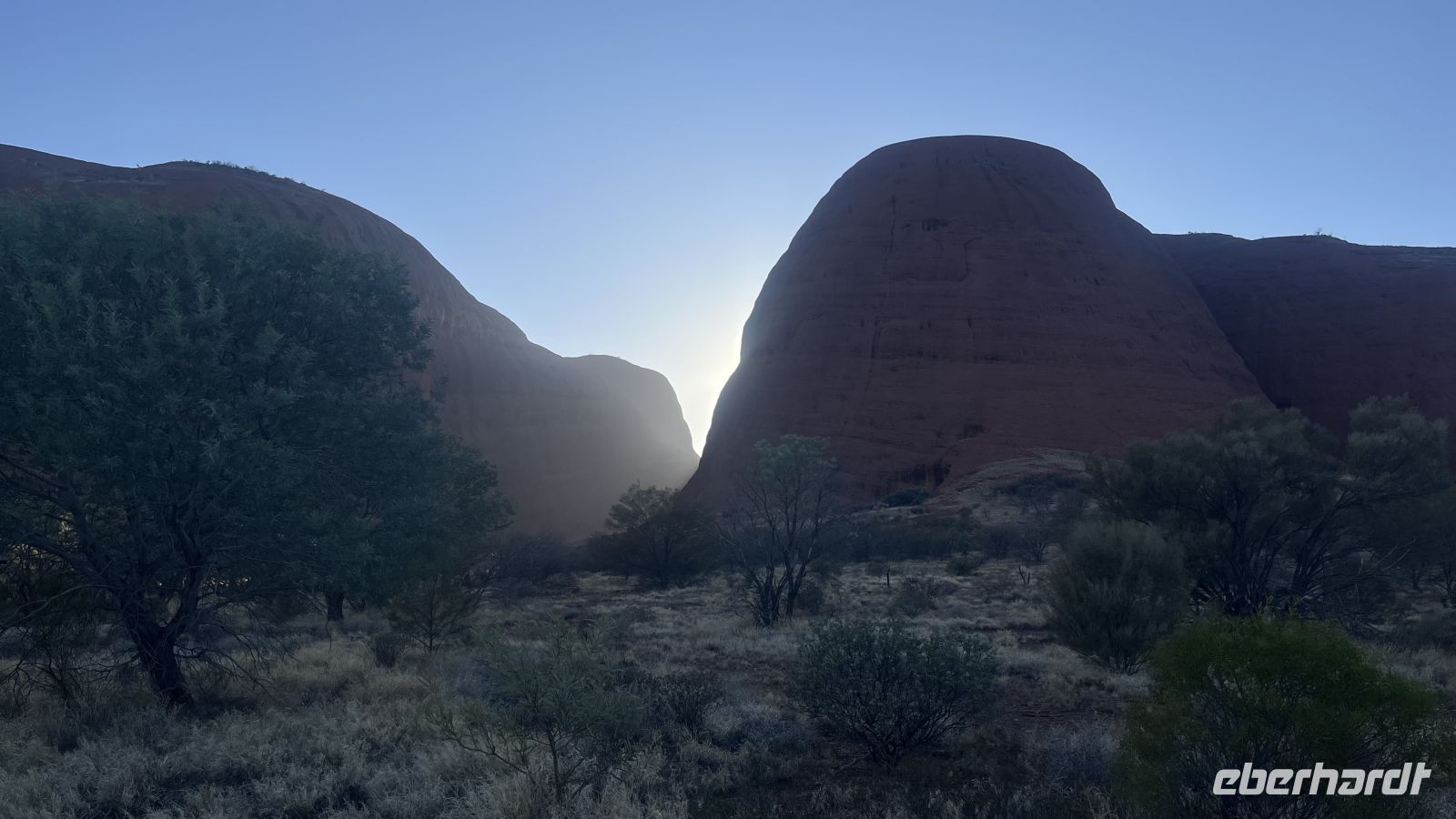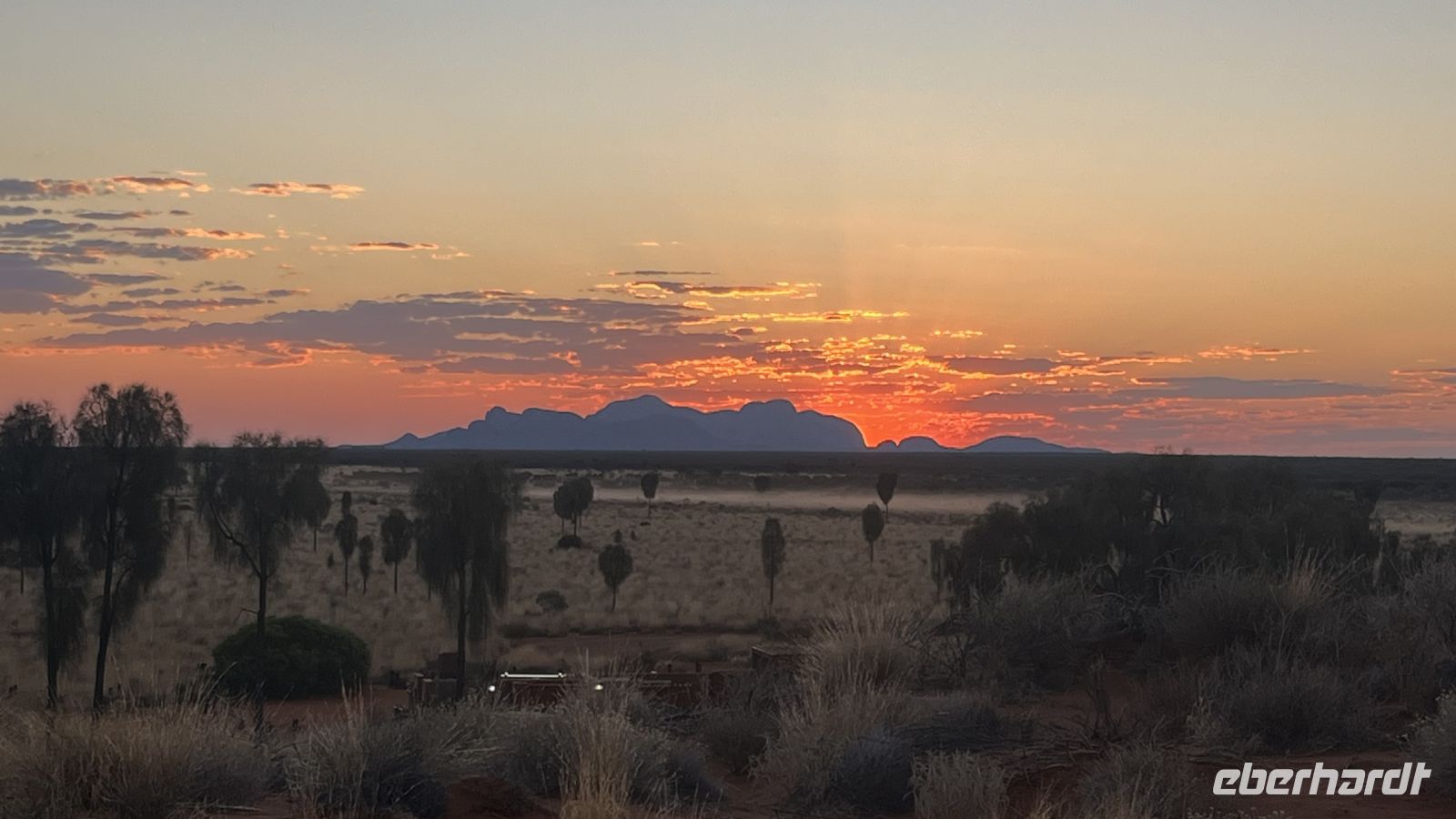 Noch vor dem Frühstück brechen wir in aller Frühe auf, um den Sonnenaufgang am Uluru zu erleben – ein weiterer Höhepunkt unserer Reise. Von einer Aussichtsplattform aus beobachten wir, wie die ersten Sonnenstrahlen den gewaltigen Monolithen in immer neue Farbtöne tauchen – von tiefem Rot bis hin zu leuchtendem Orange. Die klare Morgenluft und die Stille des Outbacks machen diesen Moment besonders eindrucksvoll.