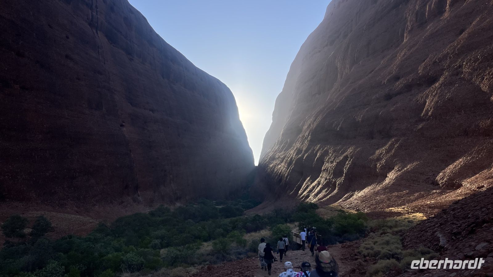 Gegen Mittag erreichen wir Yulara, geben unser Gepäck im Hotel ab und machen uns gleich auf den Weg zum Uluru, dem heiligen Berg der Anangu. Im Besucherzentrum erfahren wir mehr über die kulturelle und spirituelle Bedeutung des Monolithen, bevor wir bei mehreren kurzen Spaziergängen rund um den Uluru die faszinierenden Strukturen aus nächster Nähe erleben. Die Sonne brennt heiß – fast 40 Grad – und wir staunen, wie intensiv die Farben des Gesteins je nach Lichteinfall leuchten. Besonders schön ist der Halt am Mutitjulu-Wasserloch, einer kleinen, schattigen Oase am Fuße des Felsens, die immer und zu jeder Jahreszeit Wasser beinhaltet.