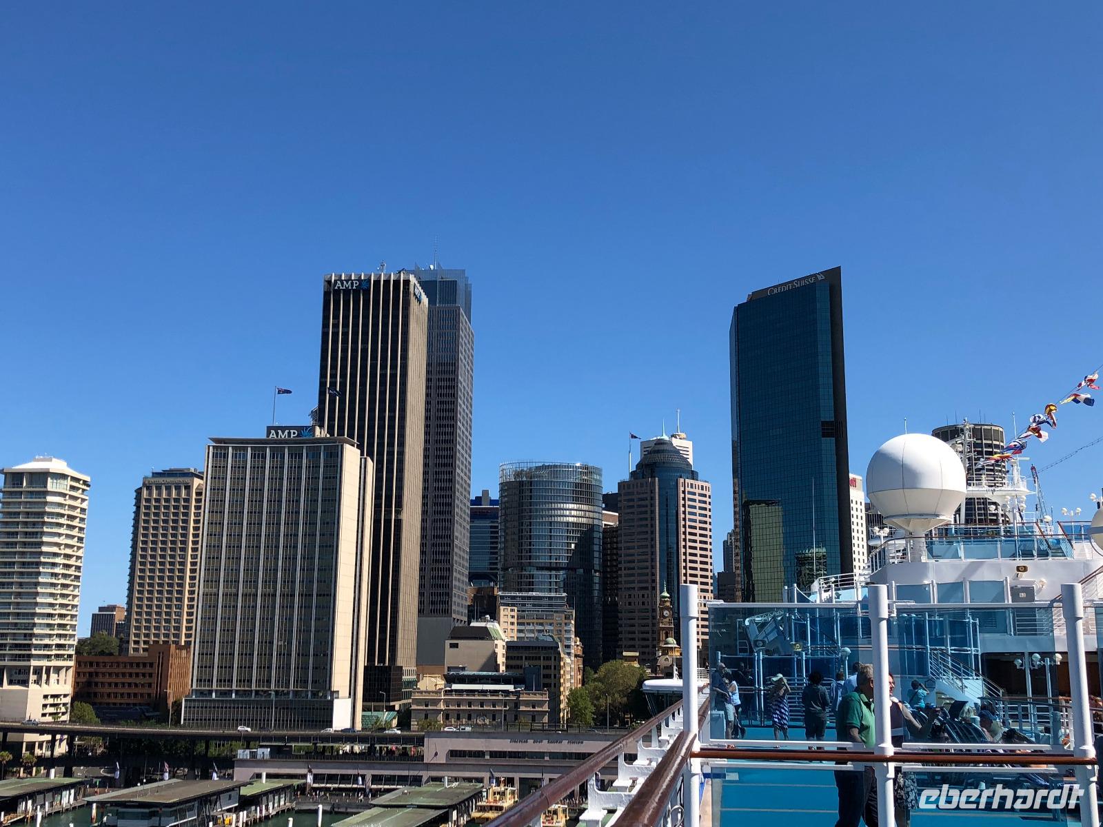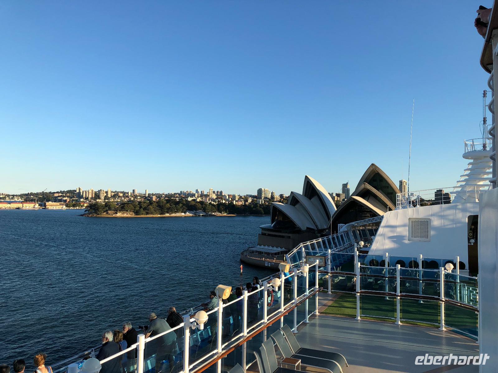 Die Sonne verwöhnt uns :-) Heute wird es rund 19 bis 24 Grad warm, auch wenn es uns noch wärmer vorkommen wird. Nach einem leckeren Frühstücksbuffet checken wir im Hotel aus, unsere Koffer werden an der Rezeption sicher aufbewahrt. Um 09. 30 Uhr spazieren 17 Reisegäste und eine Reisebegleitung gemeinsam zum Sydney Opera House. Die Gäste haben vor Ort eine deutschsprachige Führung im Opera House gebucht, welche von unserer örtlichen Agentur organisiert und bei Eberhardt TRAVEL in Euro bezahlt wird. Unsere private Führung startet um 10.45 Uhr. Die Führung mit Reiseleiterin Gabi erfolgt mit Audioguide, was wirklich angenehm ist und Begeisterung bei den Gästen hervorruft. Größere Taschen und Rucksäcke sowie Jacken können vor Ort abgegeben werden. Größtenteils dürfen wir bei der einstündigen Führung in den Räumen Innenaufnahmen vornehmen. Sollte dies einmal nicht erlaubt sein, dann sagt uns Gabi Bescheid. Der Bau der Oper nach dem Entwurf des dänischen Architekten Jørn Utzon dauerte von 1959 bis 1973. Das Opernhaus besteht aus fünf Räumen: Die Konzerthalle, das Operntheater, das Dramatheater, das Playhouse und das Studiotheater. Der erste Raum, welchen wir uns anschauen, ist das Studiotheater. Dieser Raum sollte ursprünglich ein Fahrstuhl sein, welcher zur Bühne der Konzerthalle über uns führen sollte. Aber diese Idee wurde wieder verworfen, da das Podium und die Segel schon gebaut waren, der Bau der zwei großen Hallen hatte aber noch gar nicht begonnen. Zu dem Zeitpunkt wurde beschlossen, die Oper in den kleineren Raum zu verschieben, wo sie sich noch heute befindet. Das Studiotheater mit seinen 364 Sitzplätzen wird oftmals für Kabarett, Talkshows oder politische Tagungen verwendet. Das Playhouse umfasst 398 Sitzplätze. Hier lassen wir uns die Entstehung der Oper in einem Film in deutscher Sprache zeigen. Nächster Raum ist das Dramatheater mit 544 Sitzen. Hier haben wir eine gute Sicht über den Hafen. Weitere Stationen sind die Konzerthalle mit 2.700 Sitzplätzen und das Operntheater Joan Sutherland Theatre mit 1.547 Sitzplätzen. Die Konzerthalle wird ausschließlich für Konzerte genutzt. Oftmals findet in der Oper gerade eine Probe statt, so auch bei unserer heutigen Führung. Die Führung ist wirklich großartig, alle Räume sind auf ihre Art und Weise etwas Besonderes. Den "Utzon Room" können wir allerdings nicht anschauen. Folglich sehen wir diesen Raum nicht von innen. Utzon wurde 1990 angesprochen, beim Umbau des Opernhauses zu helfen. Persönlich ist er nicht nach Sydney zurückgekehrt, aber er hat Ideen und Entwürfe gesandt. Der "Utzon Room" wurde als erster Raum umgebaut. Beispielsweise wurde der Fußboden angehoben, der grüne Teppichboden durch einen Holzboden ersetzt und die Holzverkleidung entfernt, da Utzon der Ansicht gewesen sein soll, "weniger ist mehr". Dann wurde ein von Utzon selbst entworfener Wandbehang gewebt und angebracht. Der Wandteppich ist eine Hommage an Carl Philipp Emanuel Bach, Utzon hat sich von Bachs Hamburger Symphonien inspirieren lassen. Dabei soll Schwarz rhythmisch sein mit den verschiedenen Farben und Musikinstrumenten und auch mit dem Gelb der Violinen zusammenspielen. Durch das Textil des Wandbehangs soll die Akustik in dem Raum sehr gut sein. Im Jahre 2006 wurde im westlichen Foyer die Kolonnaden und Fenster nach Utzons Idee umgebaut. Seit 2007 steht das Opernhaus auf der Liste des UNESCO-Weltkulturerbes, noch zu Lebzeiten des Architekten. Das Besondere ist, dass es einerseits das jüngste Gebäude der australischen Geschichte war, welches zum Weltkulturerbe ernannt wurde, auf der anderen Seite lebte auch der Architekt noch. Selbst war Utzon nicht nochmals in Sydney, aber sein Sohn Jan besucht sie in regelmäßigen Abständen, damit die Ideen seines Vaters richtig interpretiert und umgesetzt werden. Wir bedanken uns bei Gabi. Nach der Führung spazieren wir wieder zum Hotel zurück, wo wir uns gegen 13.45 Uhr mit unserer Reiseleiterin Karin treffen. Alle unsere Koffer sind mit den Papier-Kofferanhängern in einer Plastikhülle von Princess Cruises versehen, welche die Gäste circa drei Wochen vor Abreise von Eberhardt TRAVEL erhalten haben. Die Koffer sind selbst rund 100 Meter um die Ecke vom Hotel herum zu "fahren", wo wir von unserem Busfahrer abgeholt werden. Hier wartet ein weitere Überraschung auf die Gäste :-) Sie erhalten eine Kostprobe des leckeren Rum namens Bundaberg, welchen wir aus roten und blauen Plastikbechern trinken. Für Nicht-Alkohol-Trinker hat die Reisebegleitung köstliche Cadbury Schokolade besorgen. An dieser Stelle sei zu erwähnen, dass in Australien striktes Alkoholverbot in der Öffentlichkeit gilt und das Trinken von Alkohol nur an bestimmten Plätzen erlaubt ist. Daher wird der Rum ein wenig "bedeckt" eingefüllt, erwischt wurden wir auch nicht, Überraschung ist gelungen! Unsere Koffer werden verladen und wir fahren gegen 14.00 Uhr vom Hotel zur Anlegestelle der "Diamond Princess" am Hafen "Overseas Passenger Terminal (OPT)", Circular Quay West, The Rocks, Sydney Cove, Sydney, NSW, 2000. Den Pier erreichen wir rund 15 Minuten später. Unsere Koffer übergeben wir dem Bordpersonal der Princess Cruises und dann geht es auch schon weiter zum Check-In. Vorher verabschieden wir uns noch von Karin und wünschen ihr alles Gute. Dann muss jeder Reisegast ein Gesundheitsformular ausfüllen, wobei die Reisebegleitung bei der Übersetzung behilflich ist. Für den Chec-In benötigen wir unser mit den Reiseunterlagen erhaltenes Kreuzfahrtticket, den Reisepass und das zuvor ausgefüllte Gesundheitsformular, welches wir unterschrieben beim Check-In abgeben. Dann erhalten wir auch schon unsere Bordkarte. Wir haben heute wirklich Glück! Keine Menschen sind vor uns, der Check-In mit Angabe der Kreditkarte, die Passkontrolle und die Sicherheitskontrolle sind innerhalb von rund 30 Minuten erledigt. Hier noch ein paar Hinweise zum Check-In: Jeder Gast muss ein Gesundheitsformular ausfüllen. Das F