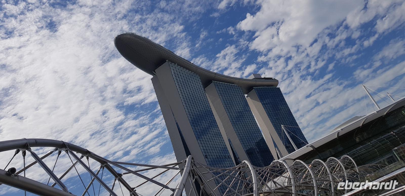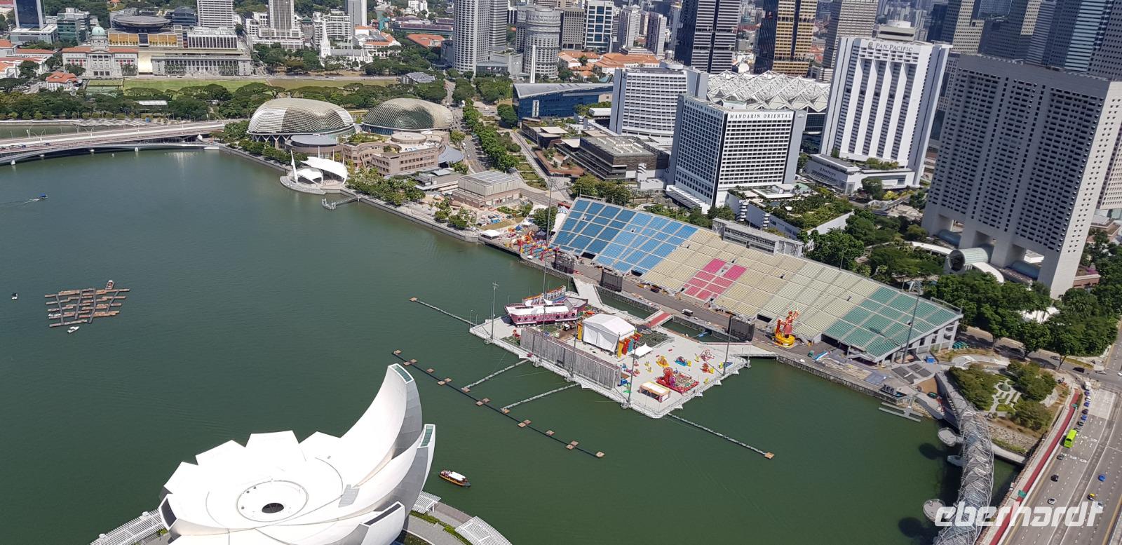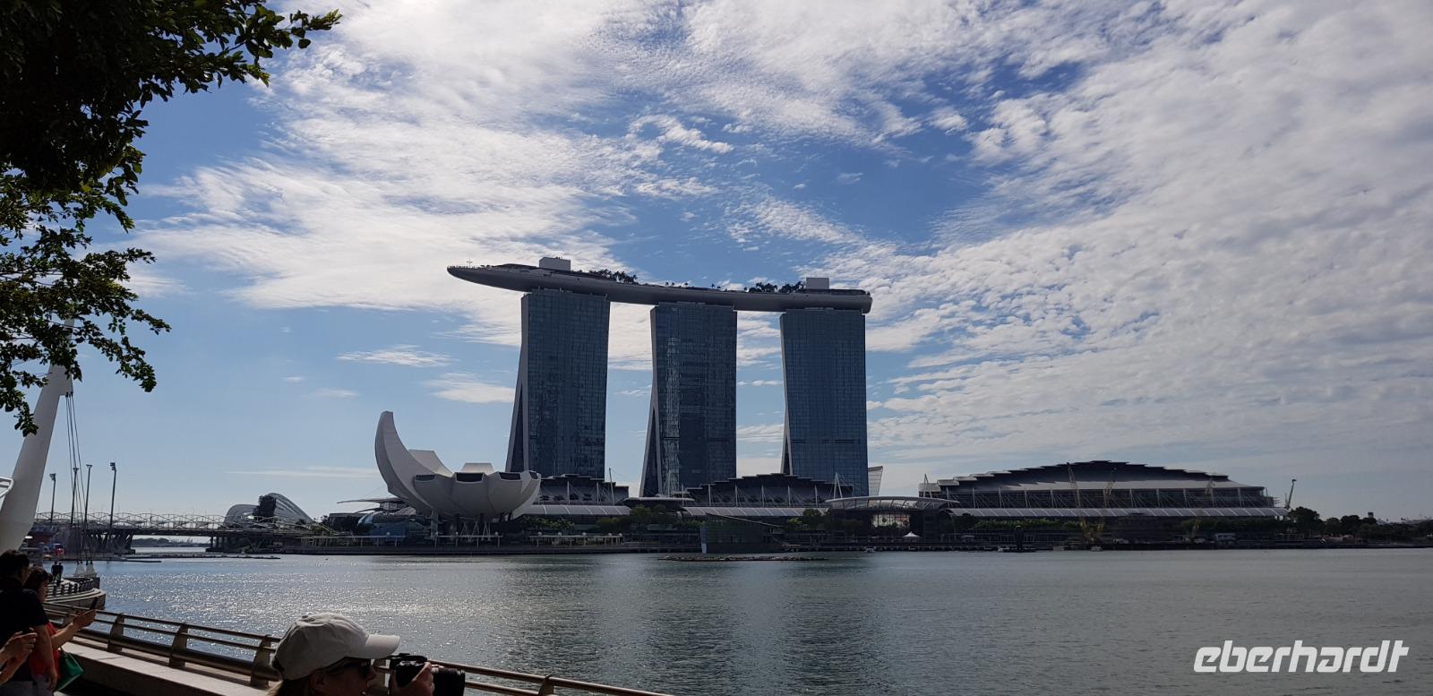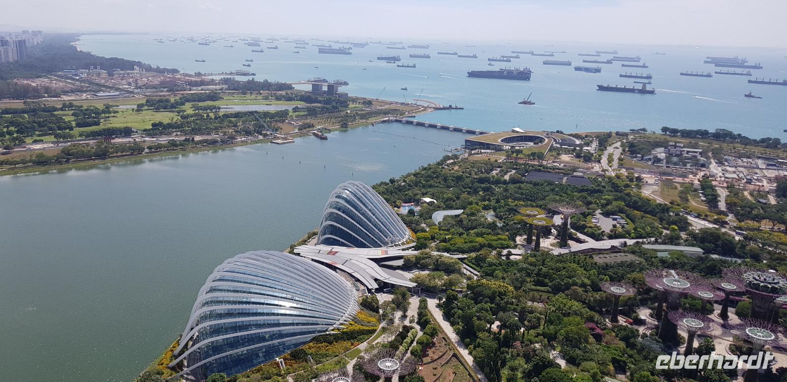 Bevor wir am frühen Nachmittag unsere Stadtrundfahrt unternehmen, steht uns der Morgen zur freien Verfügung. Um 10 Uhr treffen wir uns mit unserer Reisebegleiterin Mandy und machen uns auf den Weg zum Marina Bay Sands Hotel - diesmal zu Fuß. Die Sonne verwöhnt uns nach vielen grauen Tagen zuhause in Deutschland heute mit 35°C, die sich bei der hohen Luftfeuchtigkeit hier noch etwas heißer anfühlen. Angekommen an dem baulich sehr beeindruckenden Hotel mit dem berühmten Surfbrett und dem Infinity Pool auf dem Dach, fahren wir hinauf in die 56. Etage zur Aussichtsplattform und genießen den Blick über die Stadt. Hier verbringen wir circa eine halbe Stunde mit tollen Ausblicken über die Stadt und die vielen Schiffe, die in der riesigen Bucht vor Singapur auf Einlass in den Hafen warten.