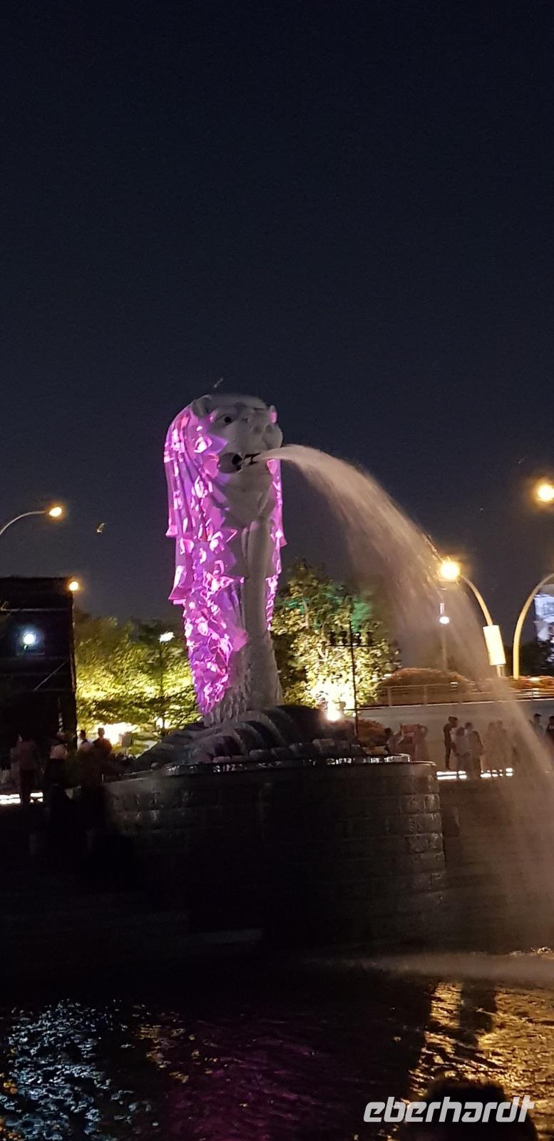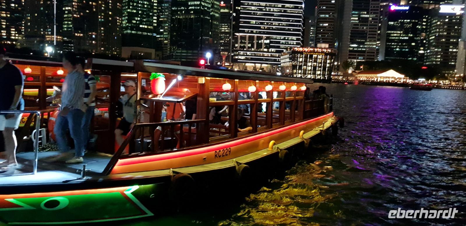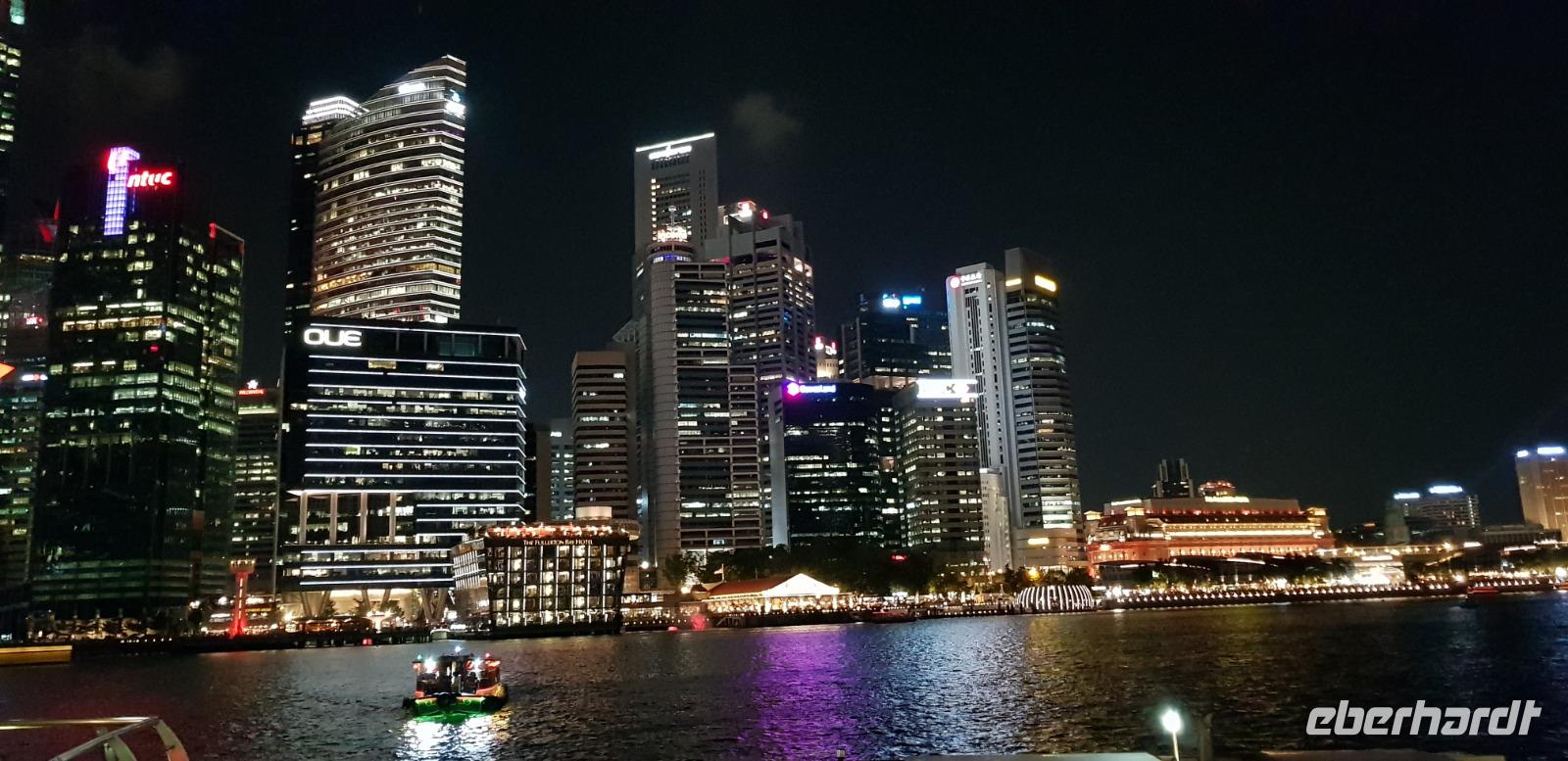 Im Anschluss an die tolle Lasershow, nehmen wir Platz auf einem sogenannten Bum-Boat und unternehmen eine abendliche Bootsfahrt entlang des Singapur Flusses mit spektakulären Ausblicken auf das Marina Bay Sands Hotel, den Singapore Flyer, das Opernhaus und die vielen Wolkenkratzer den Finanzdistrikts. Unterwegs strahlt uns auch das Wahrzeichen der Stadt, der Merlion, halb Löwe, halb Meerjungfrau in bunten Farben an. Gegen 10 Uhr am Abend erreichen wir dann unser Hotel und fallen müde vom Flug und den ersten Eindrücken in unsere Betten.
