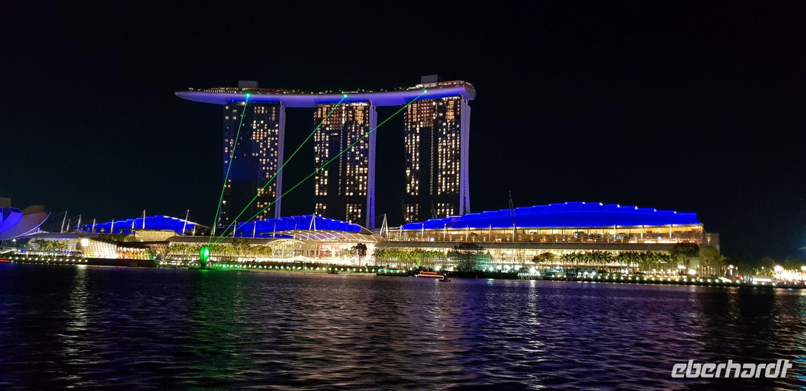 Angekommen in der Löwenstadt begrüßt uns Martine, unsere örtliche Reiseleiterin sehr herzlich und bringt uns zu unserem Hotel Peninsula Excelsior. Auf dem Weg dorthin erklärt sie bereits vieles und bietet an, am Abend mit uns zur Lasershow am Marina Bay Sands Hotel zu fahren. Das Angebot nehmen wir gern an, schließlich möchten alle so viel wie möglich von der Stadt der Superlative sehen. Schon die U-Bahn Fahrt dorthin ist ein besonderes Erlebnis, aber zum Glück lotst uns Martine durch die scheinbar unendlichen Schächte.