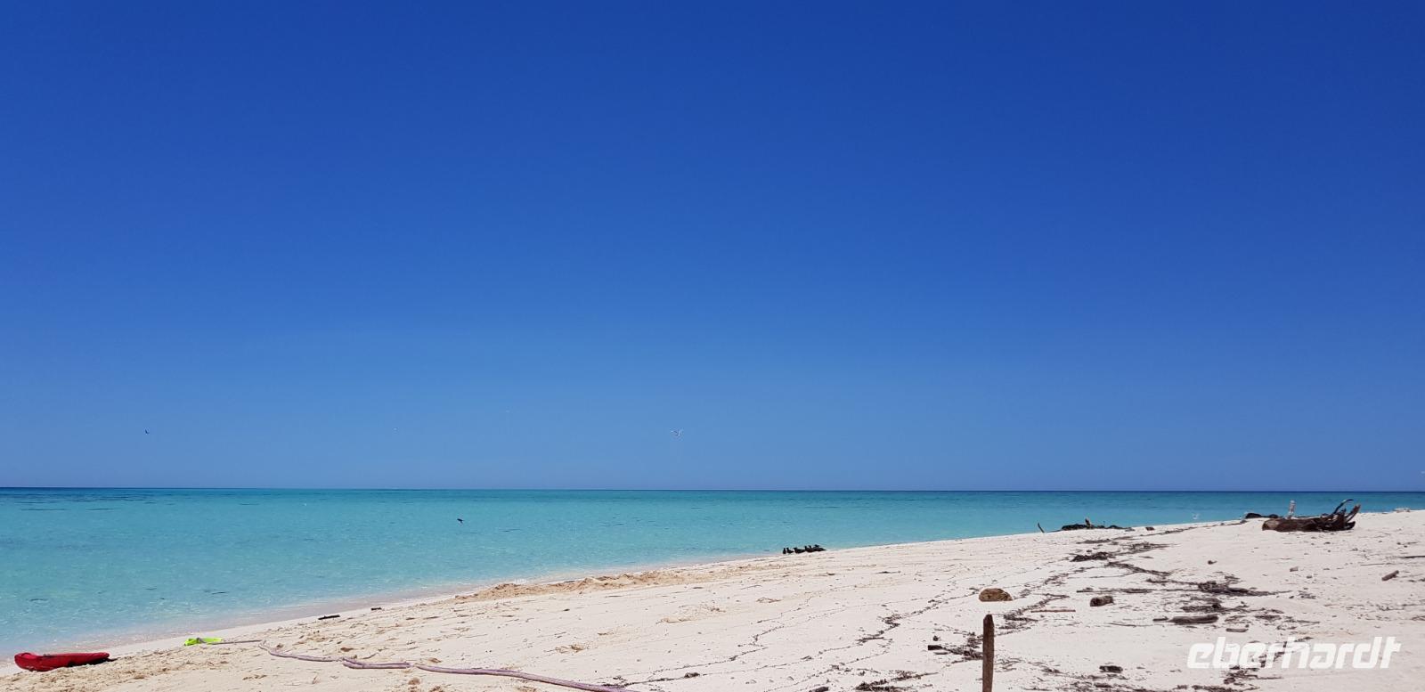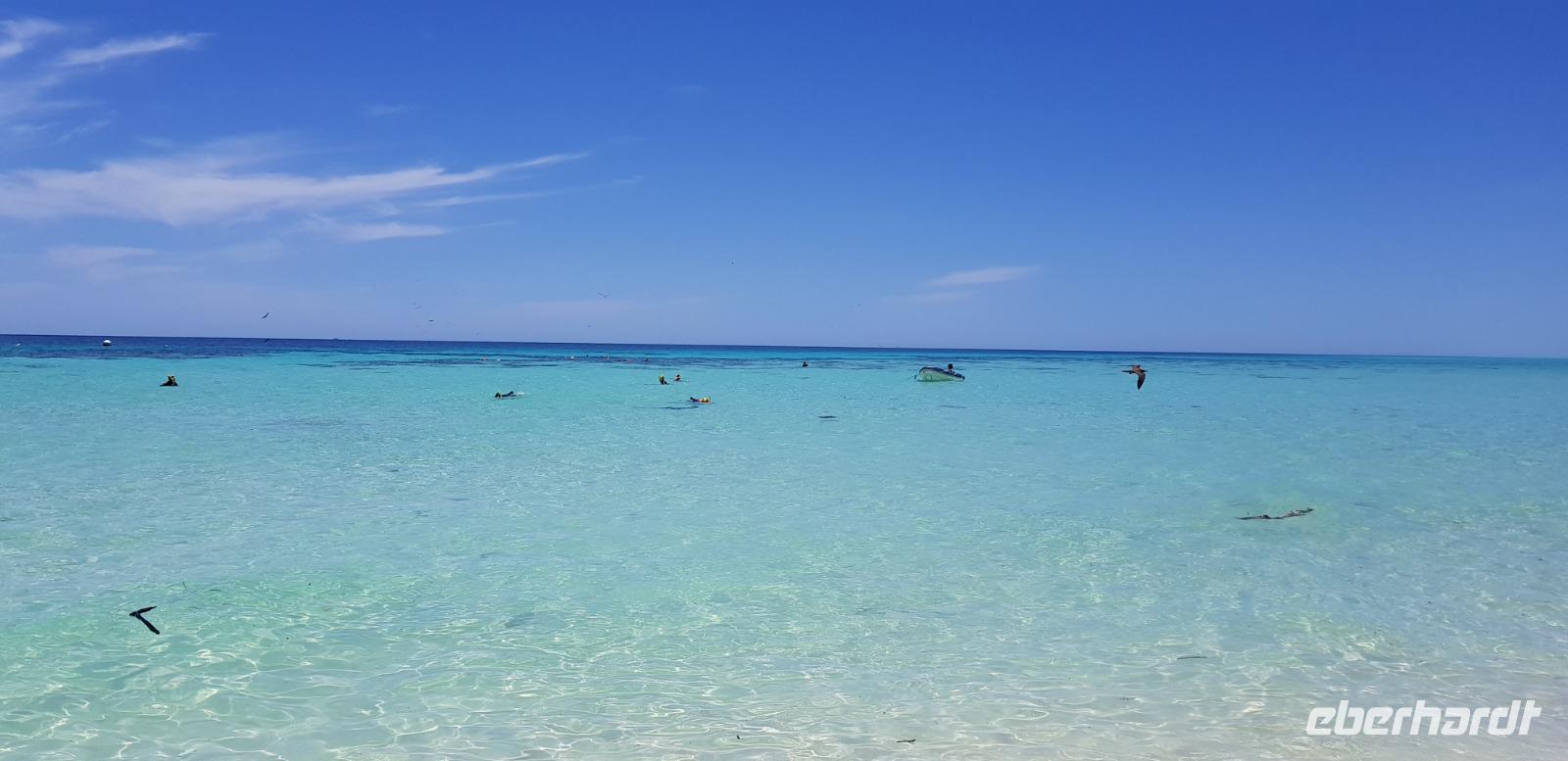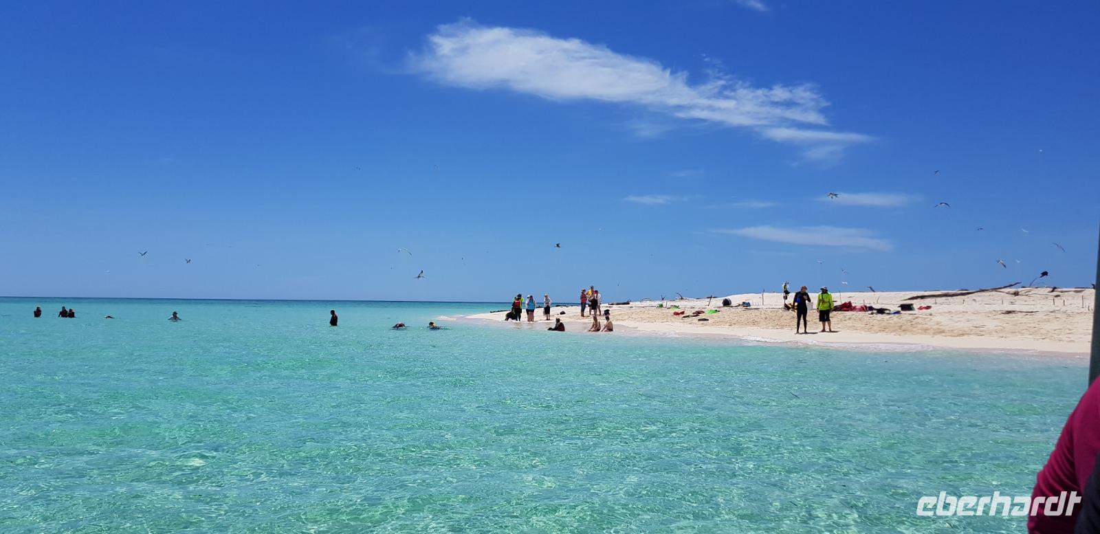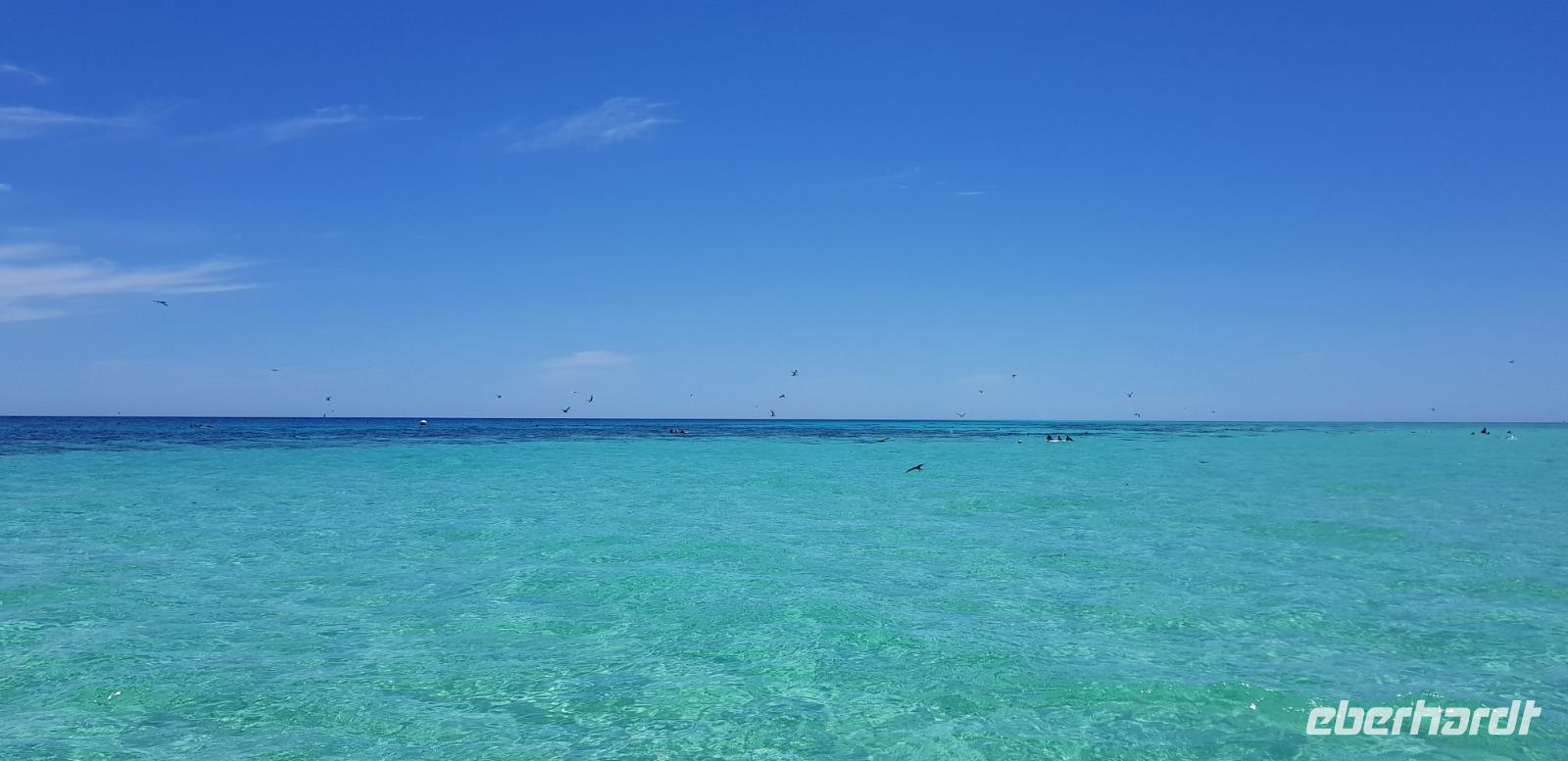 An Bord werden wir mit Kaffee, Tee und kleinen Snacks wie Muffins und Sandwiches empfangen und können uns die besten Plätze an oder unter Deck sichern. Als alle Mann an Bord sind, fahren wir los zum Great Barrier Reef. Unterwegs bekommen wir eine kurze Einweisung ins Schnorcheln und dürfen in recht körperbetonte Anzüge schlüpfen, die vor Quallen und der australischen Sonne schützen. Angekommen an einer Sandbank mitten im Meer, werden wir mit einem Boot zum Strand gebracht, an dem man sich ein bisschen wie Robinson Crusoe fühlt, und können die tolle Unterwasserwelt mit den vielen bunten und teilweise sehr großen Fischen an einem Teil des Riffs bewundern oder auch nur einen Fuß in das warme Wasser halten.
