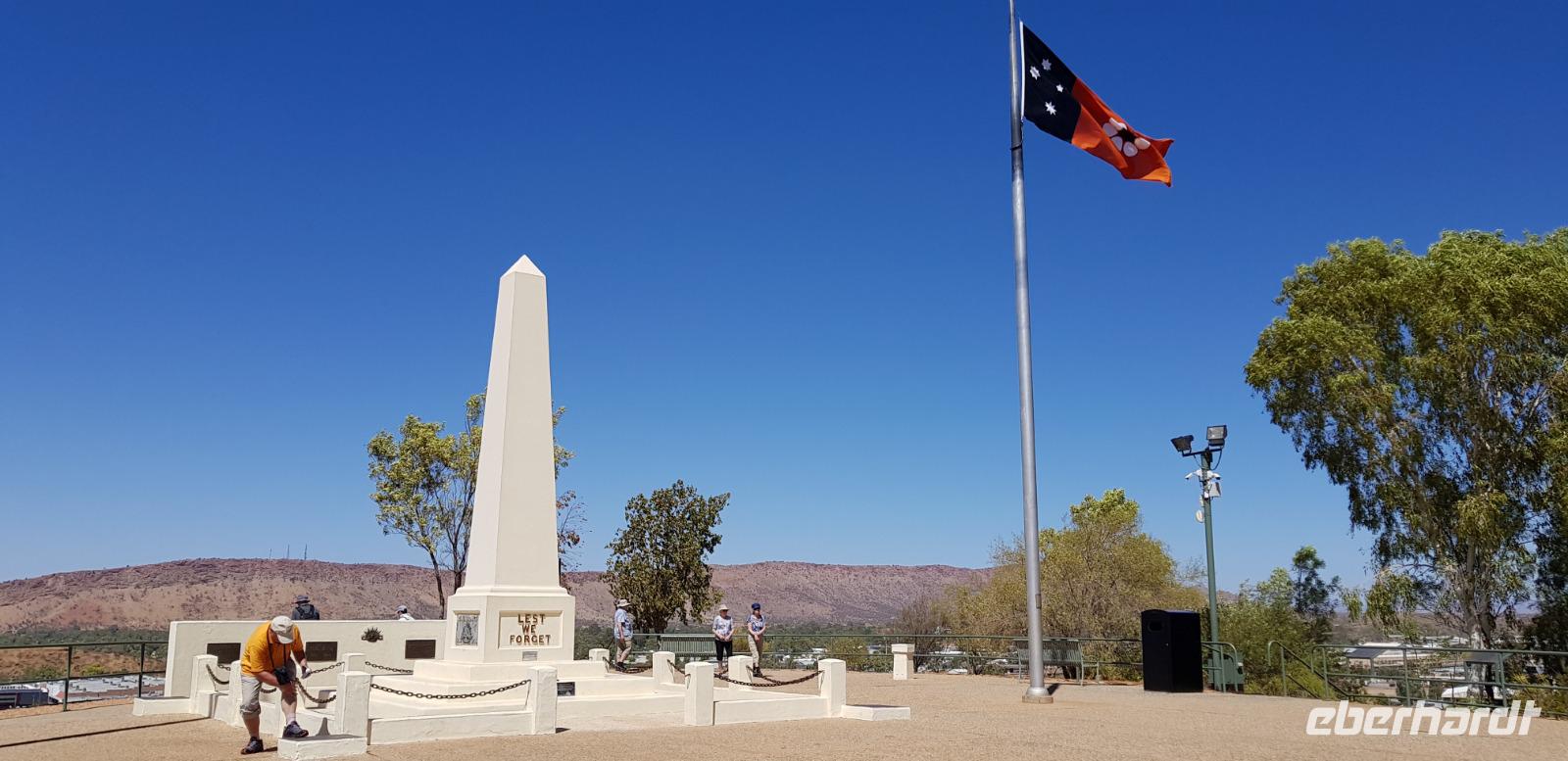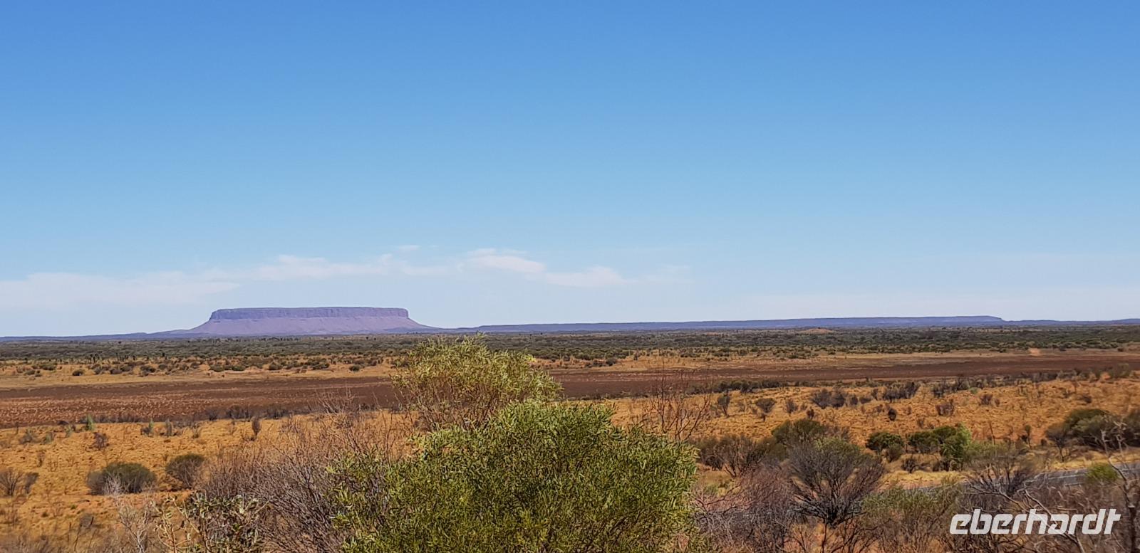 Am Flughafen treffen wir Marco, unseren örtlichen Reiseleiter für die nächsten 1,5 Tage. Er zeigt uns den ANZAC Hill mit Ausblick auf die Stadt und nach einem weiteren kleinen Stopp im Zentrum machen wir uns auf den Weg nach Uluru. Ca. 450 Kilometer durch die scheinbar unendliche Weite des australischen Kontinents liegen vor uns. Am Mount Connor, einer Bergkette, die dem Uluru etwas ähnlichsieht, machen wir einen Halt und kommen erstmals mit dem weithin bekannten roten Sand Australiens in Berührung.