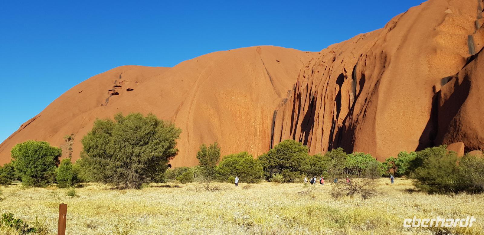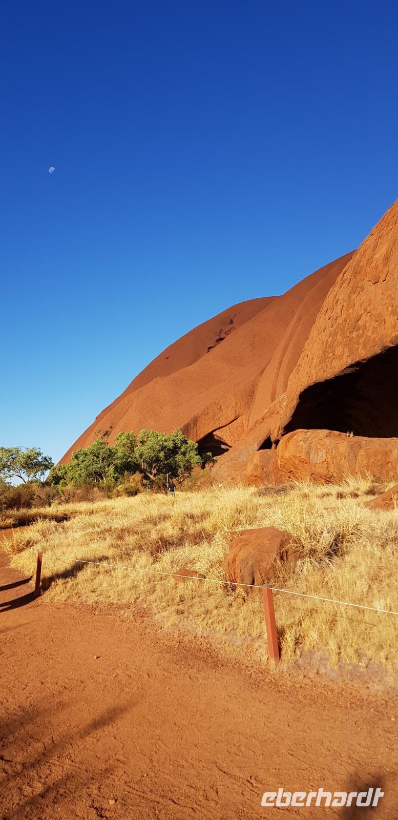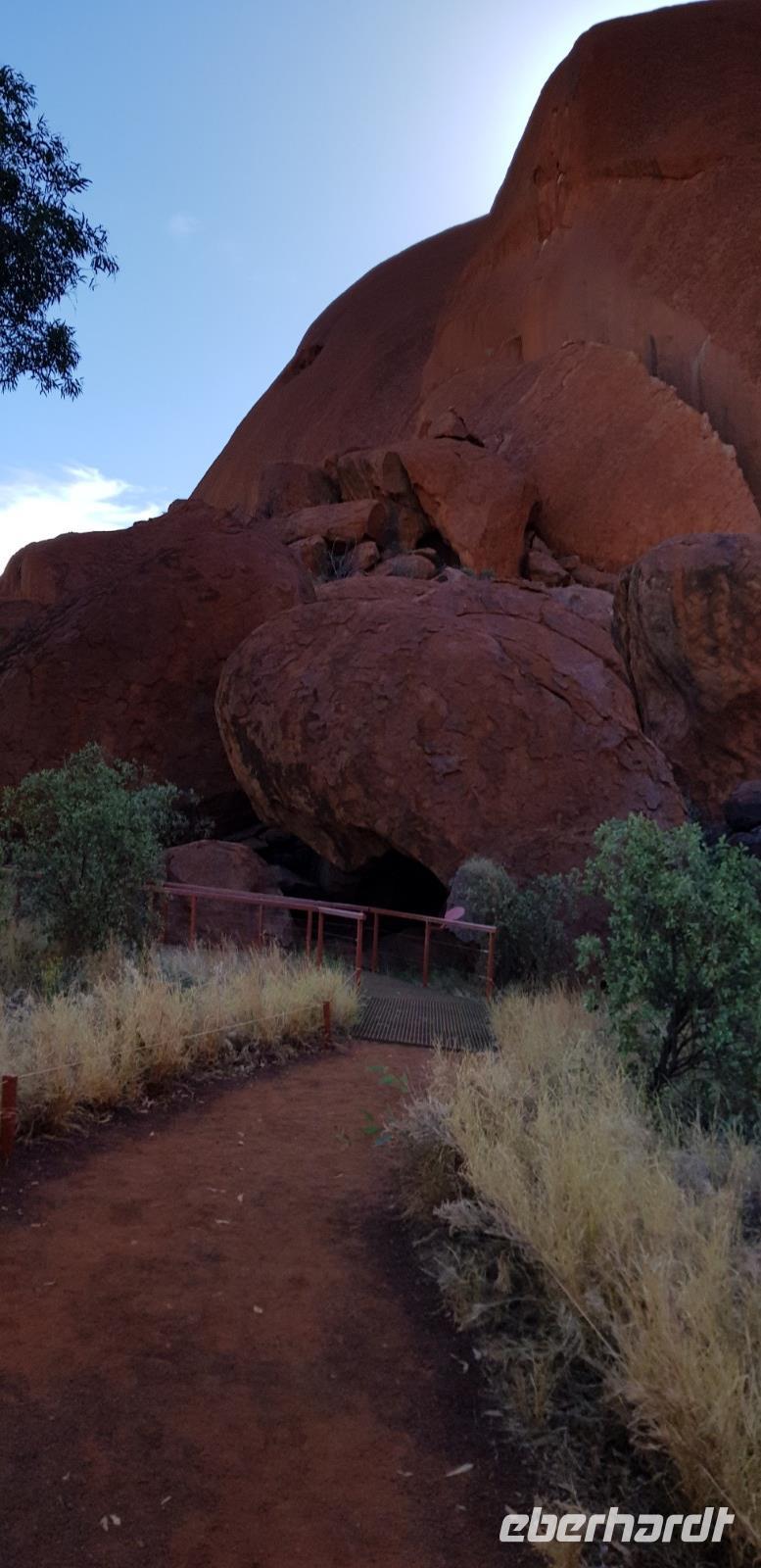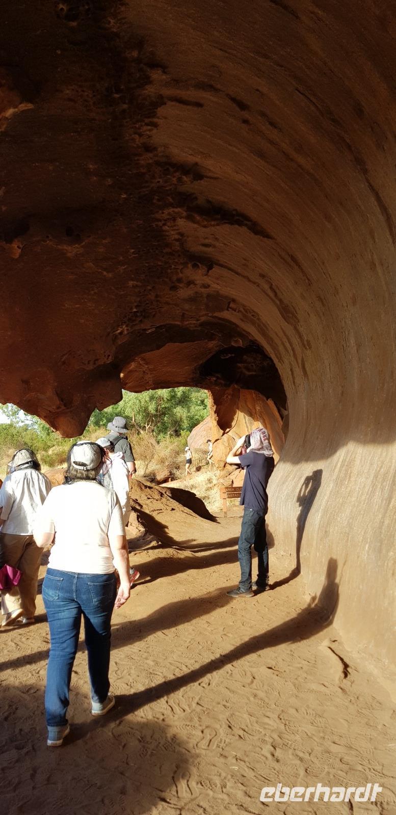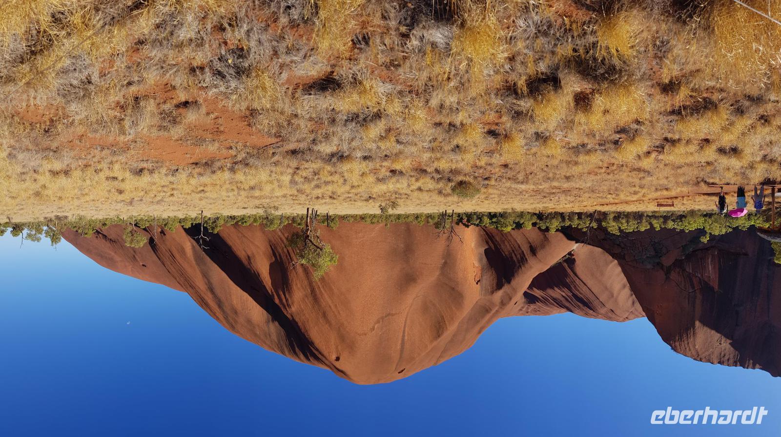 Angekommen am Ayers Rock, wie der „große rote Berg" von den europäischen Siedlern benannt wurde, machen wir zwei kurze Spaziergänge entlang der Felsen und lassen uns von Marco die Legenden der Ureinwohner erzählen.