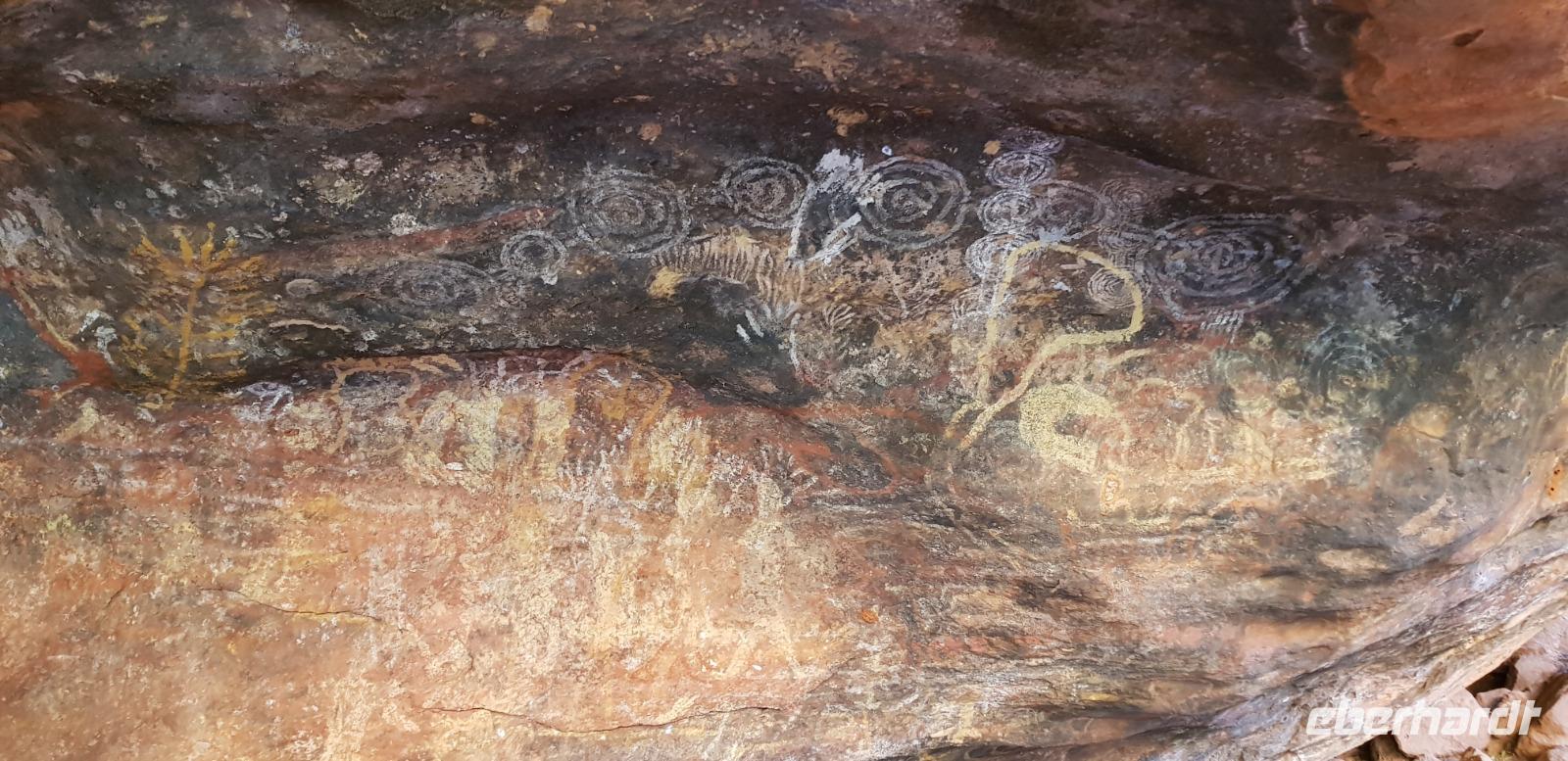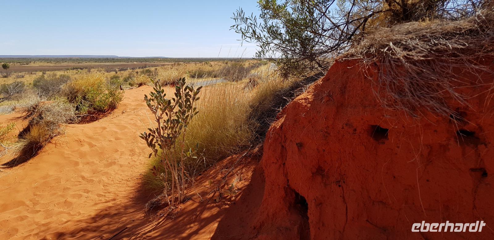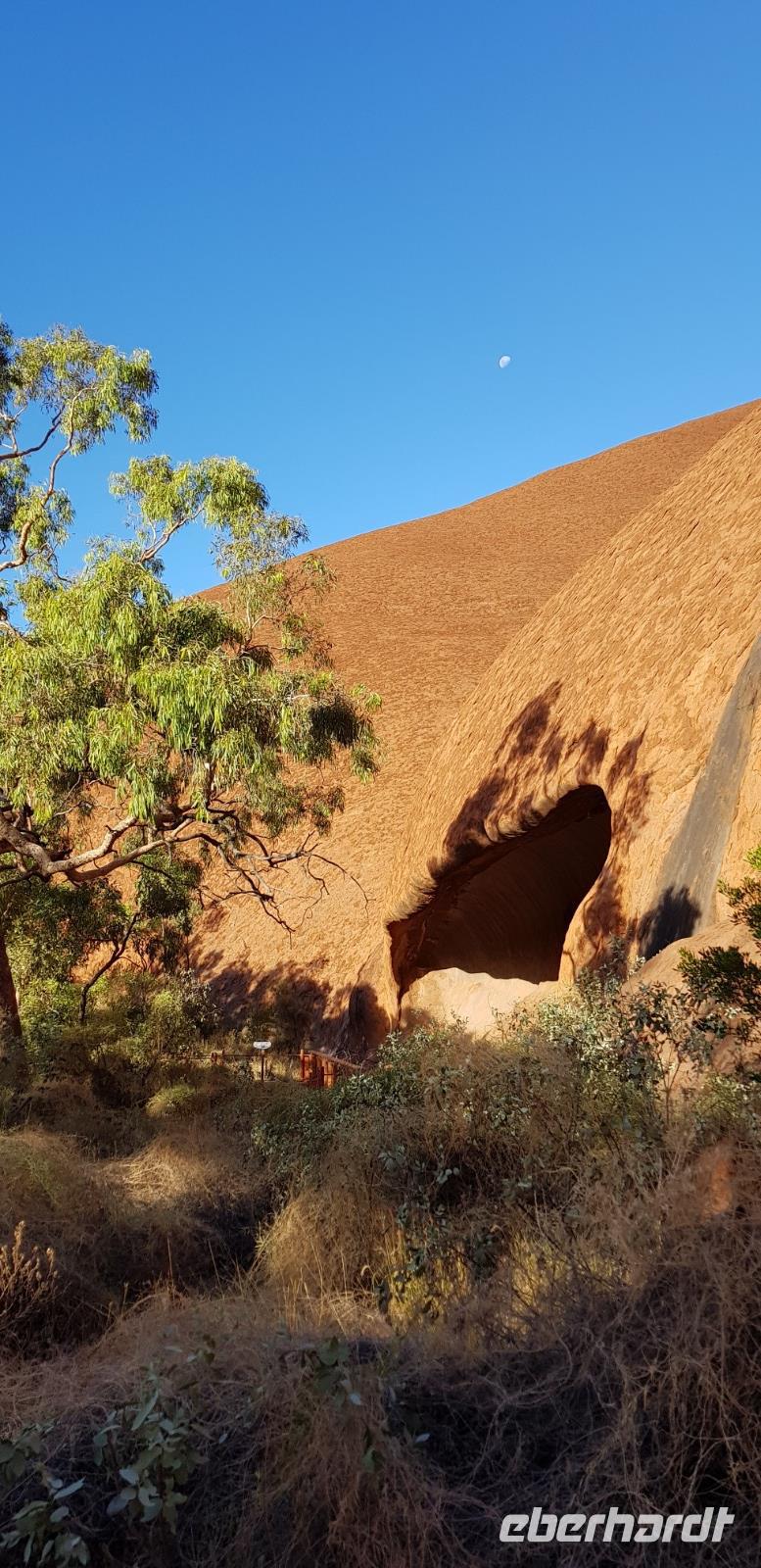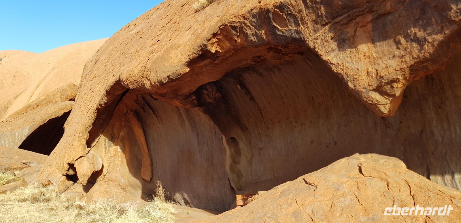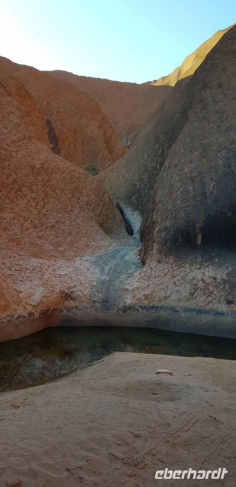 Angekommen am Ayers Rock, wie der „große rote Berg" von den europäischen Siedlern benannt wurde, machen wir zwei kurze Spaziergänge entlang der Felsen und lassen uns von Marco die Legenden der Ureinwohner erzählen.