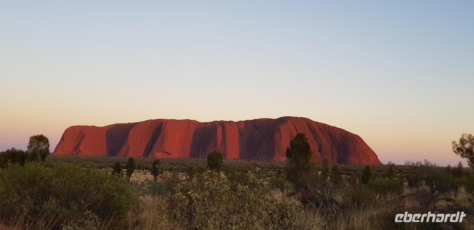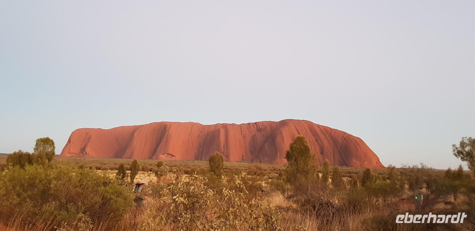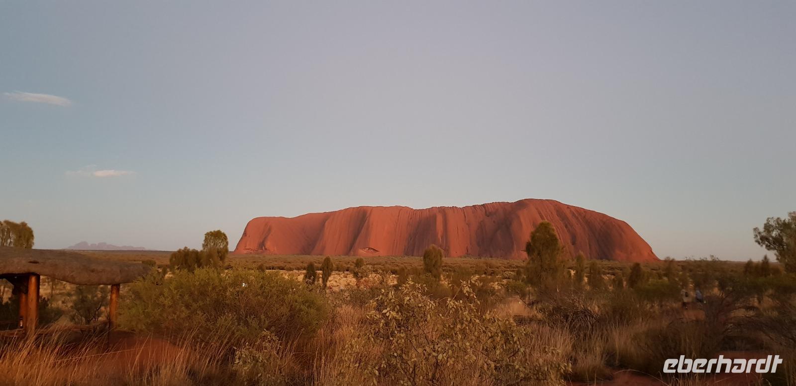 Bereits sehr früh morgens ist Abfahrt an den nahe gelegenen Uluru zum Sonnenaufgang, den wir uns in aller Ruhe anschauen können. Mit bloßem Auge ist das Wechselspiel der Farben, die der Berg bietet, kaum wahrzunehmen. Erst die Bilder, die man laut Marco aller paar Minuten machen sollte, fördern die unterschiedlichen Farbtöne zutage und belohnen das frühe Aufstehen wirklich.