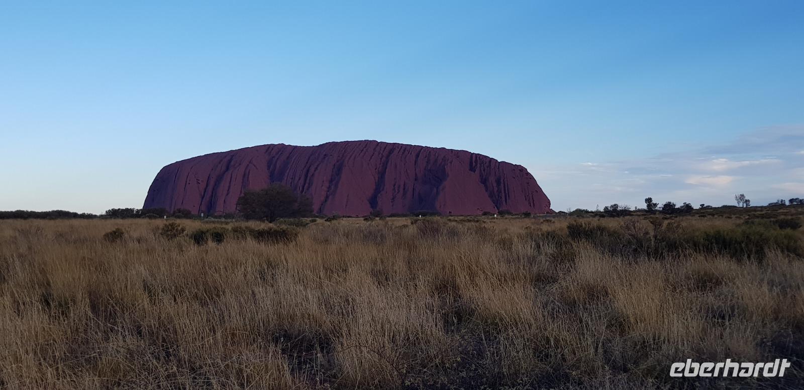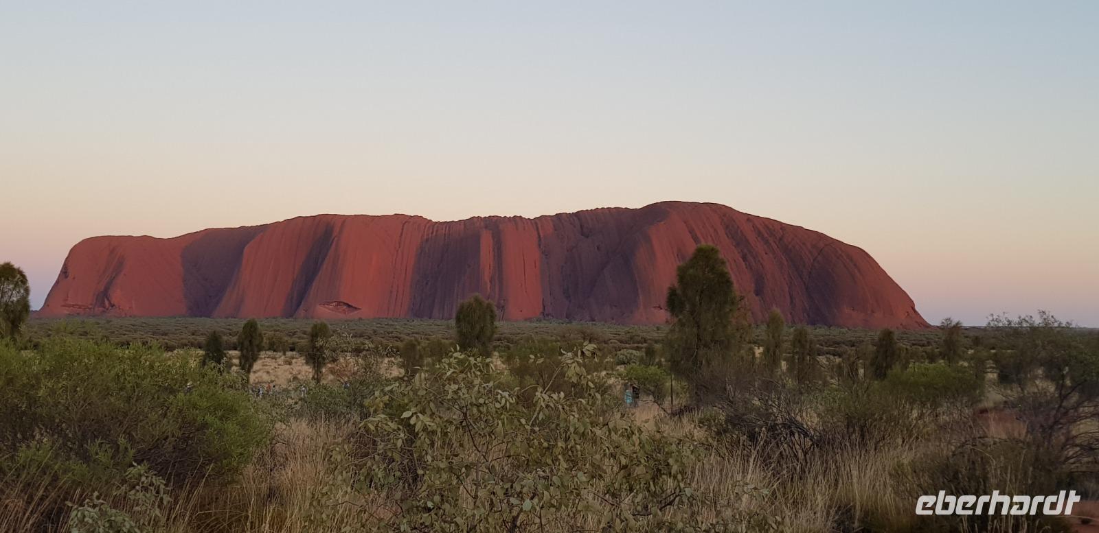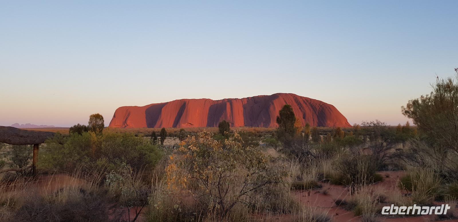 Bereits sehr früh morgens ist Abfahrt an den nahe gelegenen Uluru zum Sonnenaufgang, den wir uns in aller Ruhe anschauen können. Mit bloßem Auge ist das Wechselspiel der Farben, die der Berg bietet, kaum wahrzunehmen. Erst die Bilder, die man laut Marco aller paar Minuten machen sollte, fördern die unterschiedlichen Farbtöne zutage und belohnen das frühe Aufstehen wirklich.