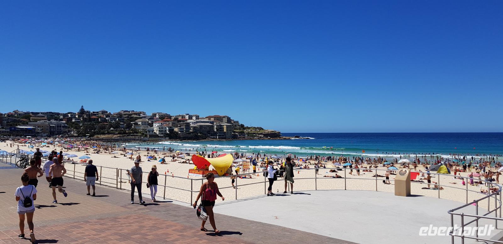 Aber auch der berühmte Bondi Beach darf natürlich auf unserer Erkundungstour durch die Stadt nicht fehlen. Da Sonntag ist, halten sich hier heute viele Einheimische auf, um sich die letzten wärmenden Sonnenstrahlen im australischen Spätsommer auf den Bauch scheinen zu lassen. Am frühen Nachmittag sind wir zurück an unserem Hotel und haben nun ausgiebig Zeit, die Stadt auf eigene Faust zu erkunden.