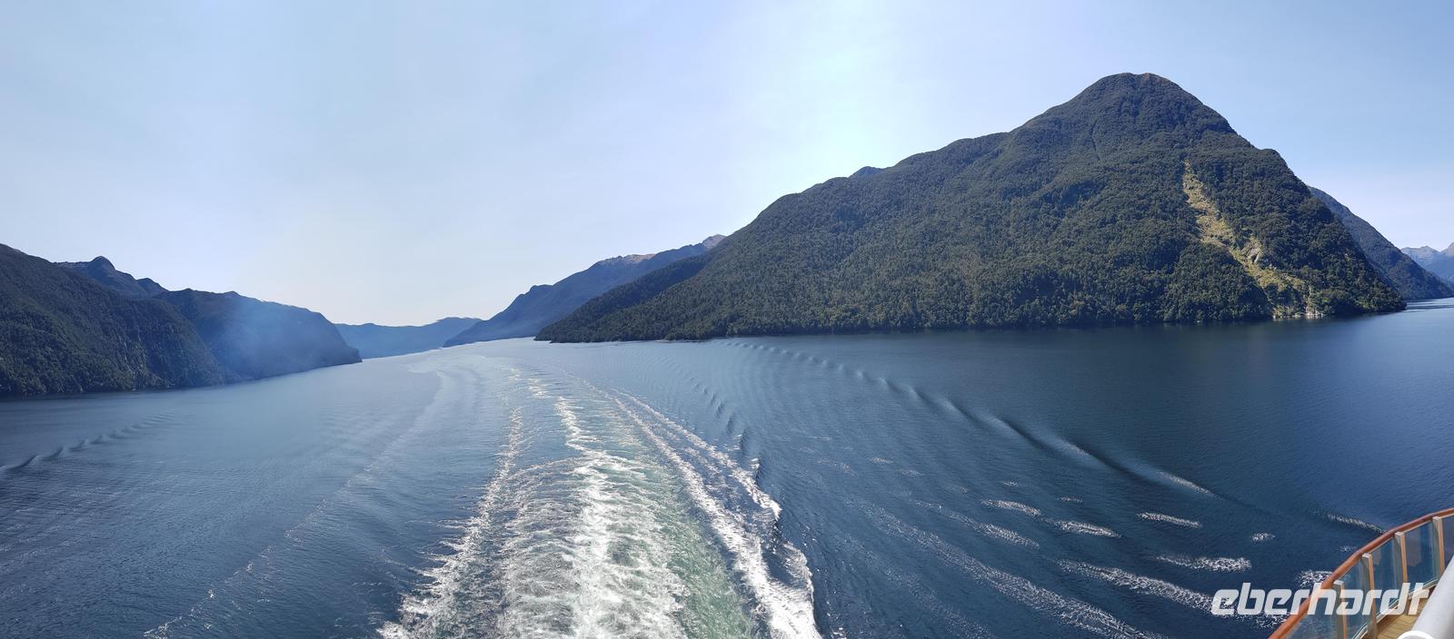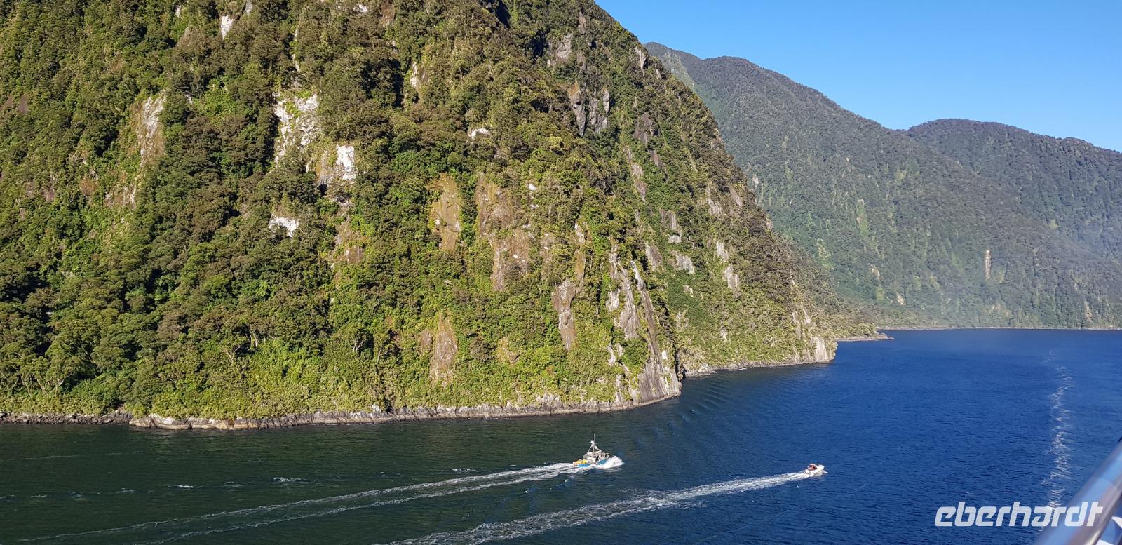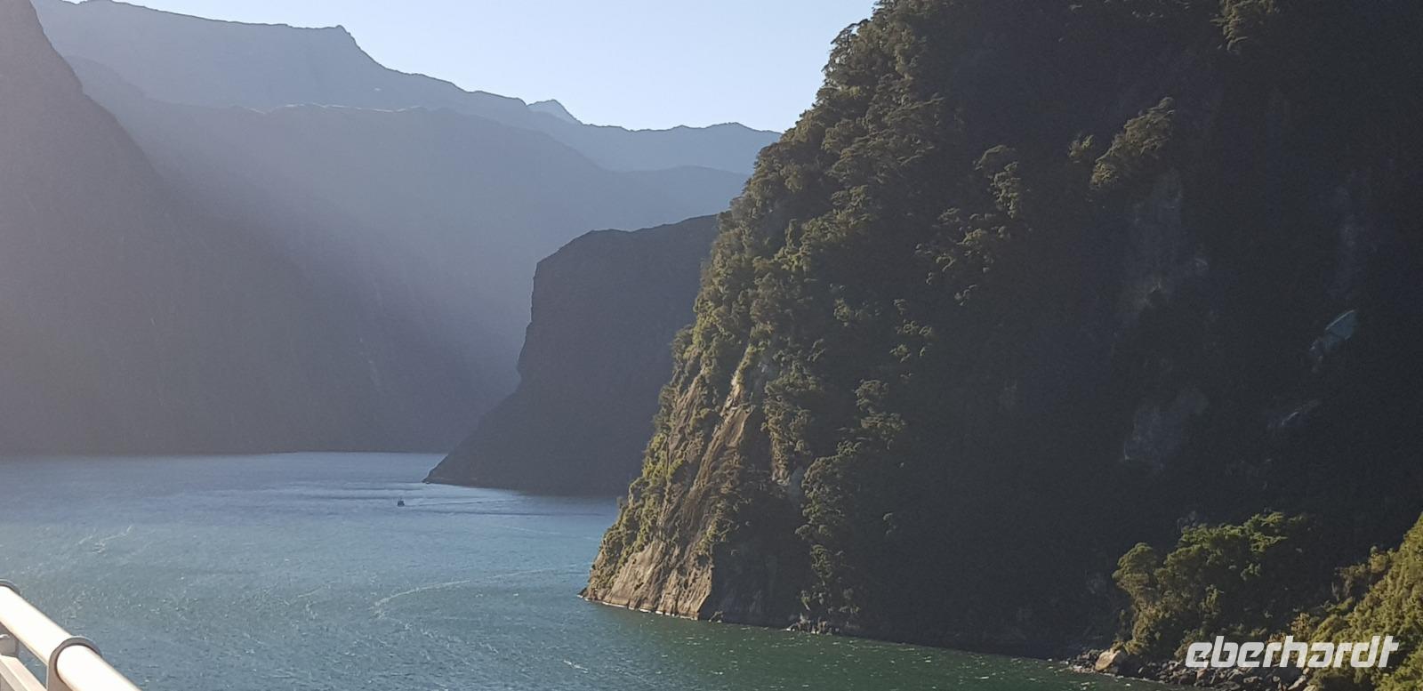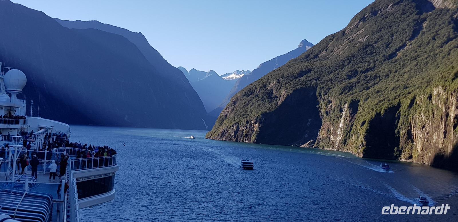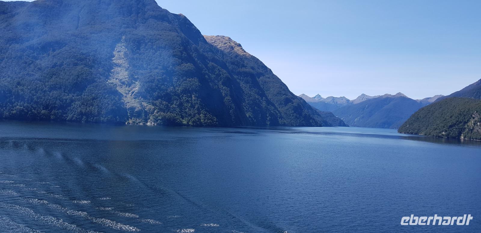 Nach zwei Tagen, in denen wir nur Wasser um uns herum sahen, fahren wir am Morgen in den Fjordland Nationalpark ein. Der erste Fjord, der uns erwartet, ist der „Milford Sound". Ein Nationalpark-Ranger erklärt von der Brücke aus einiges zur Natur Neuseelands. Bei strahlendem Sonnenschein können wir die grünen, teils steil hinaufragenden Wände und einige kleinere Wasserfälle von Deck aus bewundern. Gegen 11 Uhr verlassen wir den ersten Fjord wieder bis wir am frühen Nachmittag den „Doubtful Sound" erreichen. Am Nachmittag trifft sich die Gruppe, um bei einem Gläschen Sekt die Erlebnisse der letzten Tage auszutauschen und die tolle Landschaft gemeinsam zu genießen. Später am Nachmittag erreichen wir noch den dritten der angekündigten Fjorde, den „Dusky Sound". Am frühen Abend verlassen wir den Fjordland Nationalpark, der schon sehr an die Landschaft Norwegens erinnert, sich aber am anderen Ende der Welt befindet.