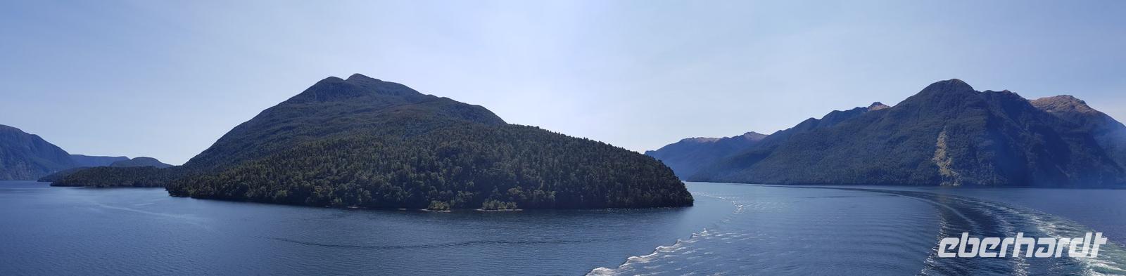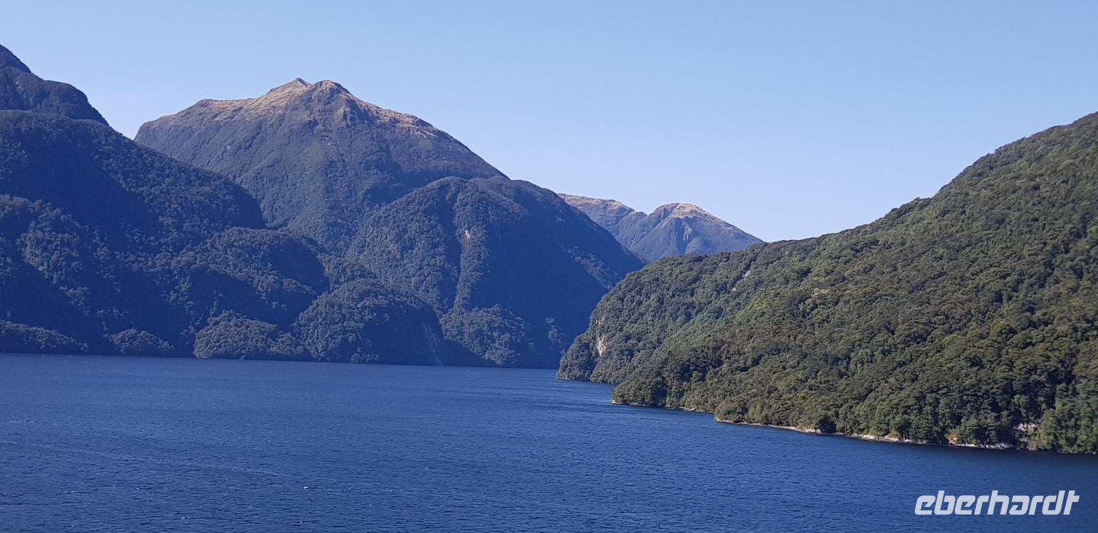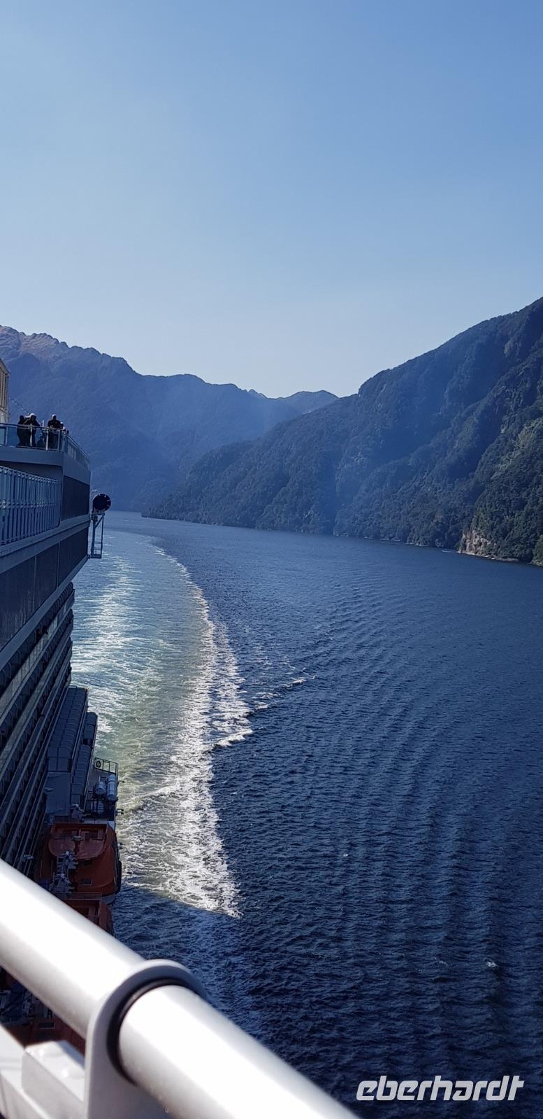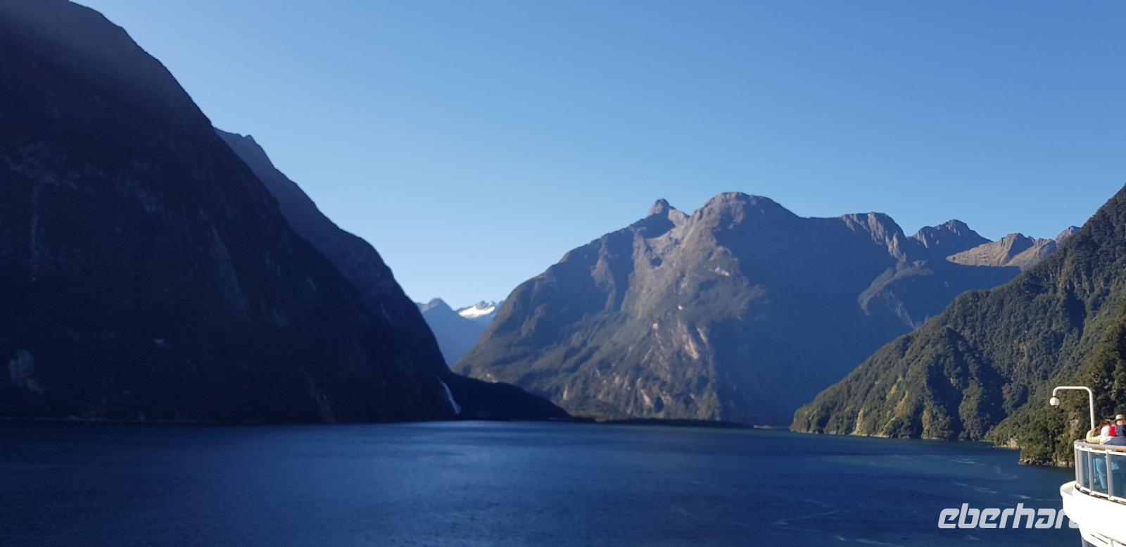 Nach zwei Tagen, in denen wir nur Wasser um uns herum sahen, fahren wir am Morgen in den Fjordland Nationalpark ein. Der erste Fjord, der uns erwartet, ist der „Milford Sound". Ein Nationalpark-Ranger erklärt von der Brücke aus einiges zur Natur Neuseelands. Bei strahlendem Sonnenschein können wir die grünen, teils steil hinaufragenden Wände und einige kleinere Wasserfälle von Deck aus bewundern. Gegen 11 Uhr verlassen wir den ersten Fjord wieder bis wir am frühen Nachmittag den „Doubtful Sound" erreichen. Am Nachmittag trifft sich die Gruppe, um bei einem Gläschen Sekt die Erlebnisse der letzten Tage auszutauschen und die tolle Landschaft gemeinsam zu genießen. Später am Nachmittag erreichen wir noch den dritten der angekündigten Fjorde, den „Dusky Sound". Am frühen Abend verlassen wir den Fjordland Nationalpark, der schon sehr an die Landschaft Norwegens erinnert, sich aber am anderen Ende der Welt befindet.