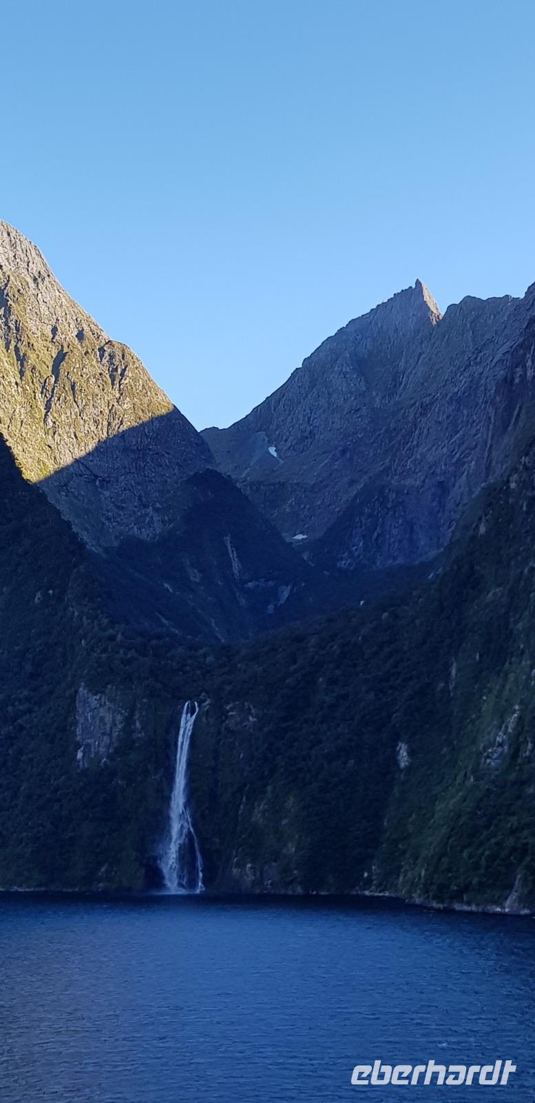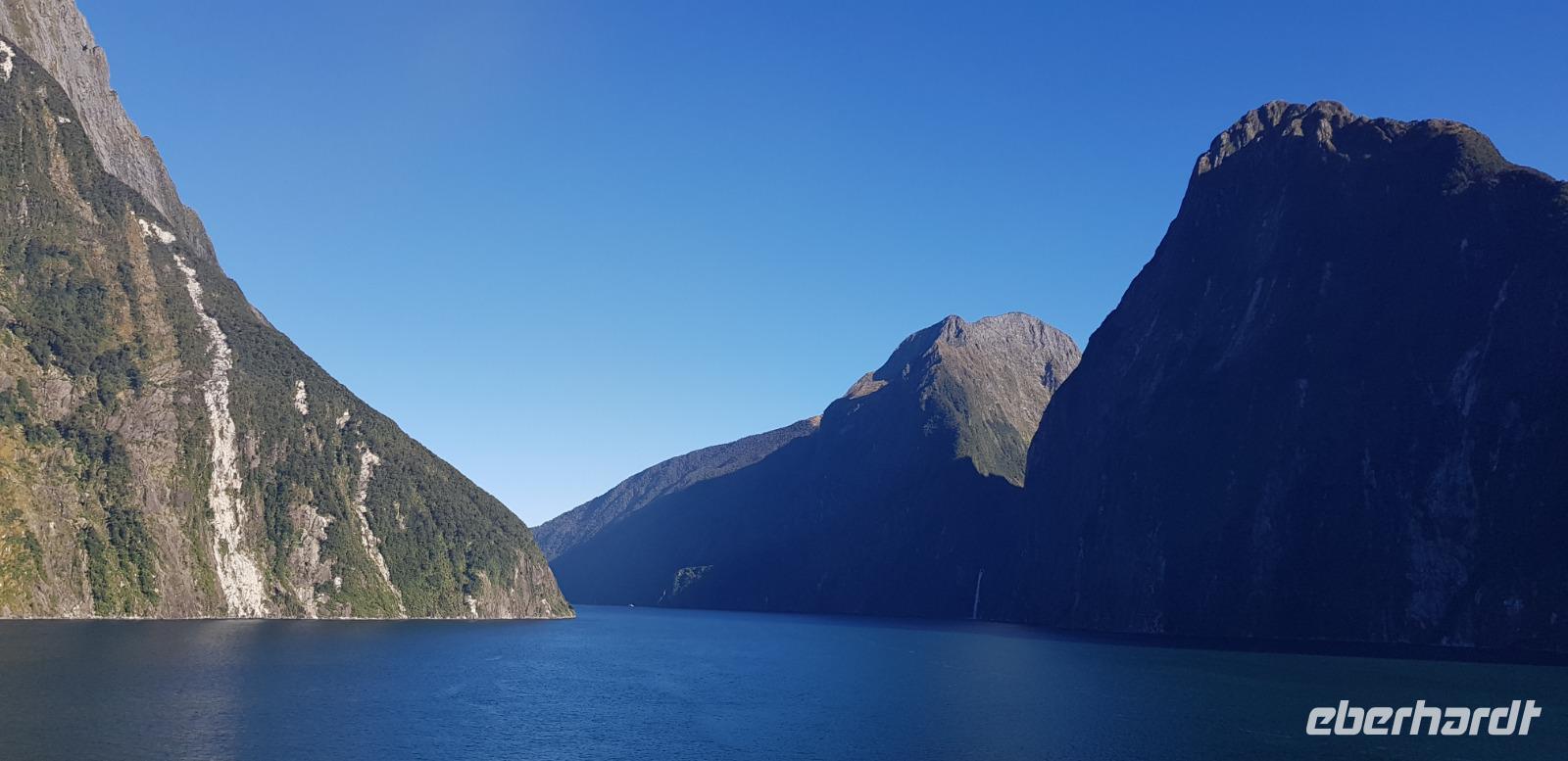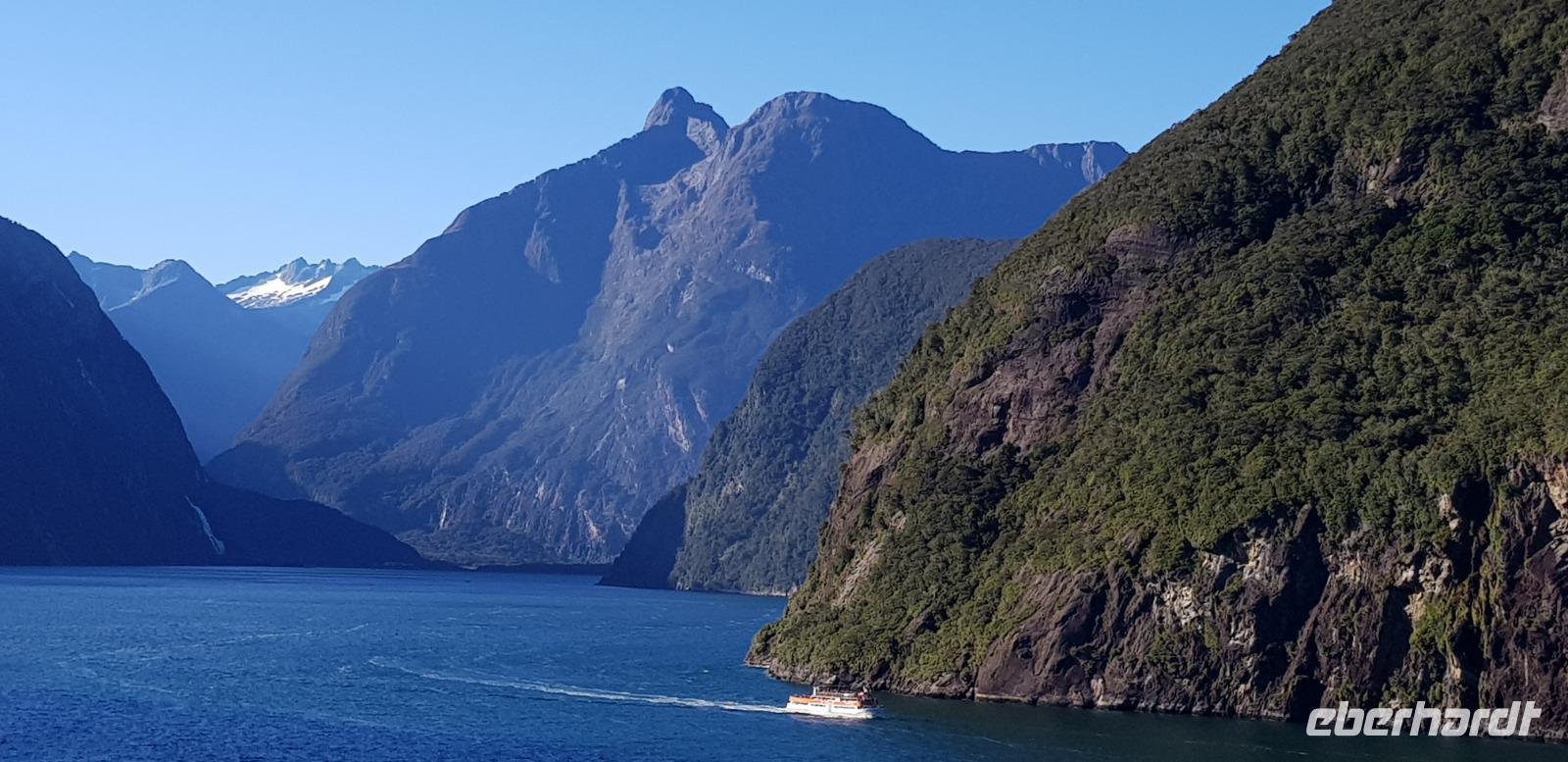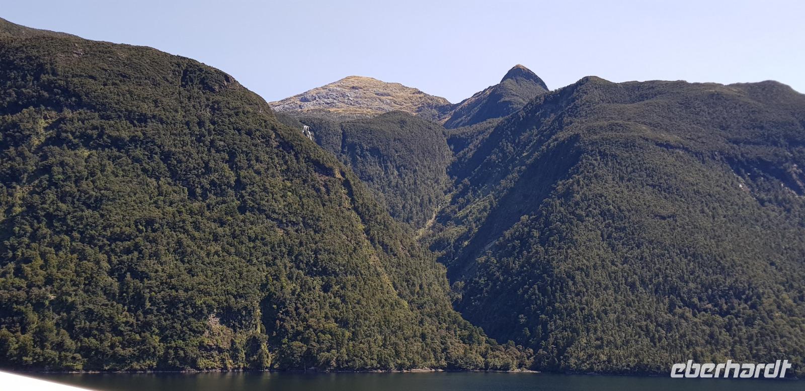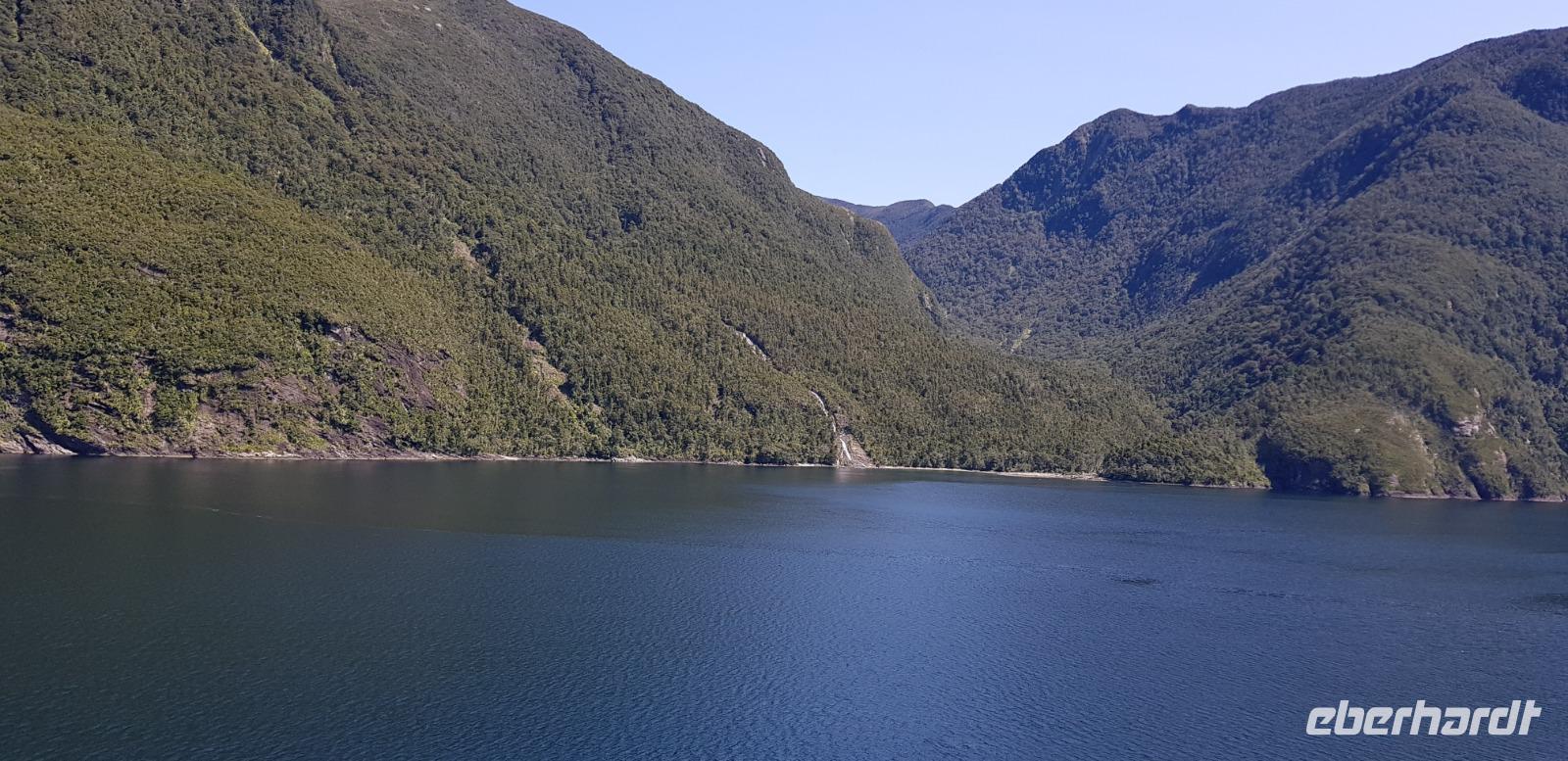 Nach zwei Tagen, in denen wir nur Wasser um uns herum sahen, fahren wir am Morgen in den Fjordland Nationalpark ein. Der erste Fjord, der uns erwartet, ist der „Milford Sound". Ein Nationalpark-Ranger erklärt von der Brücke aus einiges zur Natur Neuseelands. Bei strahlendem Sonnenschein können wir die grünen, teils steil hinaufragenden Wände und einige kleinere Wasserfälle von Deck aus bewundern. Gegen 11 Uhr verlassen wir den ersten Fjord wieder bis wir am frühen Nachmittag den „Doubtful Sound" erreichen. Am Nachmittag trifft sich die Gruppe, um bei einem Gläschen Sekt die Erlebnisse der letzten Tage auszutauschen und die tolle Landschaft gemeinsam zu genießen. Später am Nachmittag erreichen wir noch den dritten der angekündigten Fjorde, den „Dusky Sound". Am frühen Abend verlassen wir den Fjordland Nationalpark, der schon sehr an die Landschaft Norwegens erinnert, sich aber am anderen Ende der Welt befindet.