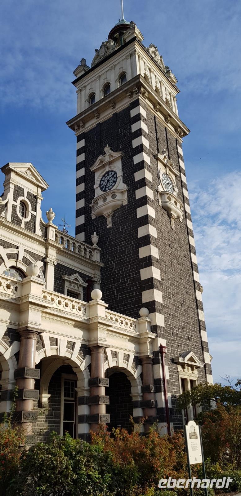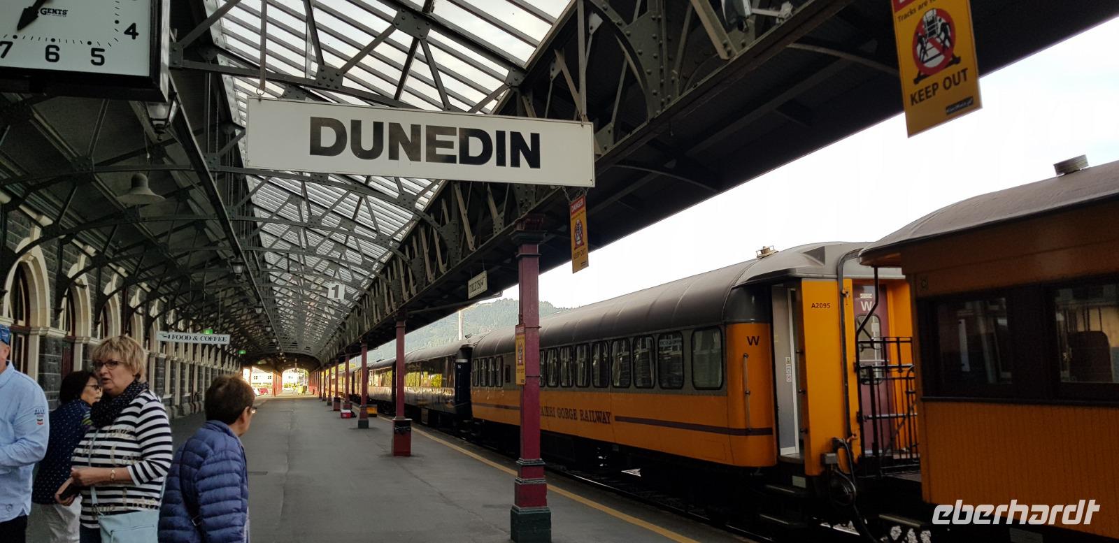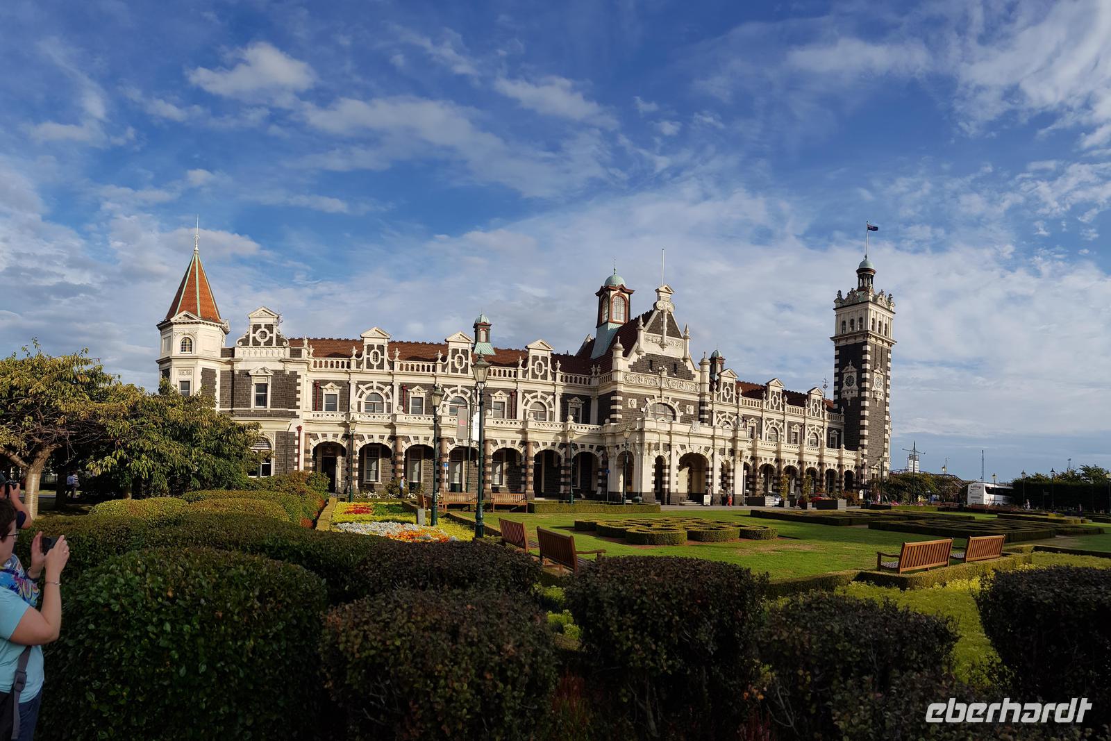 Am Vormittag bleibt noch etwas Zeit, die Eindrücke von gestern zu verarbeiten, da wir unseren nächsten Hafen, Port Chalmers / Dunedin erst am Mittag erreichen. Wir treffen uns kurz nach dem Mittag und gehen gemeinsam von Bord, um unsere örtliche Reiseleiterin Hildegard, eine Biologin, die seit über 20 Jahren hier in Neuseeland lebt, zu treffen. Die Fahrt führt uns zunächst durch die Stadt Dunedin, die an der Spitze des Otago Hafens liegt und mit seinen ca. 120 000 Einwohnern die zweitgrößte Stadt der Südinsel Neuseelands ist. Wenn noch etwas Zeit bleibt, verspricht uns Hildegard, auf dem Rückweg noch einen Blick auf den Bahnhof der Stadt, der zumindest als der schönste Bahnhof Neuseelands gilt, uns in der Bordzeitung Princess Patter aber als schönster der Welt angepriesen wurde.