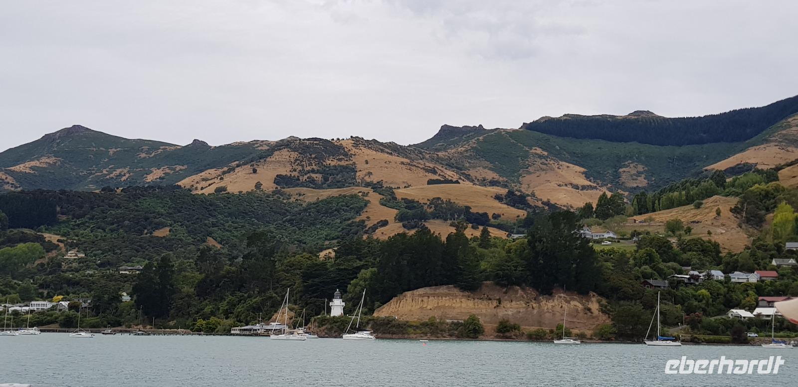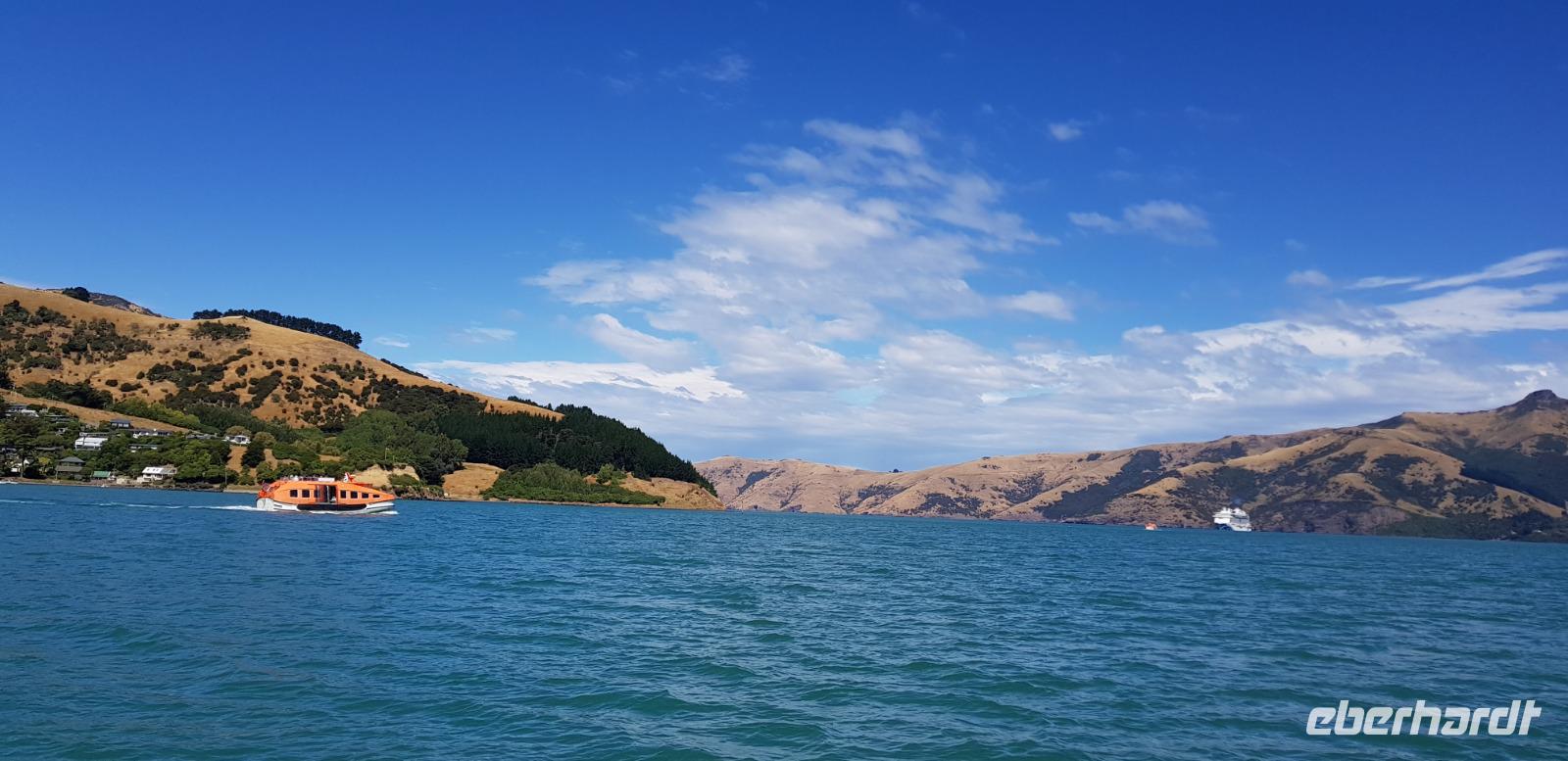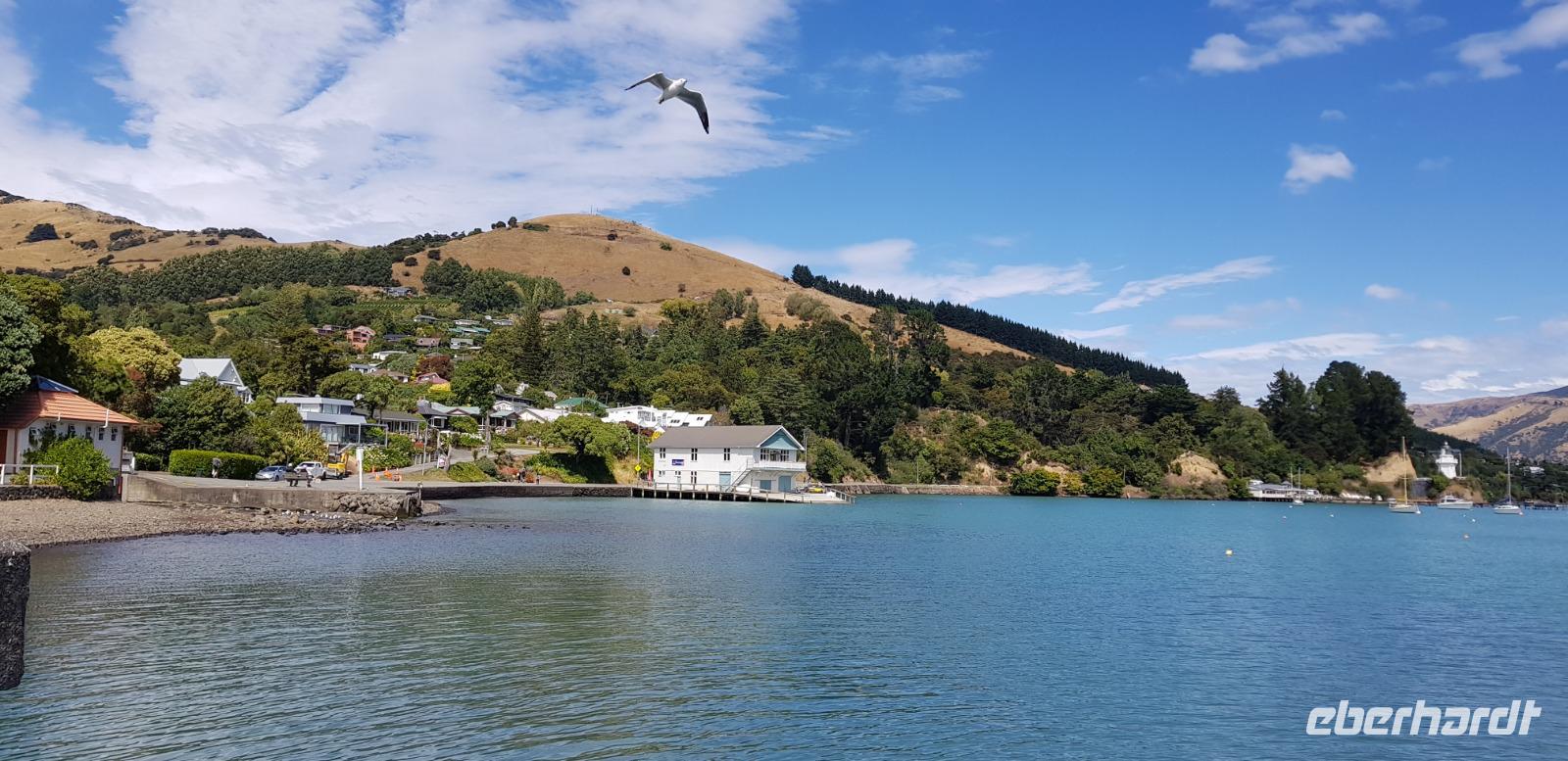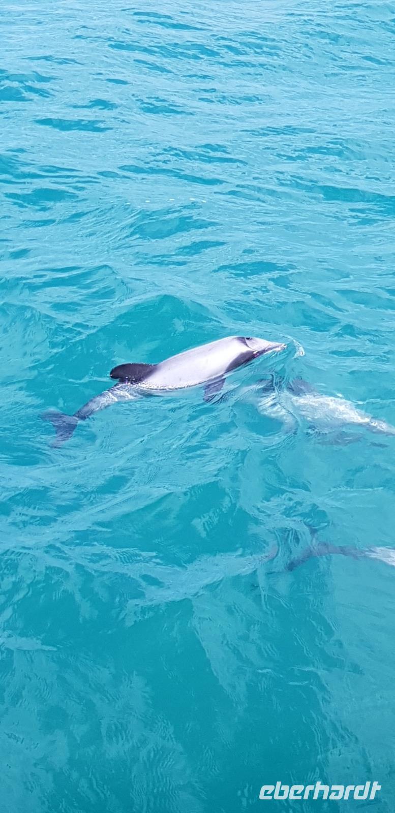 Angekommen an Land schlendern wir ein wenig durch den Ort, genießen ein gekühltes Getränk in der Sonne und unternehmen anschließend eine Bootsfahrt, um kleine Pinguine, Seelöwen und Delfine zu beobachten. Am Ausgang der Bucht werden wir für unser Warten auch entschädigt, denn dort bekommen wir den nur hier in Akaroa lebenden und ebenfalls leider vom Aussterben bedrohten Hector Delfin zu Gesicht. Gleich eine ganze Herde von 10 oder 15 Tieren spielt hier im Wasser und ist neugierig auf unser Boot. Ein tolles Erlebnis, von dem wir unseren Mitreisenden stolz berichten werden.