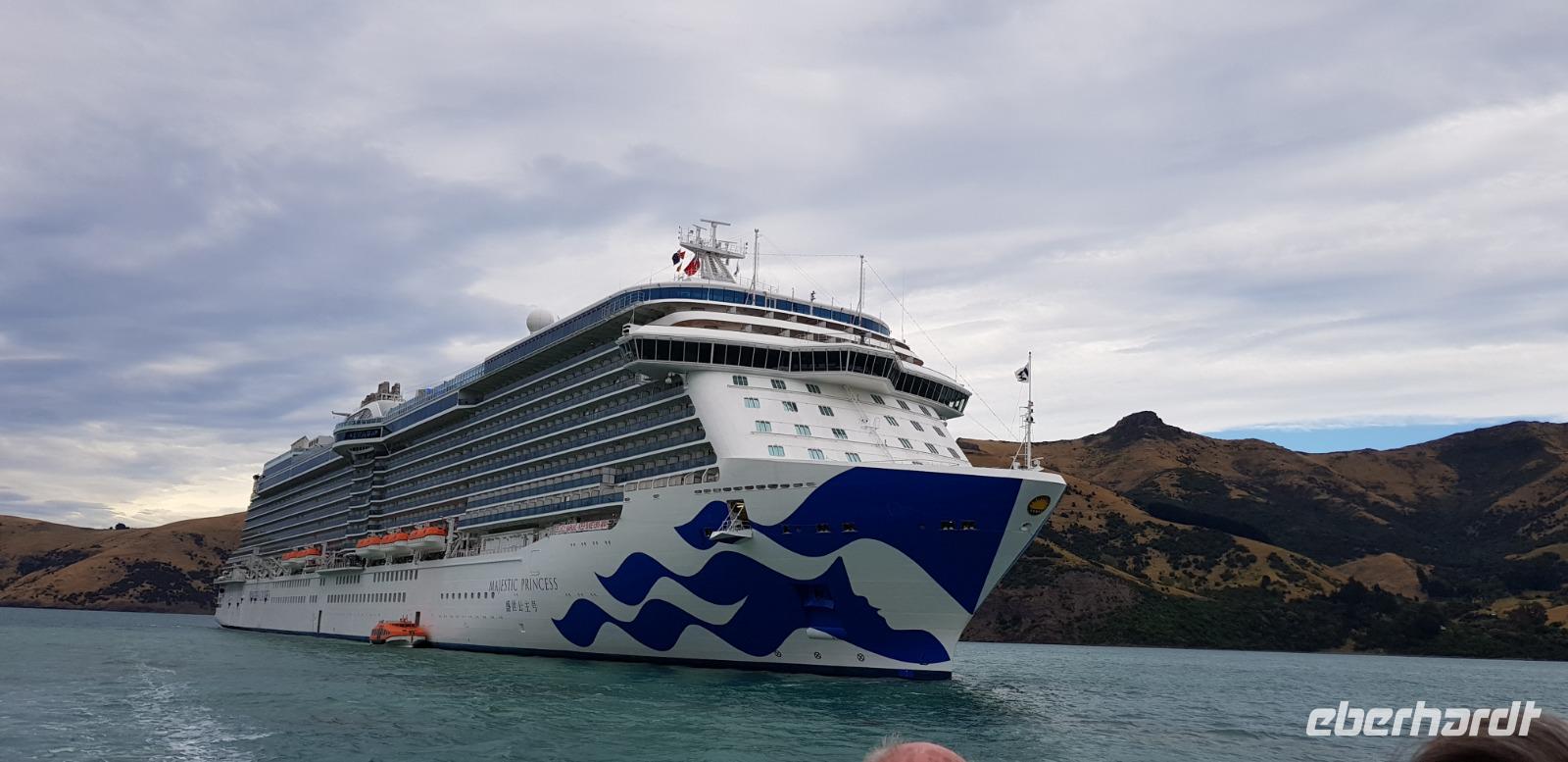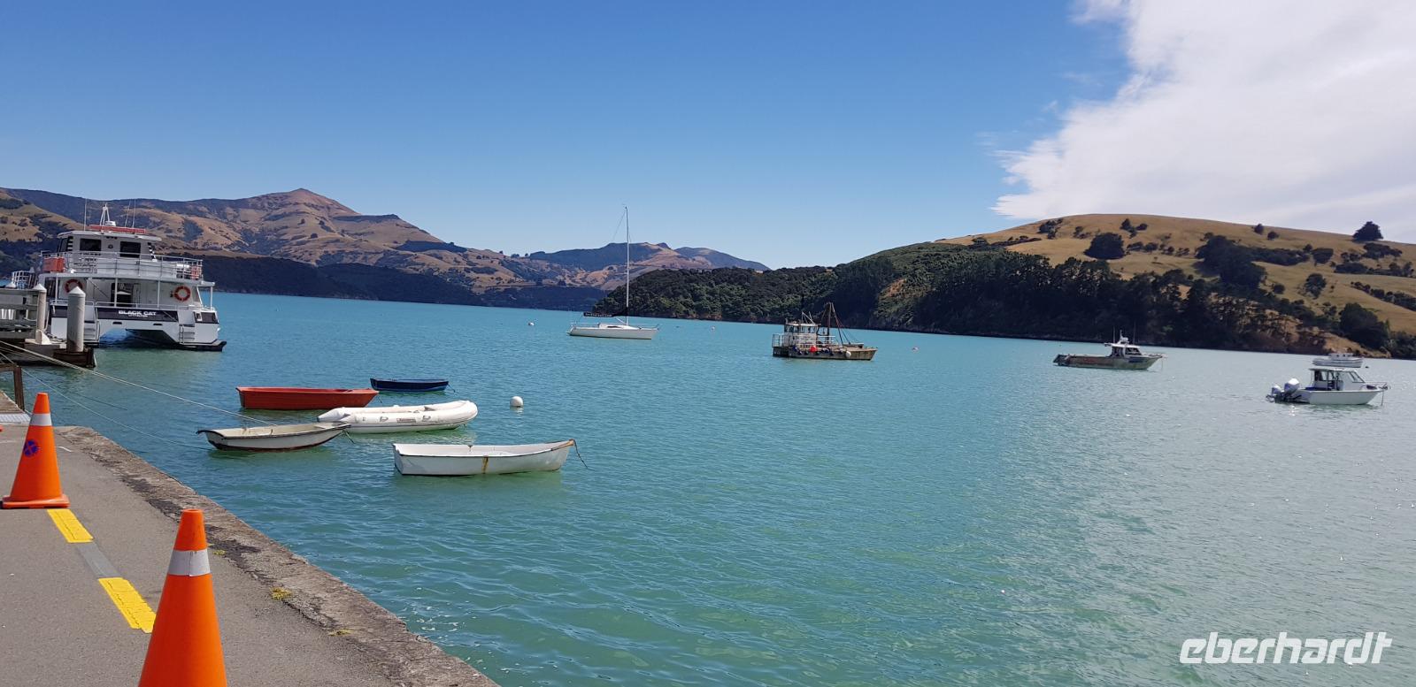 Im Tenderhafen von Akaroa gehen die Aktivitäten etwas auseinander. Einige Gäste haben sich für einen Ausflug der Reederei entschieden oder unternehmen ganz individuelle Landgänge. Ein Teil der Gruppe trifft sich am Vormittag, um gemeinsam den Hafen von Akaroa zu erkunden. Zunächst müssen wir uns ein Tenderticket besorgen und auf eines der Boote warten, die uns an Land bringen, denn unser Schiff ist zu groß, um an der Pier des nur ca. 700 Einwohner zählenden Ortes anzulegen.
