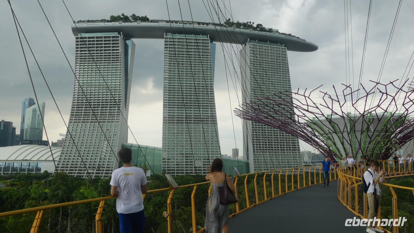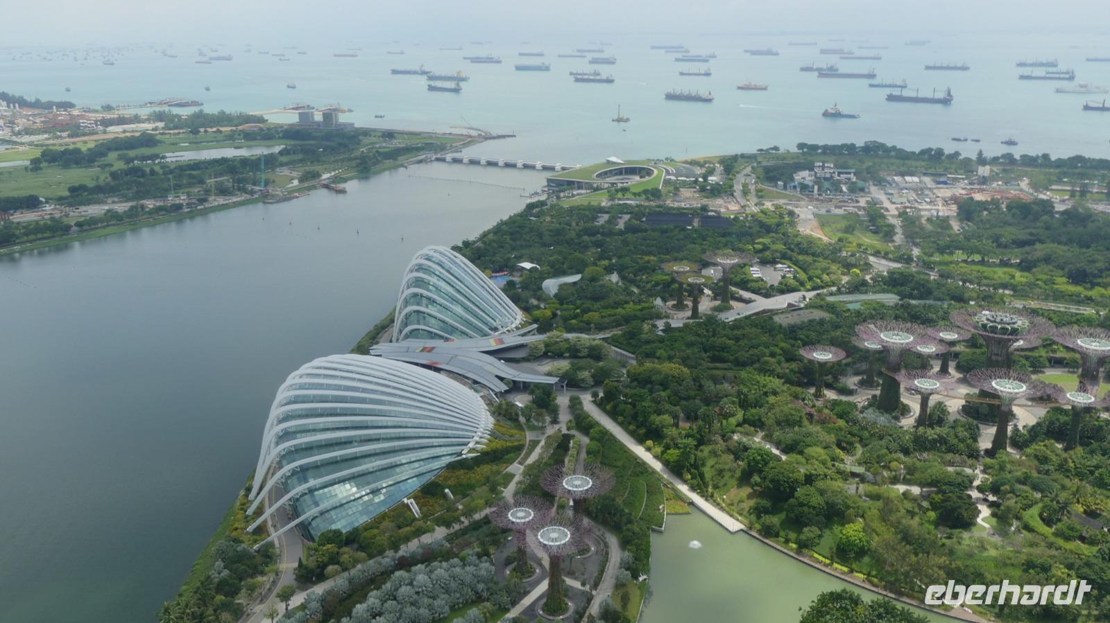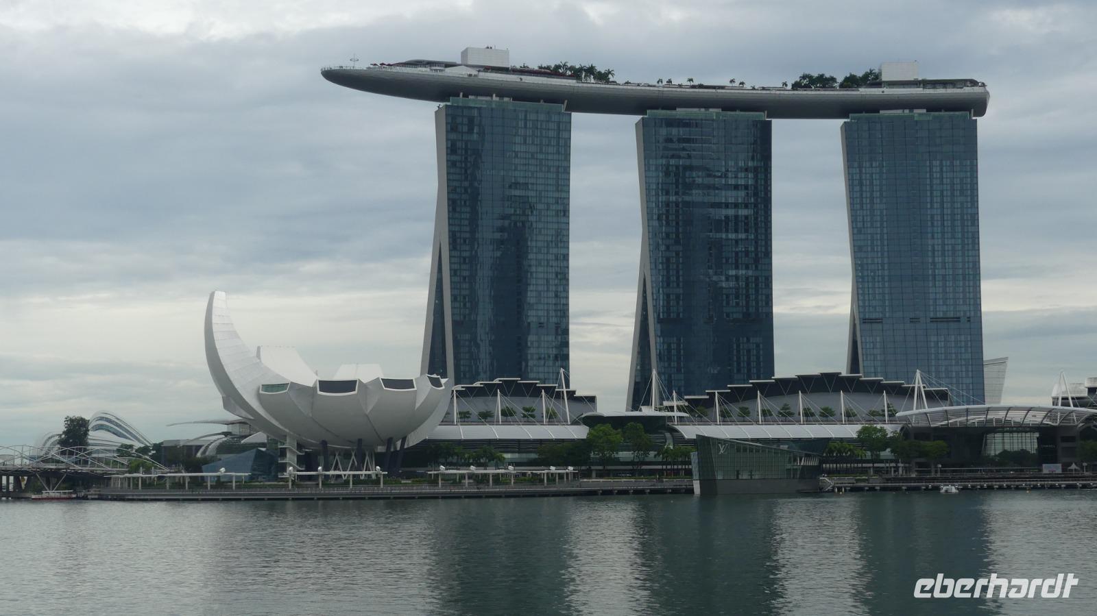 Während der Fahrt zum Hotel bekommen wir einen ersten Eindruck von Singapur, einer grünen Stadt mit riesigen Alleebäumen, den Raintrees. Kurz frisch gemacht und umgezogen, dann begeben wir uns mit Taxen zu einem der Wahrzeichen, dem Marina Bay Sands Hotel, hier nur als Kasino bezeichnet. Das Dach mit Infinity Pool in 200 Meter Höhe wird gern mit einem Bügelbrett, Skateboard auf drei Pfeilern oder mit einem Schiff verglichen. Als Erstes gehen wir zum Skypark, der Aussichtsplattform auf dem „Bügeleisen". Das Wetter passt (noch), die Sonne strahlt und die Sicht von hier oben ist ganz gut. Um die Ecke können wir den Infinity Pool erblicken, der den Hotelgästen vorbehalten ist. Weiterhin sehen wir die Wolkenkratzer des Bankenviertels, den Singapore Flyer (Riesenrad) und unser nächstes Ziel, Gardens by the Bay, eine tropische Parkanlage mit den Superbäumen. Einige von uns nehmen den „Baumwipfelpfad" (Skyway), den Weg oben entlang an den Kronen der Superbäume. Dies ist der Moment, an dem dann das Wetter rasant umschlägt. Ein heftiger tropischer Regen zwingt uns zu einer Pause an einer Unterstellmöglichkeit. Aber nach einer halben Stunde ist es vorbei und damit haben wir heute Glück, denn die Tage vorher hat es hier häufiger geregnet.