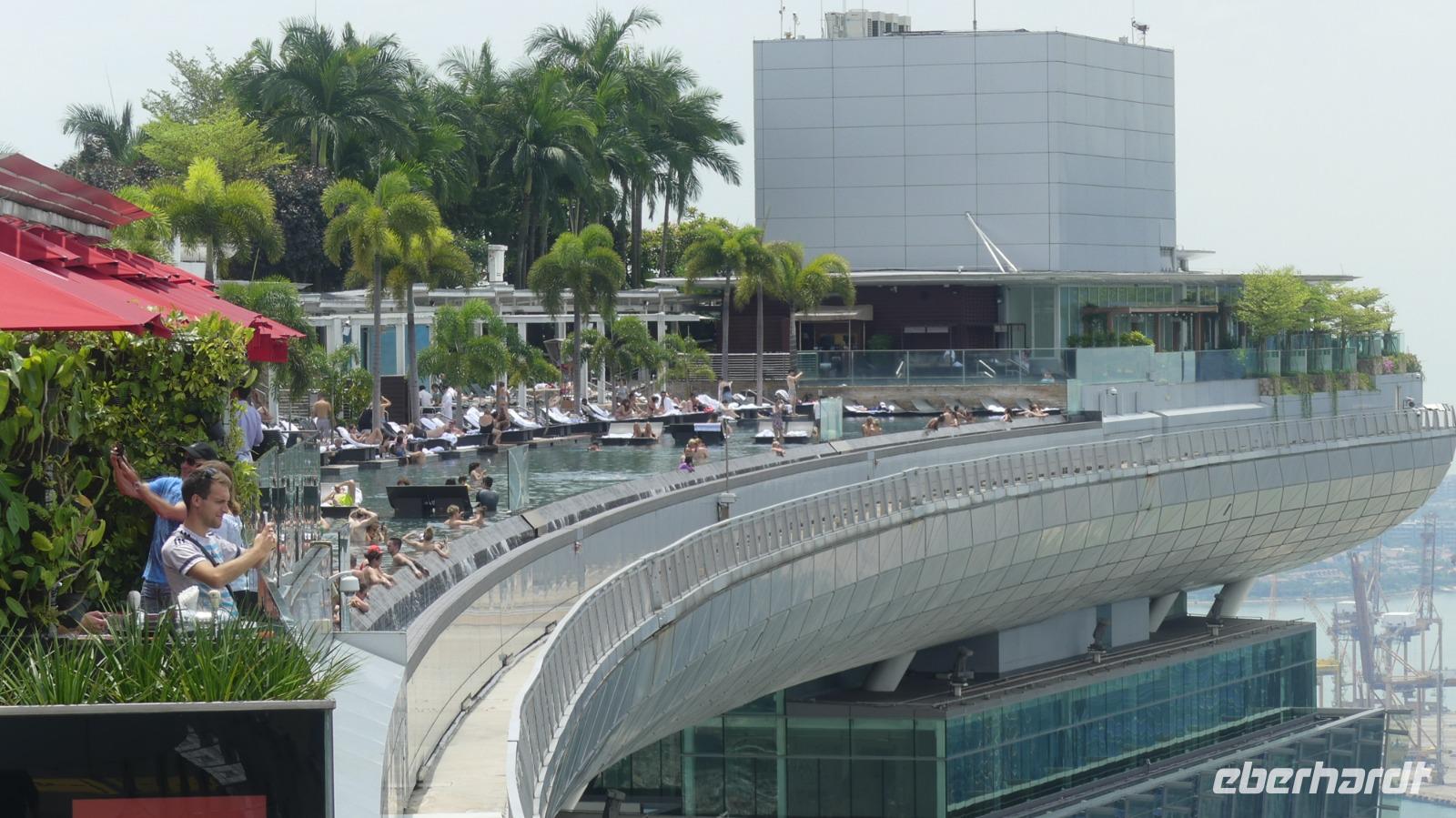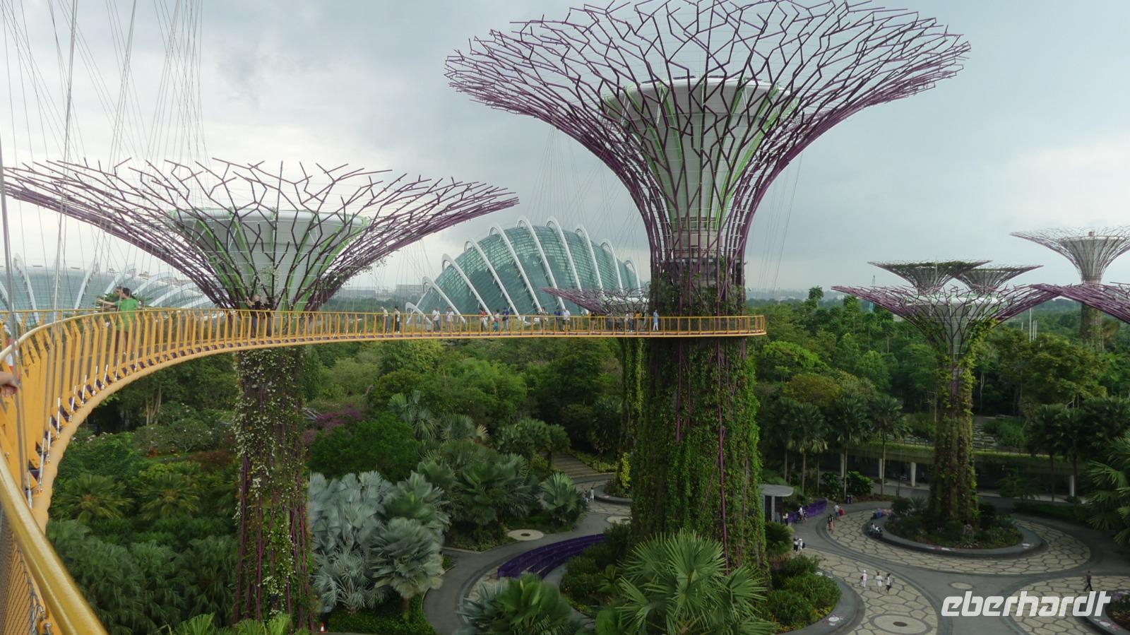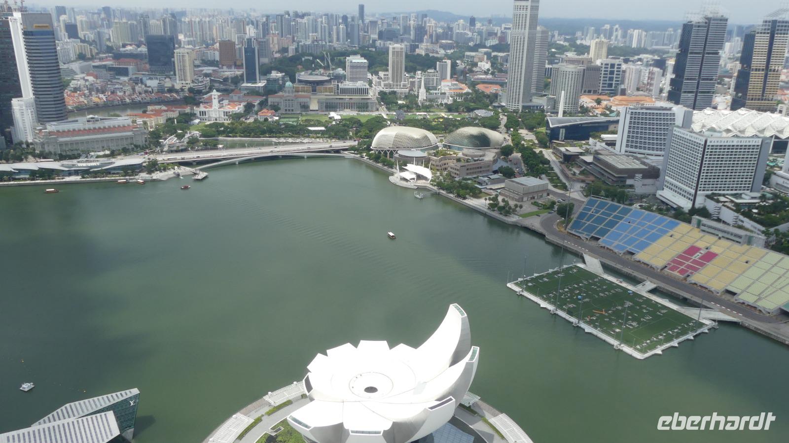 Während der Fahrt zum Hotel bekommen wir einen ersten Eindruck von Singapur, einer grünen Stadt mit riesigen Alleebäumen, den Raintrees. Kurz frisch gemacht und umgezogen, dann begeben wir uns mit Taxen zu einem der Wahrzeichen, dem Marina Bay Sands Hotel, hier nur als Kasino bezeichnet. Das Dach mit Infinity Pool in 200 Meter Höhe wird gern mit einem Bügelbrett, Skateboard auf drei Pfeilern oder mit einem Schiff verglichen. Als Erstes gehen wir zum Skypark, der Aussichtsplattform auf dem „Bügeleisen". Das Wetter passt (noch), die Sonne strahlt und die Sicht von hier oben ist ganz gut. Um die Ecke können wir den Infinity Pool erblicken, der den Hotelgästen vorbehalten ist. Weiterhin sehen wir die Wolkenkratzer des Bankenviertels, den Singapore Flyer (Riesenrad) und unser nächstes Ziel, Gardens by the Bay, eine tropische Parkanlage mit den Superbäumen. Einige von uns nehmen den „Baumwipfelpfad" (Skyway), den Weg oben entlang an den Kronen der Superbäume. Dies ist der Moment, an dem dann das Wetter rasant umschlägt. Ein heftiger tropischer Regen zwingt uns zu einer Pause an einer Unterstellmöglichkeit. Aber nach einer halben Stunde ist es vorbei und damit haben wir heute Glück, denn die Tage vorher hat es hier häufiger geregnet.